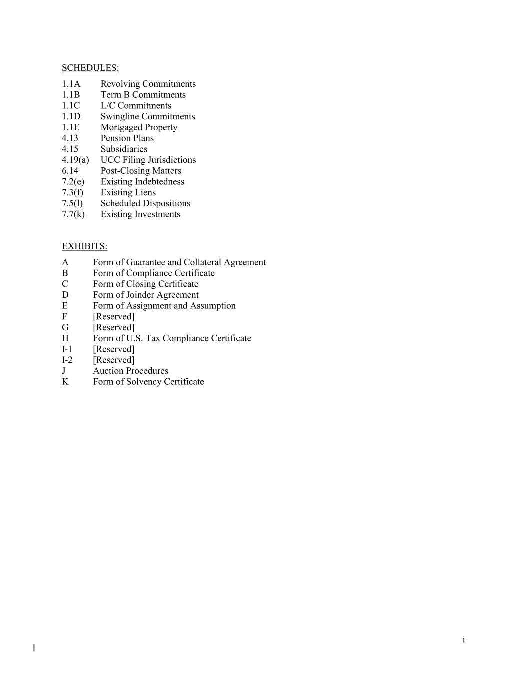 SCHEDULES: 1.1A Revolving Commitments 1.1B Term B Commitments 1.1C L/C Commitments 1.1D Swingline Commitments 1.1E Mortgaged Property 4.13 Pension Plans 4.15 Subsidiaries 4.19(a) UCC Filing Jurisdictions 6.14 Post-Closing Matters 7.2(e) Existing Indebtedness 7.3(f) Existing Liens 7.5(l) Scheduled Dispositions 7.7(k) Existing Investments EXHIBITS: A Form of Guarantee and Collateral Agreement B Form of Compliance Certificate C Form of Closing Certificate D Form of Joinder Agreement E Form of Assignment and Assumption F [Reserved] G [Reserved] H Form of U.S. Tax Compliance Certificate I-1 [Reserved] I-2 [Reserved] J Auction Procedures K Form of Solvency Certificate i