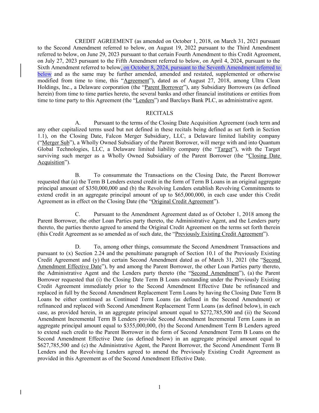 CREDIT AGREEMENT (as amended on October 1, 2018, on March 31, 2021 pursuant to the Second Amendment referred to below, on August 19, 2022 pursuant to the Third Amendment referred to below, on June 29, 2023 pursuant to that certain Fourth Amendment to this Credit Agreement, on July 27, 2023 pursuant to the Fifth Amendment referred to below, on April 4, 2024, pursuant to the Sixth Amendment referred to below, on October 8, 2024, pursuant to the Seventh Amendment referred to below and as the same may be further amended, amended and restated, supplemented or otherwise modified from time to time, this “Agreement”), dated as of August 27, 2018, among Ultra Clean Holdings, Inc., a Delaware corporation (the “Parent Borrower”), any Subsidiary Borrowers (as defined herein) from time to time parties hereto, the several banks and other financial institutions or entities from time to time party to this Agreement (the “Lenders”) and Barclays Bank PLC, as administrative agent. RECITALS A. Pursuant to the terms of the Closing Date Acquisition Agreement (such term and any other capitalized terms used but not defined in these recitals being defined as set forth in Section 1.1), on the Closing Date, Falcon Merger Subsidiary, LLC, a Delaware limited liability company (“Merger Sub”), a Wholly Owned Subsidiary of the Parent Borrower, will merge with and into Quantum Global Technologies, LLC, a Delaware limited liability company (the “Target”), with the Target surviving such merger as a Wholly Owned Subsidiary of the Parent Borrower (the “Closing Date Acquisition”). B. To consummate the Transactions on the Closing Date, the Parent Borrower requested that (a) the Term B Lenders extend credit in the form of Term B Loans in an original aggregate principal amount of $350,000,000 and (b) the Revolving Lenders establish Revolving Commitments to extend credit in an aggregate principal amount of up to $65,000,000, in each case under this Credit Agreement as in effect on the Closing Date (the “Original Credit Agreement”). C. Pursuant to the Amendment Agreement dated as of October 1, 2018 among the Parent Borrower, the other Loan Parties party thereto, the Administrative Agent, and the Lenders party thereto, the parties thereto agreed to amend the Original Credit Agreement on the terms set forth therein (this Credit Agreement as so amended as of such date, the “Previously Existing Credit Agreement”). D. To, among other things, consummate the Second Amendment Transactions and pursuant to (x) Section 2.24 and the penultimate paragraph of Section 10.1 of the Previously Existing Credit Agreement and (y) that certain Second Amendment dated as of March 31, 2021 (the “Second Amendment Effective Date”), by and among the Parent Borrower, the other Loan Parties party thereto, the Administrative Agent and the Lenders party thereto (the “Second Amendment”), (a) the Parent Borrower requested that (i) the Closing Date Term B Loans outstanding under the Previously Existing Credit Agreement immediately prior to the Second Amendment Effective Date be refinanced and replaced in full by the Second Amendment Replacement Term Loans by having the Closing Date Term B Loans be either continued as Continued Term Loans (as defined in the Second Amendment) or refinanced and replaced with Second Amendment Replacement Term Loans (as defined below), in each case, as provided herein, in an aggregate principal amount equal to $272,785,500 and (ii) the Second Amendment Incremental Term B Lenders provide Second Amendment Incremental Term Loans in an aggregate principal amount equal to $355,000,000, (b) the Second Amendment Term B Lenders agreed to extend such credit to the Parent Borrower in the form of Second Amendment Term B Loans on the Second Amendment Effective Date (as defined below) in an aggregate principal amount equal to $627,785,500 and (c) the Administrative Agent, the Parent Borrower, the Second Amendment Term B Lenders and the Revolving Lenders agreed to amend the Previously Existing Credit Agreement as provided in this Agreement as of the Second Amendment Effective Date. 1