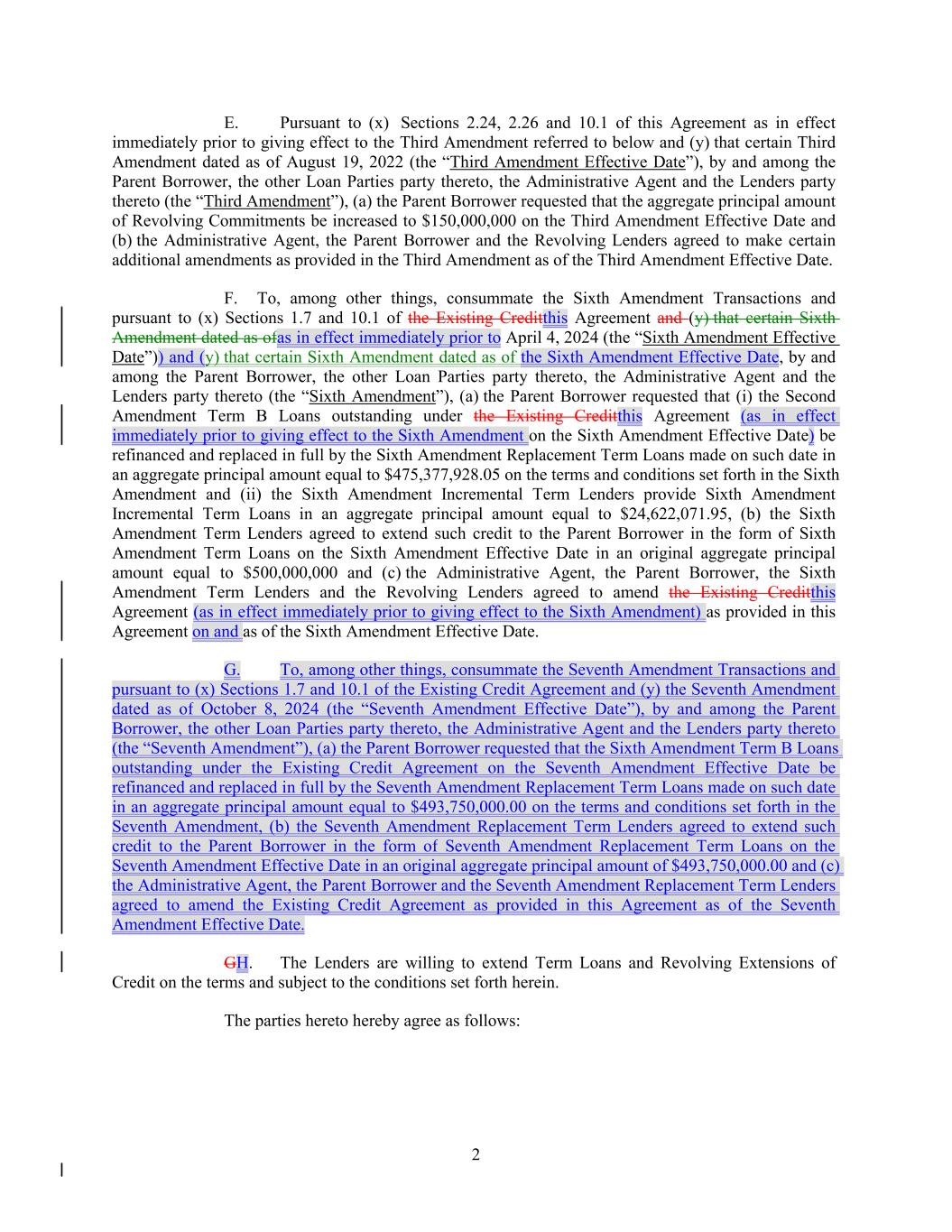E. Pursuant to (x) Sections 2.24, 2.26 and 10.1 of this Agreement as in effect immediately prior to giving effect to the Third Amendment referred to below and (y) that certain Third Amendment dated as of August 19, 2022 (the “Third Amendment Effective Date”), by and among the Parent Borrower, the other Loan Parties party thereto, the Administrative Agent and the Lenders party thereto (the “Third Amendment”), (a) the Parent Borrower requested that the aggregate principal amount of Revolving Commitments be increased to $150,000,000 on the Third Amendment Effective Date and (b) the Administrative Agent, the Parent Borrower and the Revolving Lenders agreed to make certain additional amendments as provided in the Third Amendment as of the Third Amendment Effective Date. F. To, among other things, consummate the Sixth Amendment Transactions and pursuant to (x) Sections 1.7 and 10.1 of the Existing Creditthis Agreement and (y) that certain Sixth Amendment dated as ofas in effect immediately prior to April 4, 2024 (the “Sixth Amendment Effective Date”)) and (y) that certain Sixth Amendment dated as of the Sixth Amendment Effective Date, by and among the Parent Borrower, the other Loan Parties party thereto, the Administrative Agent and the Lenders party thereto (the “Sixth Amendment”), (a) the Parent Borrower requested that (i) the Second Amendment Term B Loans outstanding under the Existing Creditthis Agreement (as in effect immediately prior to giving effect to the Sixth Amendment on the Sixth Amendment Effective Date) be refinanced and replaced in full by the Sixth Amendment Replacement Term Loans made on such date in an aggregate principal amount equal to $475,377,928.05 on the terms and conditions set forth in the Sixth Amendment and (ii) the Sixth Amendment Incremental Term Lenders provide Sixth Amendment Incremental Term Loans in an aggregate principal amount equal to $24,622,071.95, (b) the Sixth Amendment Term Lenders agreed to extend such credit to the Parent Borrower in the form of Sixth Amendment Term Loans on the Sixth Amendment Effective Date in an original aggregate principal amount equal to $500,000,000 and (c) the Administrative Agent, the Parent Borrower, the Sixth Amendment Term Lenders and the Revolving Lenders agreed to amend the Existing Creditthis Agreement (as in effect immediately prior to giving effect to the Sixth Amendment) as provided in this Agreement on and as of the Sixth Amendment Effective Date. G. To, among other things, consummate the Seventh Amendment Transactions and pursuant to (x) Sections 1.7 and 10.1 of the Existing Credit Agreement and (y) the Seventh Amendment dated as of October 8, 2024 (the “Seventh Amendment Effective Date”), by and among the Parent Borrower, the other Loan Parties party thereto, the Administrative Agent and the Lenders party thereto (the “Seventh Amendment”), (a) the Parent Borrower requested that the Sixth Amendment Term B Loans outstanding under the Existing Credit Agreement on the Seventh Amendment Effective Date be refinanced and replaced in full by the Seventh Amendment Replacement Term Loans made on such date in an aggregate principal amount equal to $493,750,000.00 on the terms and conditions set forth in the Seventh Amendment, (b) the Seventh Amendment Replacement Term Lenders agreed to extend such credit to the Parent Borrower in the form of Seventh Amendment Replacement Term Loans on the Seventh Amendment Effective Date in an original aggregate principal amount of $493,750,000.00 and (c) the Administrative Agent, the Parent Borrower and the Seventh Amendment Replacement Term Lenders agreed to amend the Existing Credit Agreement as provided in this Agreement as of the Seventh Amendment Effective Date. GH. The Lenders are willing to extend Term Loans and Revolving Extensions of Credit on the terms and subject to the conditions set forth herein. The parties hereto hereby agree as follows: 2