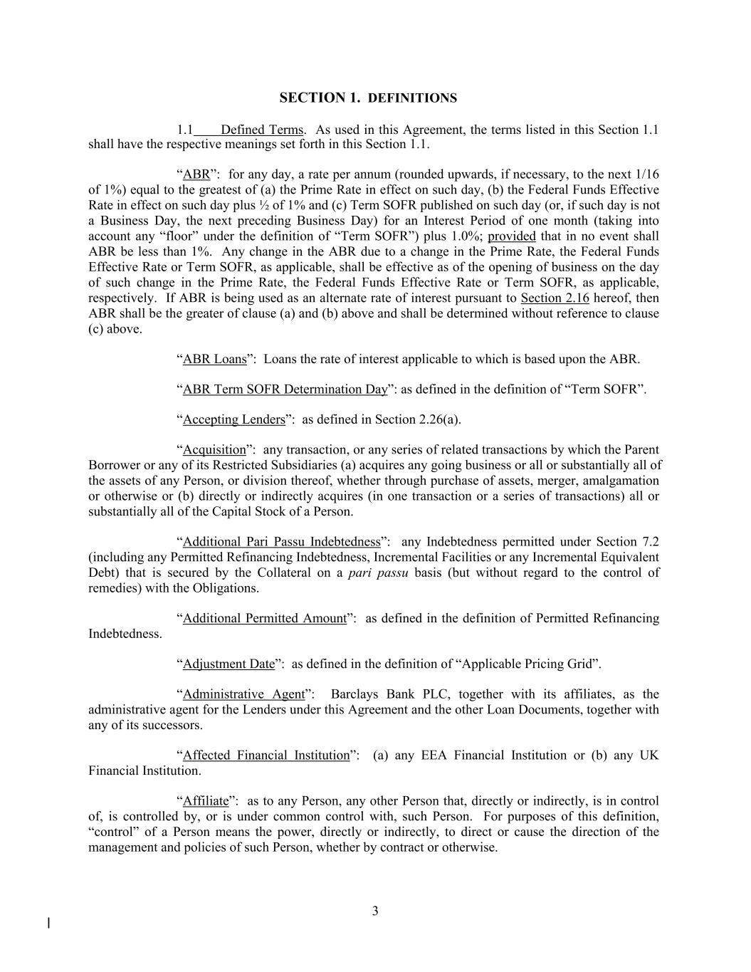 SECTION 1. DEFINITIONS 1.1 Defined Terms. As used in this Agreement, the terms listed in this Section 1.1 shall have the respective meanings set forth in this Section 1.1. “ABR”: for any day, a rate per annum (rounded upwards, if necessary, to the next 1/16 of 1%) equal to the greatest of (a) the Prime Rate in effect on such day, (b) the Federal Funds Effective Rate in effect on such day plus ½ of 1% and (c) Term SOFR published on such day (or, if such day is not a Business Day, the next preceding Business Day) for an Interest Period of one month (taking into account any “floor” under the definition of “Term SOFR”) plus 1.0%; provided that in no event shall ABR be less than 1%. Any change in the ABR due to a change in the Prime Rate, the Federal Funds Effective Rate or Term SOFR, as applicable, shall be effective as of the opening of business on the day of such change in the Prime Rate, the Federal Funds Effective Rate or Term SOFR, as applicable, respectively. If ABR is being used as an alternate rate of interest pursuant to Section 2.16 hereof, then ABR shall be the greater of clause (a) and (b) above and shall be determined without reference to clause (c) above. “ABR Loans”: Loans the rate of interest applicable to which is based upon the ABR. “ABR Term SOFR Determination Day”: as defined in the definition of “Term SOFR”. “Accepting Lenders”: as defined in Section 2.26(a). “Acquisition”: any transaction, or any series of related transactions by which the Parent Borrower or any of its Restricted Subsidiaries (a) acquires any going business or all or substantially all of the assets of any Person, or division thereof, whether through purchase of assets, merger, amalgamation or otherwise or (b) directly or indirectly acquires (in one transaction or a series of transactions) all or substantially all of the Capital Stock of a Person. “Additional Pari Passu Indebtedness”: any Indebtedness permitted under Section 7.2 (including any Permitted Refinancing Indebtedness, Incremental Facilities or any Incremental Equivalent Debt) that is secured by the Collateral on a pari passu basis (but without regard to the control of remedies) with the Obligations. “Additional Permitted Amount”: as defined in the definition of Permitted Refinancing Indebtedness. “Adjustment Date”: as defined in the definition of “Applicable Pricing Grid”. “Administrative Agent”: Barclays Bank PLC, together with its affiliates, as the administrative agent for the Lenders under this Agreement and the other Loan Documents, together with any of its successors. “Affected Financial Institution”: (a) any EEA Financial Institution or (b) any UK Financial Institution. “Affiliate”: as to any Person, any other Person that, directly or indirectly, is in control of, is controlled by, or is under common control with, such Person. For purposes of this definition, “control” of a Person means the power, directly or indirectly, to direct or cause the direction of the management and policies of such Person, whether by contract or otherwise. 3