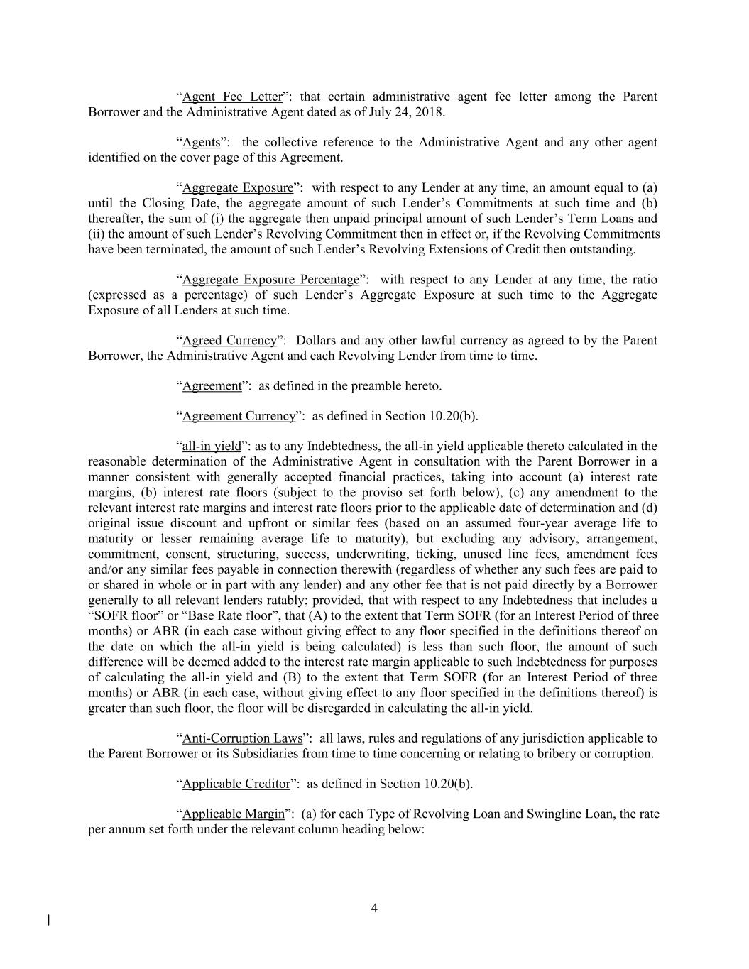 “Agent Fee Letter”: that certain administrative agent fee letter among the Parent Borrower and the Administrative Agent dated as of July 24, 2018. “Agents”: the collective reference to the Administrative Agent and any other agent identified on the cover page of this Agreement. “Aggregate Exposure”: with respect to any Lender at any time, an amount equal to (a) until the Closing Date, the aggregate amount of such Lender’s Commitments at such time and (b) thereafter, the sum of (i) the aggregate then unpaid principal amount of such Lender’s Term Loans and (ii) the amount of such Lender’s Revolving Commitment then in effect or, if the Revolving Commitments have been terminated, the amount of such Lender’s Revolving Extensions of Credit then outstanding. “Aggregate Exposure Percentage”: with respect to any Lender at any time, the ratio (expressed as a percentage) of such Lender’s Aggregate Exposure at such time to the Aggregate Exposure of all Lenders at such time. “Agreed Currency”: Dollars and any other lawful currency as agreed to by the Parent Borrower, the Administrative Agent and each Revolving Lender from time to time. “Agreement”: as defined in the preamble hereto. “Agreement Currency”: as defined in Section 10.20(b). “all-in yield”: as to any Indebtedness, the all-in yield applicable thereto calculated in the reasonable determination of the Administrative Agent in consultation with the Parent Borrower in a manner consistent with generally accepted financial practices, taking into account (a) interest rate margins, (b) interest rate floors (subject to the proviso set forth below), (c) any amendment to the relevant interest rate margins and interest rate floors prior to the applicable date of determination and (d) original issue discount and upfront or similar fees (based on an assumed four-year average life to maturity or lesser remaining average life to maturity), but excluding any advisory, arrangement, commitment, consent, structuring, success, underwriting, ticking, unused line fees, amendment fees and/or any similar fees payable in connection therewith (regardless of whether any such fees are paid to or shared in whole or in part with any lender) and any other fee that is not paid directly by a Borrower generally to all relevant lenders ratably; provided, that with respect to any Indebtedness that includes a “SOFR floor” or “Base Rate floor”, that (A) to the extent that Term SOFR (for an Interest Period of three months) or ABR (in each case without giving effect to any floor specified in the definitions thereof on the date on which the all-in yield is being calculated) is less than such floor, the amount of such difference will be deemed added to the interest rate margin applicable to such Indebtedness for purposes of calculating the all-in yield and (B) to the extent that Term SOFR (for an Interest Period of three months) or ABR (in each case, without giving effect to any floor specified in the definitions thereof) is greater than such floor, the floor will be disregarded in calculating the all-in yield. “Anti-Corruption Laws”: all laws, rules and regulations of any jurisdiction applicable to the Parent Borrower or its Subsidiaries from time to time concerning or relating to bribery or corruption. “Applicable Creditor”: as defined in Section 10.20(b). “Applicable Margin”: (a) for each Type of Revolving Loan and Swingline Loan, the rate per annum set forth under the relevant column heading below: 4