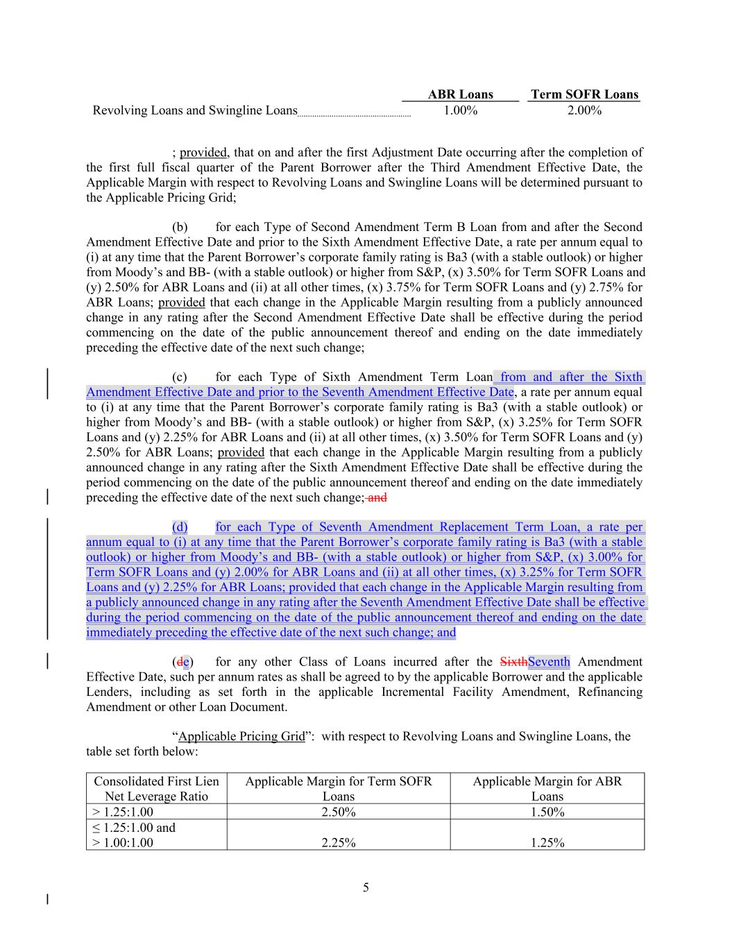 5 Consolidated First Lien Net Leverage Ratio Applicable Margin for Term SOFR Loans Applicable Margin for ABR Loans Revolving Loans and Swingline Loans > 1.25:1.00 2.50% 1.00% 1.50% ABR Loans 2.00% ≤ 1.25:1.00 and > 1.00:1.00 2.25% ; provided, that on and after the first Adjustment Date occurring after the completion of the first full fiscal quarter of the Parent Borrower after the Third Amendment Effective Date, the Applicable Margin with respect to Revolving Loans and Swingline Loans will be determined pursuant to the Applicable Pricing Grid; (b) for each Type of Second Amendment Term B Loan from and after the Second Amendment Effective Date and prior to the Sixth Amendment Effective Date, a rate per annum equal to (i) at any time that the Parent Borrower’s corporate family rating is Ba3 (with a stable outlook) or higher from Moody’s and BB- (with a stable outlook) or higher from S&P, (x) 3.50% for Term SOFR Loans and (y) 2.50% for ABR Loans and (ii) at all other times, (x) 3.75% for Term SOFR Loans and (y) 2.75% for ABR Loans; provided that each change in the Applicable Margin resulting from a publicly announced change in any rating after the Second Amendment Effective Date shall be effective during the period commencing on the date of the public announcement thereof and ending on the date immediately preceding the effective date of the next such change; (c) for each Type of Sixth Amendment Term Loan from and after the Sixth Amendment Effective Date and prior to the Seventh Amendment Effective Date, a rate per annum equal to (i) at any time that the Parent Borrower’s corporate family rating is Ba3 (with a stable outlook) or higher from Moody’s and BB- (with a stable outlook) or higher from S&P, (x) 3.25% for Term SOFR Loans and (y) 2.25% for ABR Loans and (ii) at all other times, (x) 3.50% for Term SOFR Loans and (y) 2.50% for ABR Loans; provided that each change in the Applicable Margin resulting from a publicly announced change in any rating after the Sixth Amendment Effective Date shall be effective during the period commencing on the date of the public announcement thereof and ending on the date immediately preceding the effective date of the next such change; and (d) for each Type of Seventh Amendment Replacement Term Loan, a rate per annum equal to (i) at any time that the Parent Borrower’s corporate family rating is Ba3 (with a stable outlook) or higher from Moody’s and BB- (with a stable outlook) or higher from S&P, (x) 3.00% for Term SOFR Loans and (y) 2.00% for ABR Loans and (ii) at all other times, (x) 3.25% for Term SOFR Loans and (y) 2.25% for ABR Loans; provided that each change in the Applicable Margin resulting from a publicly announced change in any rating after the Seventh Amendment Effective Date shall be effective during the period commencing on the date of the public announcement thereof and ending on the date immediately preceding the effective date of the next such change; and (de) for any other Class of Loans incurred after the SixthSeventh Amendment Effective Date, such per annum rates as shall be agreed to by the applicable Borrower and the applicable Lenders, including as set forth in the applicable Incremental Facility Amendment, Refinancing Amendment or other Loan Document. “Applicable Pricing Grid”: with respect to Revolving Loans and Swingline Loans, the table set forth below: 1.25% Term SOFR Loans