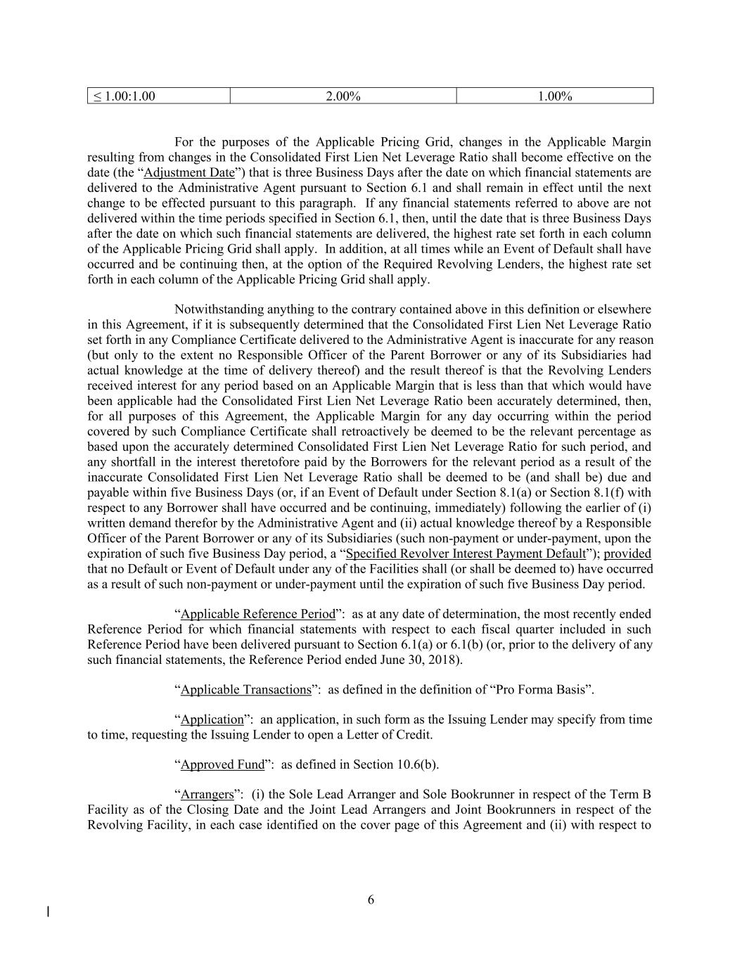 6 2.00% 1.00% For the purposes of the Applicable Pricing Grid, changes in the Applicable Margin resulting from changes in the Consolidated First Lien Net Leverage Ratio shall become effective on the date (the “Adjustment Date”) that is three Business Days after the date on which financial statements are delivered to the Administrative Agent pursuant to Section 6.1 and shall remain in effect until the next change to be effected pursuant to this paragraph. If any financial statements referred to above are not delivered within the time periods specified in Section 6.1, then, until the date that is three Business Days after the date on which such financial statements are delivered, the highest rate set forth in each column of the Applicable Pricing Grid shall apply. In addition, at all times while an Event of Default shall have occurred and be continuing then, at the option of the Required Revolving Lenders, the highest rate set forth in each column of the Applicable Pricing Grid shall apply. Notwithstanding anything to the contrary contained above in this definition or elsewhere in this Agreement, if it is subsequently determined that the Consolidated First Lien Net Leverage Ratio set forth in any Compliance Certificate delivered to the Administrative Agent is inaccurate for any reason (but only to the extent no Responsible Officer of the Parent Borrower or any of its Subsidiaries had actual knowledge at the time of delivery thereof) and the result thereof is that the Revolving Lenders received interest for any period based on an Applicable Margin that is less than that which would have been applicable had the Consolidated First Lien Net Leverage Ratio been accurately determined, then, for all purposes of this Agreement, the Applicable Margin for any day occurring within the period covered by such Compliance Certificate shall retroactively be deemed to be the relevant percentage as based upon the accurately determined Consolidated First Lien Net Leverage Ratio for such period, and any shortfall in the interest theretofore paid by the Borrowers for the relevant period as a result of the inaccurate Consolidated First Lien Net Leverage Ratio shall be deemed to be (and shall be) due and payable within five Business Days (or, if an Event of Default under Section 8.1(a) or Section 8.1(f) with respect to any Borrower shall have occurred and be continuing, immediately) following the earlier of (i) written demand therefor by the Administrative Agent and (ii) actual knowledge thereof by a Responsible Officer of the Parent Borrower or any of its Subsidiaries (such non-payment or under-payment, upon the expiration of such five Business Day period, a “Specified Revolver Interest Payment Default”); provided that no Default or Event of Default under any of the Facilities shall (or shall be deemed to) have occurred as a result of such non-payment or under-payment until the expiration of such five Business Day period. “Applicable Reference Period”: as at any date of determination, the most recently ended Reference Period for which financial statements with respect to each fiscal quarter included in such Reference Period have been delivered pursuant to Section 6.1(a) or 6.1(b) (or, prior to the delivery of any such financial statements, the Reference Period ended June 30, 2018). “Applicable Transactions”: as defined in the definition of “Pro Forma Basis”. “Application”: an application, in such form as the Issuing Lender may specify from time to time, requesting the Issuing Lender to open a Letter of Credit. “Approved Fund”: as defined in Section 10.6(b). “Arrangers”: (i) the Sole Lead Arranger and Sole Bookrunner in respect of the Term B Facility as of the Closing Date and the Joint Lead Arrangers and Joint Bookrunners in respect of the Revolving Facility, in each case identified on the cover page of this Agreement and (ii) with respect to ≤ 1.00:1.00