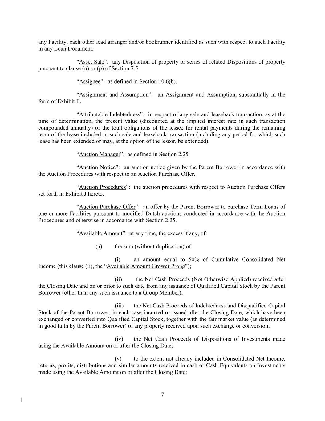 any Facility, each other lead arranger and/or bookrunner identified as such with respect to such Facility in any Loan Document. “Asset Sale”: any Disposition of property or series of related Dispositions of property pursuant to clause (n) or (p) of Section 7.5 “Assignee”: as defined in Section 10.6(b). “Assignment and Assumption”: an Assignment and Assumption, substantially in the form of Exhibit E. “Attributable Indebtedness”: in respect of any sale and leaseback transaction, as at the time of determination, the present value (discounted at the implied interest rate in such transaction compounded annually) of the total obligations of the lessee for rental payments during the remaining term of the lease included in such sale and leaseback transaction (including any period for which such lease has been extended or may, at the option of the lessor, be extended). “Auction Manager”: as defined in Section 2.25. “Auction Notice”: an auction notice given by the Parent Borrower in accordance with the Auction Procedures with respect to an Auction Purchase Offer. “Auction Procedures”: the auction procedures with respect to Auction Purchase Offers set forth in Exhibit J hereto. “Auction Purchase Offer”: an offer by the Parent Borrower to purchase Term Loans of one or more Facilities pursuant to modified Dutch auctions conducted in accordance with the Auction Procedures and otherwise in accordance with Section 2.25. “Available Amount”: at any time, the excess if any, of: (a) the sum (without duplication) of: (i) an amount equal to 50% of Cumulative Consolidated Net Income (this clause (ii), the “Available Amount Grower Prong”); (ii) the Net Cash Proceeds (Not Otherwise Applied) received after the Closing Date and on or prior to such date from any issuance of Qualified Capital Stock by the Parent Borrower (other than any such issuance to a Group Member); (iii) the Net Cash Proceeds of Indebtedness and Disqualified Capital Stock of the Parent Borrower, in each case incurred or issued after the Closing Date, which have been exchanged or converted into Qualified Capital Stock, together with the fair market value (as determined in good faith by the Parent Borrower) of any property received upon such exchange or conversion; (iv) the Net Cash Proceeds of Dispositions of Investments made using the Available Amount on or after the Closing Date; (v) to the extent not already included in Consolidated Net Income, returns, profits, distributions and similar amounts received in cash or Cash Equivalents on Investments made using the Available Amount on or after the Closing Date; 7