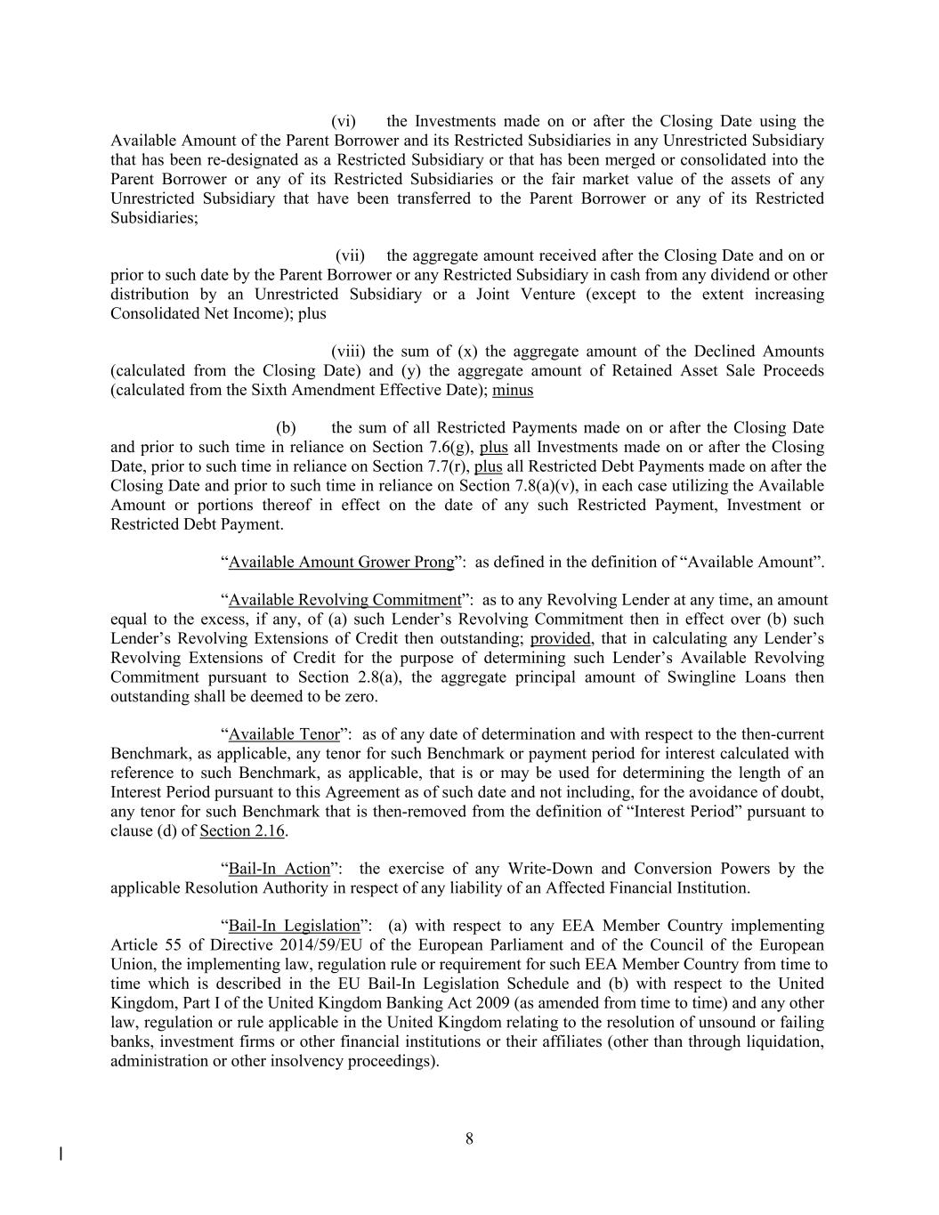 (vi) the Investments made on or after the Closing Date using the Available Amount of the Parent Borrower and its Restricted Subsidiaries in any Unrestricted Subsidiary that has been re-designated as a Restricted Subsidiary or that has been merged or consolidated into the Parent Borrower or any of its Restricted Subsidiaries or the fair market value of the assets of any Unrestricted Subsidiary that have been transferred to the Parent Borrower or any of its Restricted Subsidiaries; (vii) the aggregate amount received after the Closing Date and on or prior to such date by the Parent Borrower or any Restricted Subsidiary in cash from any dividend or other distribution by an Unrestricted Subsidiary or a Joint Venture (except to the extent increasing Consolidated Net Income); plus (viii) the sum of (x) the aggregate amount of the Declined Amounts (calculated from the Closing Date) and (y) the aggregate amount of Retained Asset Sale Proceeds (calculated from the Sixth Amendment Effective Date); minus (b) the sum of all Restricted Payments made on or after the Closing Date and prior to such time in reliance on Section 7.6(g), plus all Investments made on or after the Closing Date, prior to such time in reliance on Section 7.7(r), plus all Restricted Debt Payments made on after the Closing Date and prior to such time in reliance on Section 7.8(a)(v), in each case utilizing the Available Amount or portions thereof in effect on the date of any such Restricted Payment, Investment or Restricted Debt Payment. “Available Amount Grower Prong”: as defined in the definition of “Available Amount”. “Available Revolving Commitment”: as to any Revolving Lender at any time, an amount equal to the excess, if any, of (a) such Lender’s Revolving Commitment then in effect over (b) such Lender’s Revolving Extensions of Credit then outstanding; provided, that in calculating any Lender’s Revolving Extensions of Credit for the purpose of determining such Lender’s Available Revolving Commitment pursuant to Section 2.8(a), the aggregate principal amount of Swingline Loans then outstanding shall be deemed to be zero. “Available Tenor”: as of any date of determination and with respect to the then-current Benchmark, as applicable, any tenor for such Benchmark or payment period for interest calculated with reference to such Benchmark, as applicable, that is or may be used for determining the length of an Interest Period pursuant to this Agreement as of such date and not including, for the avoidance of doubt, any tenor for such Benchmark that is then-removed from the definition of “Interest Period” pursuant to clause (d) of Section 2.16. “Bail-In Action”: the exercise of any Write-Down and Conversion Powers by the applicable Resolution Authority in respect of any liability of an Affected Financial Institution. “Bail-In Legislation”: (a) with respect to any EEA Member Country implementing Article 55 of Directive 2014/59/EU of the European Parliament and of the Council of the European Union, the implementing law, regulation rule or requirement for such EEA Member Country from time to time which is described in the EU Bail-In Legislation Schedule and (b) with respect to the United Kingdom, Part I of the United Kingdom Banking Act 2009 (as amended from time to time) and any other law, regulation or rule applicable in the United Kingdom relating to the resolution of unsound or failing banks, investment firms or other financial institutions or their affiliates (other than through liquidation, administration or other insolvency proceedings). 8