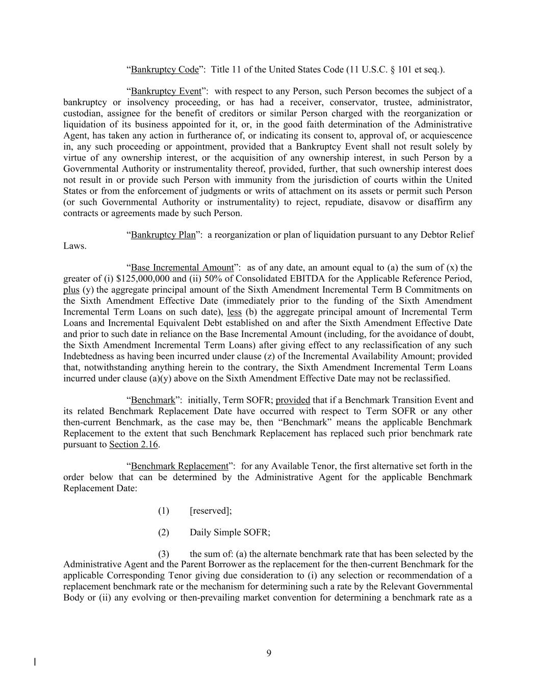 “Bankruptcy Code”: Title 11 of the United States Code (11 U.S.C. § 101 et seq.). “Bankruptcy Event”: with respect to any Person, such Person becomes the subject of a bankruptcy or insolvency proceeding, or has had a receiver, conservator, trustee, administrator, custodian, assignee for the benefit of creditors or similar Person charged with the reorganization or liquidation of its business appointed for it, or, in the good faith determination of the Administrative Agent, has taken any action in furtherance of, or indicating its consent to, approval of, or acquiescence in, any such proceeding or appointment, provided that a Bankruptcy Event shall not result solely by virtue of any ownership interest, or the acquisition of any ownership interest, in such Person by a Governmental Authority or instrumentality thereof, provided, further, that such ownership interest does not result in or provide such Person with immunity from the jurisdiction of courts within the United States or from the enforcement of judgments or writs of attachment on its assets or permit such Person (or such Governmental Authority or instrumentality) to reject, repudiate, disavow or disaffirm any contracts or agreements made by such Person. “Bankruptcy Plan”: a reorganization or plan of liquidation pursuant to any Debtor Relief Laws. “Base Incremental Amount”: as of any date, an amount equal to (a) the sum of (x) the greater of (i) $125,000,000 and (ii) 50% of Consolidated EBITDA for the Applicable Reference Period, plus (y) the aggregate principal amount of the Sixth Amendment Incremental Term B Commitments on the Sixth Amendment Effective Date (immediately prior to the funding of the Sixth Amendment Incremental Term Loans on such date), less (b) the aggregate principal amount of Incremental Term Loans and Incremental Equivalent Debt established on and after the Sixth Amendment Effective Date and prior to such date in reliance on the Base Incremental Amount (including, for the avoidance of doubt, the Sixth Amendment Incremental Term Loans) after giving effect to any reclassification of any such Indebtedness as having been incurred under clause (z) of the Incremental Availability Amount; provided that, notwithstanding anything herein to the contrary, the Sixth Amendment Incremental Term Loans incurred under clause (a)(y) above on the Sixth Amendment Effective Date may not be reclassified. “Benchmark”: initially, Term SOFR; provided that if a Benchmark Transition Event and its related Benchmark Replacement Date have occurred with respect to Term SOFR or any other then-current Benchmark, as the case may be, then “Benchmark” means the applicable Benchmark Replacement to the extent that such Benchmark Replacement has replaced such prior benchmark rate pursuant to Section 2.16. “Benchmark Replacement”: for any Available Tenor, the first alternative set forth in the order below that can be determined by the Administrative Agent for the applicable Benchmark Replacement Date: (1) [reserved]; (2) Daily Simple SOFR; (3) the sum of: (a) the alternate benchmark rate that has been selected by the Administrative Agent and the Parent Borrower as the replacement for the then-current Benchmark for the applicable Corresponding Tenor giving due consideration to (i) any selection or recommendation of a replacement benchmark rate or the mechanism for determining such a rate by the Relevant Governmental Body or (ii) any evolving or then-prevailing market convention for determining a benchmark rate as a 9