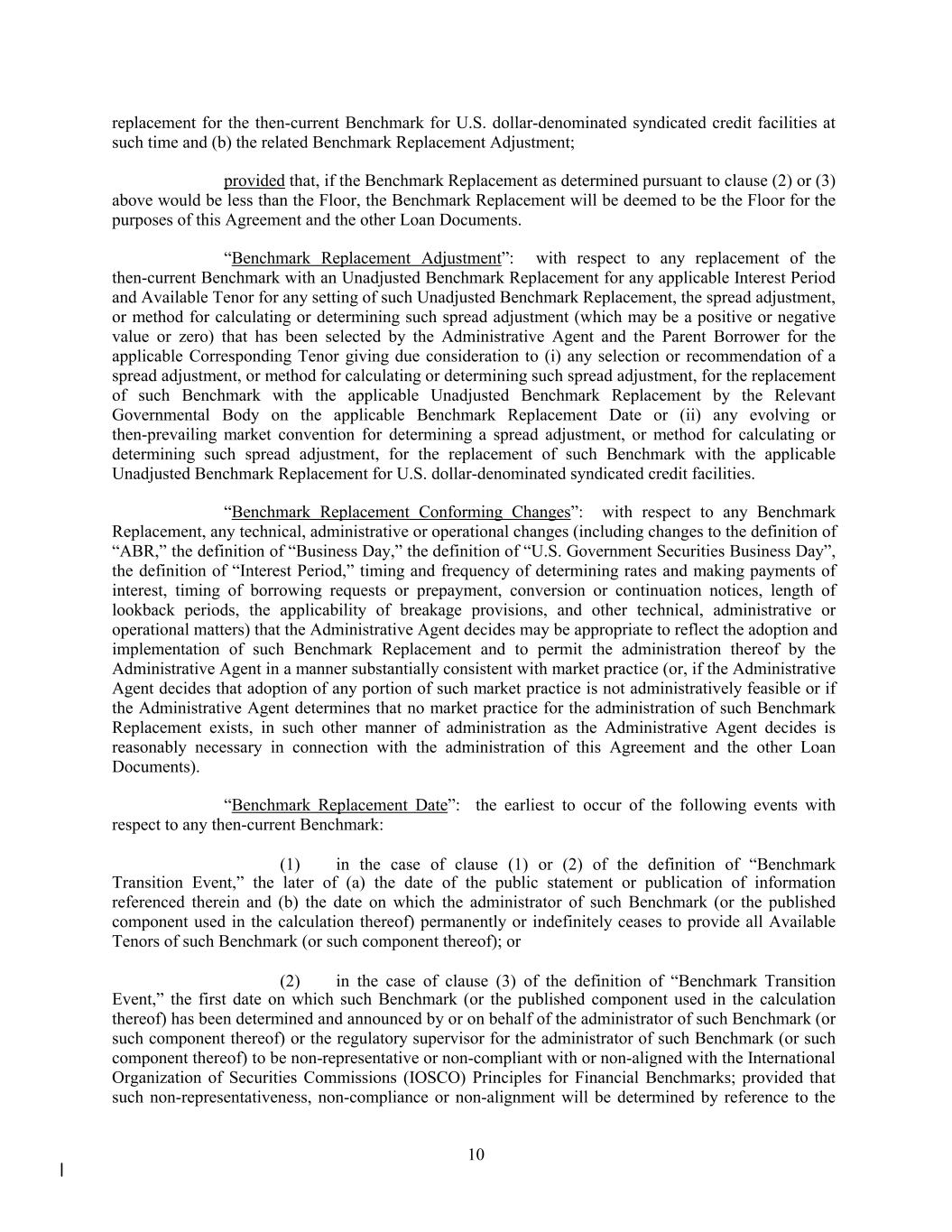 replacement for the then-current Benchmark for U.S. dollar-denominated syndicated credit facilities at such time and (b) the related Benchmark Replacement Adjustment; provided that, if the Benchmark Replacement as determined pursuant to clause (2) or (3) above would be less than the Floor, the Benchmark Replacement will be deemed to be the Floor for the purposes of this Agreement and the other Loan Documents. “Benchmark Replacement Adjustment”: with respect to any replacement of the then-current Benchmark with an Unadjusted Benchmark Replacement for any applicable Interest Period and Available Tenor for any setting of such Unadjusted Benchmark Replacement, the spread adjustment, or method for calculating or determining such spread adjustment (which may be a positive or negative value or zero) that has been selected by the Administrative Agent and the Parent Borrower for the applicable Corresponding Tenor giving due consideration to (i) any selection or recommendation of a spread adjustment, or method for calculating or determining such spread adjustment, for the replacement of such Benchmark with the applicable Unadjusted Benchmark Replacement by the Relevant Governmental Body on the applicable Benchmark Replacement Date or (ii) any evolving or then-prevailing market convention for determining a spread adjustment, or method for calculating or determining such spread adjustment, for the replacement of such Benchmark with the applicable Unadjusted Benchmark Replacement for U.S. dollar-denominated syndicated credit facilities. “Benchmark Replacement Conforming Changes”: with respect to any Benchmark Replacement, any technical, administrative or operational changes (including changes to the definition of “ABR,” the definition of “Business Day,” the definition of “U.S. Government Securities Business Day”, the definition of “Interest Period,” timing and frequency of determining rates and making payments of interest, timing of borrowing requests or prepayment, conversion or continuation notices, length of lookback periods, the applicability of breakage provisions, and other technical, administrative or operational matters) that the Administrative Agent decides may be appropriate to reflect the adoption and implementation of such Benchmark Replacement and to permit the administration thereof by the Administrative Agent in a manner substantially consistent with market practice (or, if the Administrative Agent decides that adoption of any portion of such market practice is not administratively feasible or if the Administrative Agent determines that no market practice for the administration of such Benchmark Replacement exists, in such other manner of administration as the Administrative Agent decides is reasonably necessary in connection with the administration of this Agreement and the other Loan Documents). “Benchmark Replacement Date”: the earliest to occur of the following events with respect to any then-current Benchmark: (1) in the case of clause (1) or (2) of the definition of “Benchmark Transition Event,” the later of (a) the date of the public statement or publication of information referenced therein and (b) the date on which the administrator of such Benchmark (or the published component used in the calculation thereof) permanently or indefinitely ceases to provide all Available Tenors of such Benchmark (or such component thereof); or (2) in the case of clause (3) of the definition of “Benchmark Transition Event,” the first date on which such Benchmark (or the published component used in the calculation thereof) has been determined and announced by or on behalf of the administrator of such Benchmark (or such component thereof) or the regulatory supervisor for the administrator of such Benchmark (or such component thereof) to be non-representative or non-compliant with or non-aligned with the International Organization of Securities Commissions (IOSCO) Principles for Financial Benchmarks; provided that such non-representativeness, non-compliance or non-alignment will be determined by reference to the 10
