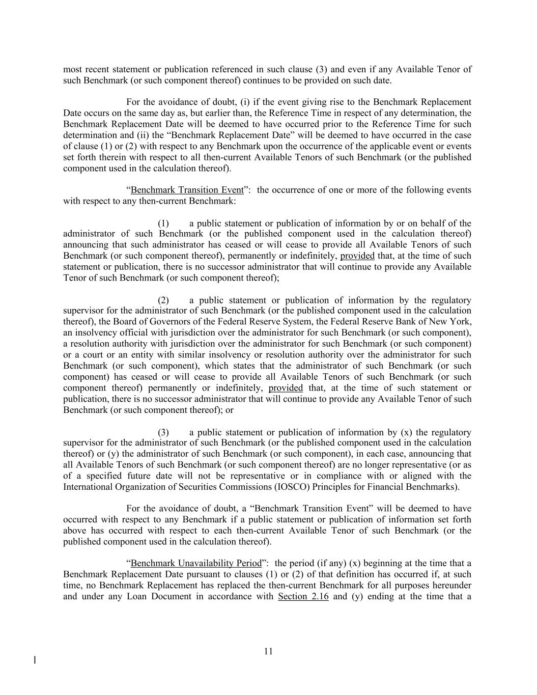 most recent statement or publication referenced in such clause (3) and even if any Available Tenor of such Benchmark (or such component thereof) continues to be provided on such date. For the avoidance of doubt, (i) if the event giving rise to the Benchmark Replacement Date occurs on the same day as, but earlier than, the Reference Time in respect of any determination, the Benchmark Replacement Date will be deemed to have occurred prior to the Reference Time for such determination and (ii) the “Benchmark Replacement Date” will be deemed to have occurred in the case of clause (1) or (2) with respect to any Benchmark upon the occurrence of the applicable event or events set forth therein with respect to all then-current Available Tenors of such Benchmark (or the published component used in the calculation thereof). “Benchmark Transition Event”: the occurrence of one or more of the following events with respect to any then-current Benchmark: (1) a public statement or publication of information by or on behalf of the administrator of such Benchmark (or the published component used in the calculation thereof) announcing that such administrator has ceased or will cease to provide all Available Tenors of such Benchmark (or such component thereof), permanently or indefinitely, provided that, at the time of such statement or publication, there is no successor administrator that will continue to provide any Available Tenor of such Benchmark (or such component thereof); (2) a public statement or publication of information by the regulatory supervisor for the administrator of such Benchmark (or the published component used in the calculation thereof), the Board of Governors of the Federal Reserve System, the Federal Reserve Bank of New York, an insolvency official with jurisdiction over the administrator for such Benchmark (or such component), a resolution authority with jurisdiction over the administrator for such Benchmark (or such component) or a court or an entity with similar insolvency or resolution authority over the administrator for such Benchmark (or such component), which states that the administrator of such Benchmark (or such component) has ceased or will cease to provide all Available Tenors of such Benchmark (or such component thereof) permanently or indefinitely, provided that, at the time of such statement or publication, there is no successor administrator that will continue to provide any Available Tenor of such Benchmark (or such component thereof); or (3) a public statement or publication of information by (x) the regulatory supervisor for the administrator of such Benchmark (or the published component used in the calculation thereof) or (y) the administrator of such Benchmark (or such component), in each case, announcing that all Available Tenors of such Benchmark (or such component thereof) are no longer representative (or as of a specified future date will not be representative or in compliance with or aligned with the International Organization of Securities Commissions (IOSCO) Principles for Financial Benchmarks). For the avoidance of doubt, a “Benchmark Transition Event” will be deemed to have occurred with respect to any Benchmark if a public statement or publication of information set forth above has occurred with respect to each then-current Available Tenor of such Benchmark (or the published component used in the calculation thereof). “Benchmark Unavailability Period”: the period (if any) (x) beginning at the time that a Benchmark Replacement Date pursuant to clauses (1) or (2) of that definition has occurred if, at such time, no Benchmark Replacement has replaced the then-current Benchmark for all purposes hereunder and under any Loan Document in accordance with Section 2.16 and (y) ending at the time that a 11