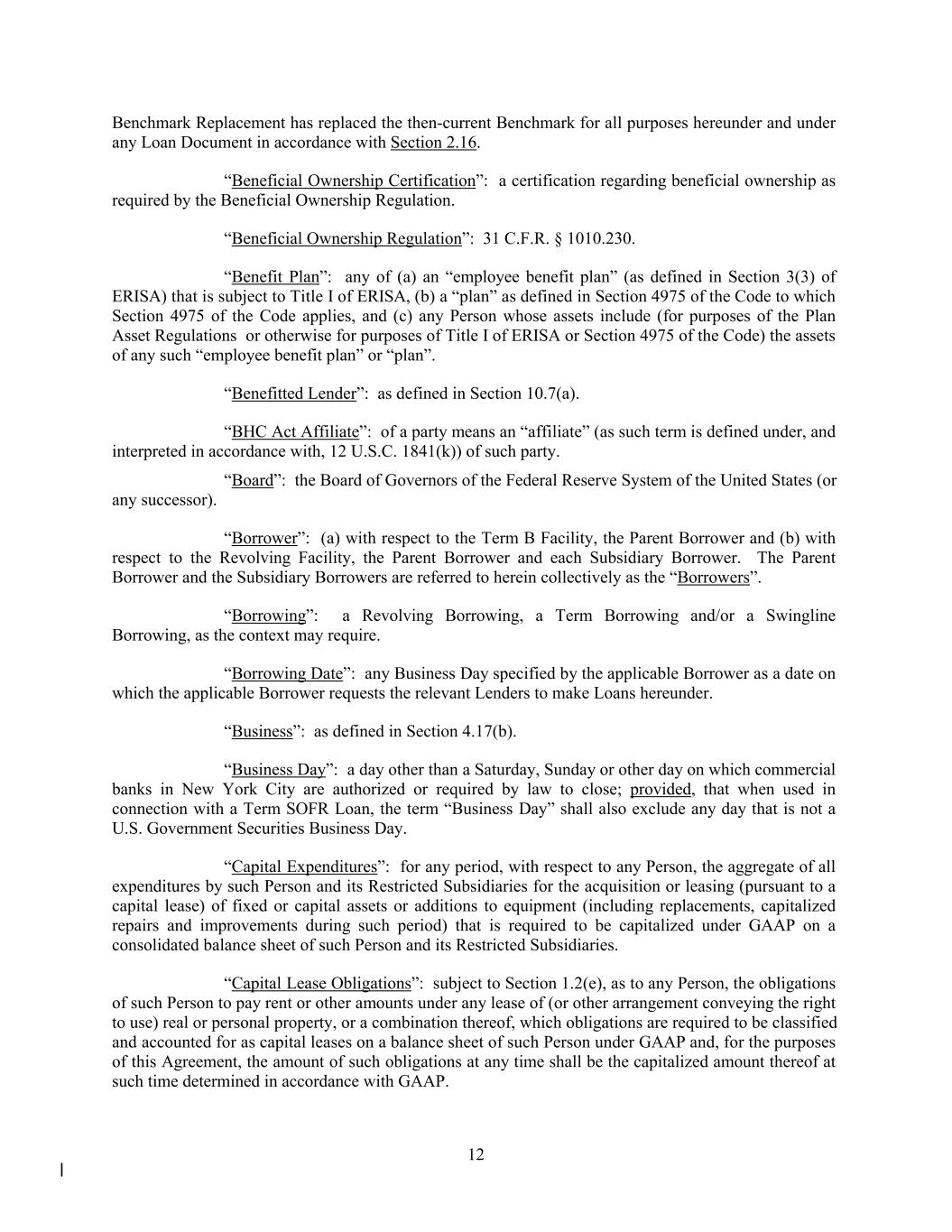 Benchmark Replacement has replaced the then-current Benchmark for all purposes hereunder and under any Loan Document in accordance with Section 2.16. “Beneficial Ownership Certification”: a certification regarding beneficial ownership as required by the Beneficial Ownership Regulation. “Beneficial Ownership Regulation”: 31 C.F.R. § 1010.230. “Benefit Plan”: any of (a) an “employee benefit plan” (as defined in Section 3(3) of ERISA) that is subject to Title I of ERISA, (b) a “plan” as defined in Section 4975 of the Code to which Section 4975 of the Code applies, and (c) any Person whose assets include (for purposes of the Plan Asset Regulations or otherwise for purposes of Title I of ERISA or Section 4975 of the Code) the assets of any such “employee benefit plan” or “plan”. “Benefitted Lender”: as defined in Section 10.7(a). “BHC Act Affiliate”: of a party means an “affiliate” (as such term is defined under, and interpreted in accordance with, 12 U.S.C. 1841(k)) of such party. “Board”: the Board of Governors of the Federal Reserve System of the United States (or any successor). “Borrower”: (a) with respect to the Term B Facility, the Parent Borrower and (b) with respect to the Revolving Facility, the Parent Borrower and each Subsidiary Borrower. The Parent Borrower and the Subsidiary Borrowers are referred to herein collectively as the “Borrowers”. “Borrowing”: a Revolving Borrowing, a Term Borrowing and/or a Swingline Borrowing, as the context may require. “Borrowing Date”: any Business Day specified by the applicable Borrower as a date on which the applicable Borrower requests the relevant Lenders to make Loans hereunder. “Business”: as defined in Section 4.17(b). “Business Day”: a day other than a Saturday, Sunday or other day on which commercial banks in New York City are authorized or required by law to close; provided, that when used in connection with a Term SOFR Loan, the term “Business Day” shall also exclude any day that is not a U.S. Government Securities Business Day. “Capital Expenditures”: for any period, with respect to any Person, the aggregate of all expenditures by such Person and its Restricted Subsidiaries for the acquisition or leasing (pursuant to a capital lease) of fixed or capital assets or additions to equipment (including replacements, capitalized repairs and improvements during such period) that is required to be capitalized under GAAP on a consolidated balance sheet of such Person and its Restricted Subsidiaries. “Capital Lease Obligations”: subject to Section 1.2(e), as to any Person, the obligations of such Person to pay rent or other amounts under any lease of (or other arrangement conveying the right to use) real or personal property, or a combination thereof, which obligations are required to be classified and accounted for as capital leases on a balance sheet of such Person under GAAP and, for the purposes of this Agreement, the amount of such obligations at any time shall be the capitalized amount thereof at such time determined in accordance with GAAP. 12