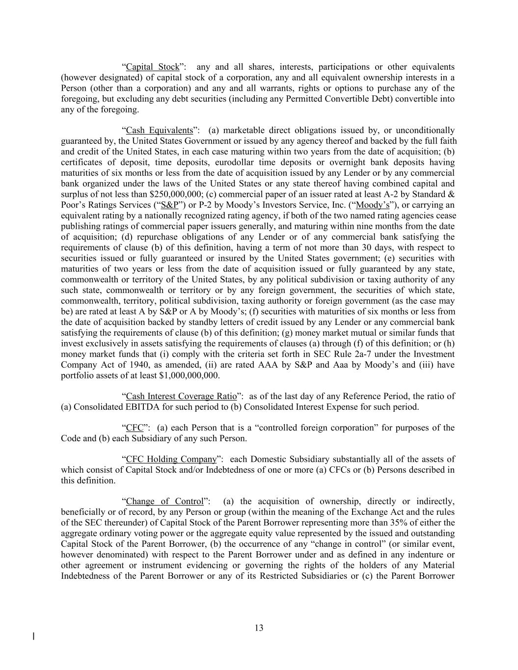 “Capital Stock”: any and all shares, interests, participations or other equivalents (however designated) of capital stock of a corporation, any and all equivalent ownership interests in a Person (other than a corporation) and any and all warrants, rights or options to purchase any of the foregoing, but excluding any debt securities (including any Permitted Convertible Debt) convertible into any of the foregoing. “Cash Equivalents”: (a) marketable direct obligations issued by, or unconditionally guaranteed by, the United States Government or issued by any agency thereof and backed by the full faith and credit of the United States, in each case maturing within two years from the date of acquisition; (b) certificates of deposit, time deposits, eurodollar time deposits or overnight bank deposits having maturities of six months or less from the date of acquisition issued by any Lender or by any commercial bank organized under the laws of the United States or any state thereof having combined capital and surplus of not less than $250,000,000; (c) commercial paper of an issuer rated at least A-2 by Standard & Poor’s Ratings Services (“S&P”) or P-2 by Moody’s Investors Service, Inc. (“Moody’s”), or carrying an equivalent rating by a nationally recognized rating agency, if both of the two named rating agencies cease publishing ratings of commercial paper issuers generally, and maturing within nine months from the date of acquisition; (d) repurchase obligations of any Lender or of any commercial bank satisfying the requirements of clause (b) of this definition, having a term of not more than 30 days, with respect to securities issued or fully guaranteed or insured by the United States government; (e) securities with maturities of two years or less from the date of acquisition issued or fully guaranteed by any state, commonwealth or territory of the United States, by any political subdivision or taxing authority of any such state, commonwealth or territory or by any foreign government, the securities of which state, commonwealth, territory, political subdivision, taxing authority or foreign government (as the case may be) are rated at least A by S&P or A by Moody’s; (f) securities with maturities of six months or less from the date of acquisition backed by standby letters of credit issued by any Lender or any commercial bank satisfying the requirements of clause (b) of this definition; (g) money market mutual or similar funds that invest exclusively in assets satisfying the requirements of clauses (a) through (f) of this definition; or (h) money market funds that (i) comply with the criteria set forth in SEC Rule 2a-7 under the Investment Company Act of 1940, as amended, (ii) are rated AAA by S&P and Aaa by Moody’s and (iii) have portfolio assets of at least $1,000,000,000. “Cash Interest Coverage Ratio”: as of the last day of any Reference Period, the ratio of (a) Consolidated EBITDA for such period to (b) Consolidated Interest Expense for such period. “CFC”: (a) each Person that is a “controlled foreign corporation” for purposes of the Code and (b) each Subsidiary of any such Person. “CFC Holding Company”: each Domestic Subsidiary substantially all of the assets of which consist of Capital Stock and/or Indebtedness of one or more (a) CFCs or (b) Persons described in this definition. “Change of Control”: (a) the acquisition of ownership, directly or indirectly, beneficially or of record, by any Person or group (within the meaning of the Exchange Act and the rules of the SEC thereunder) of Capital Stock of the Parent Borrower representing more than 35% of either the aggregate ordinary voting power or the aggregate equity value represented by the issued and outstanding Capital Stock of the Parent Borrower, (b) the occurrence of any “change in control” (or similar event, however denominated) with respect to the Parent Borrower under and as defined in any indenture or other agreement or instrument evidencing or governing the rights of the holders of any Material Indebtedness of the Parent Borrower or any of its Restricted Subsidiaries or (c) the Parent Borrower 13