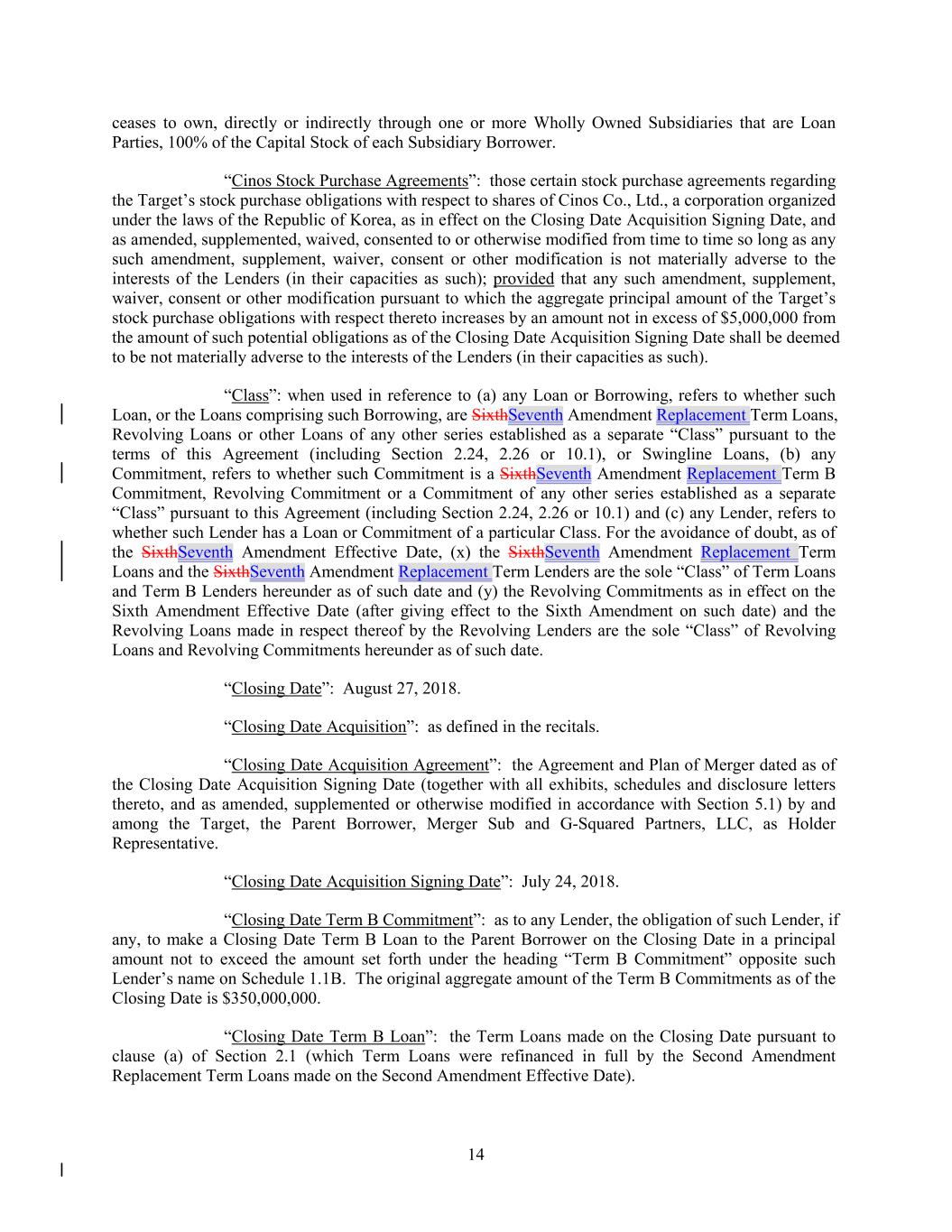ceases to own, directly or indirectly through one or more Wholly Owned Subsidiaries that are Loan Parties, 100% of the Capital Stock of each Subsidiary Borrower. “Cinos Stock Purchase Agreements”: those certain stock purchase agreements regarding the Target’s stock purchase obligations with respect to shares of Cinos Co., Ltd., a corporation organized under the laws of the Republic of Korea, as in effect on the Closing Date Acquisition Signing Date, and as amended, supplemented, waived, consented to or otherwise modified from time to time so long as any such amendment, supplement, waiver, consent or other modification is not materially adverse to the interests of the Lenders (in their capacities as such); provided that any such amendment, supplement, waiver, consent or other modification pursuant to which the aggregate principal amount of the Target’s stock purchase obligations with respect thereto increases by an amount not in excess of $5,000,000 from the amount of such potential obligations as of the Closing Date Acquisition Signing Date shall be deemed to be not materially adverse to the interests of the Lenders (in their capacities as such). “Class”: when used in reference to (a) any Loan or Borrowing, refers to whether such Loan, or the Loans comprising such Borrowing, are SixthSeventh Amendment Replacement Term Loans, Revolving Loans or other Loans of any other series established as a separate “Class” pursuant to the terms of this Agreement (including Section 2.24, 2.26 or 10.1), or Swingline Loans, (b) any Commitment, refers to whether such Commitment is a SixthSeventh Amendment Replacement Term B Commitment, Revolving Commitment or a Commitment of any other series established as a separate “Class” pursuant to this Agreement (including Section 2.24, 2.26 or 10.1) and (c) any Lender, refers to whether such Lender has a Loan or Commitment of a particular Class. For the avoidance of doubt, as of the SixthSeventh Amendment Effective Date, (x) the SixthSeventh Amendment Replacement Term Loans and the SixthSeventh Amendment Replacement Term Lenders are the sole “Class” of Term Loans and Term B Lenders hereunder as of such date and (y) the Revolving Commitments as in effect on the Sixth Amendment Effective Date (after giving effect to the Sixth Amendment on such date) and the Revolving Loans made in respect thereof by the Revolving Lenders are the sole “Class” of Revolving Loans and Revolving Commitments hereunder as of such date. “Closing Date”: August 27, 2018. “Closing Date Acquisition”: as defined in the recitals. “Closing Date Acquisition Agreement”: the Agreement and Plan of Merger dated as of the Closing Date Acquisition Signing Date (together with all exhibits, schedules and disclosure letters thereto, and as amended, supplemented or otherwise modified in accordance with Section 5.1) by and among the Target, the Parent Borrower, Merger Sub and G-Squared Partners, LLC, as Holder Representative. “Closing Date Acquisition Signing Date”: July 24, 2018. “Closing Date Term B Commitment”: as to any Lender, the obligation of such Lender, if any, to make a Closing Date Term B Loan to the Parent Borrower on the Closing Date in a principal amount not to exceed the amount set forth under the heading “Term B Commitment” opposite such Lender’s name on Schedule 1.1B. The original aggregate amount of the Term B Commitments as of the Closing Date is $350,000,000. “Closing Date Term B Loan”: the Term Loans made on the Closing Date pursuant to clause (a) of Section 2.1 (which Term Loans were refinanced in full by the Second Amendment Replacement Term Loans made on the Second Amendment Effective Date). 14