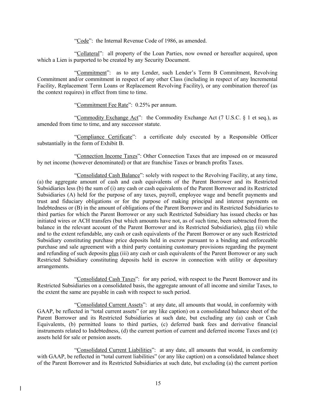 “Code”: the Internal Revenue Code of 1986, as amended. “Collateral”: all property of the Loan Parties, now owned or hereafter acquired, upon which a Lien is purported to be created by any Security Document. “Commitment”: as to any Lender, such Lender’s Term B Commitment, Revolving Commitment and/or commitment in respect of any other Class (including in respect of any Incremental Facility, Replacement Term Loans or Replacement Revolving Facility), or any combination thereof (as the context requires) in effect from time to time. “Commitment Fee Rate”: 0.25% per annum. “Commodity Exchange Act”: the Commodity Exchange Act (7 U.S.C. § 1 et seq.), as amended from time to time, and any successor statute. “Compliance Certificate”: a certificate duly executed by a Responsible Officer substantially in the form of Exhibit B. “Connection Income Taxes”: Other Connection Taxes that are imposed on or measured by net income (however denominated) or that are franchise Taxes or branch profits Taxes. “Consolidated Cash Balance”: solely with respect to the Revolving Facility, at any time, (a) the aggregate amount of cash and cash equivalents of the Parent Borrower and its Restricted Subsidiaries less (b) the sum of (i) any cash or cash equivalents of the Parent Borrower and its Restricted Subsidiaries (A) held for the purpose of any taxes, payroll, employee wage and benefit payments and trust and fiduciary obligations or for the purpose of making principal and interest payments on Indebtedness or (B) in the amount of obligations of the Parent Borrower and its Restricted Subsidiaries to third parties for which the Parent Borrower or any such Restricted Subsidiary has issued checks or has initiated wires or ACH transfers (but which amounts have not, as of such time, been subtracted from the balance in the relevant account of the Parent Borrower and its Restricted Subsidiaries), plus (ii) while and to the extent refundable, any cash or cash equivalents of the Parent Borrower or any such Restricted Subsidiary constituting purchase price deposits held in escrow pursuant to a binding and enforceable purchase and sale agreement with a third party containing customary provisions regarding the payment and refunding of such deposits plus (iii) any cash or cash equivalents of the Parent Borrower or any such Restricted Subsidiary constituting deposits held in escrow in connection with utility or depositary arrangements. “Consolidated Cash Taxes”: for any period, with respect to the Parent Borrower and its Restricted Subsidiaries on a consolidated basis, the aggregate amount of all income and similar Taxes, to the extent the same are payable in cash with respect to such period. “Consolidated Current Assets”: at any date, all amounts that would, in conformity with GAAP, be reflected in “total current assets” (or any like caption) on a consolidated balance sheet of the Parent Borrower and its Restricted Subsidiaries at such date, but excluding any (a) cash or Cash Equivalents, (b) permitted loans to third parties, (c) deferred bank fees and derivative financial instruments related to Indebtedness, (d) the current portion of current and deferred income Taxes and (e) assets held for sale or pension assets. “Consolidated Current Liabilities”: at any date, all amounts that would, in conformity with GAAP, be reflected in “total current liabilities” (or any like caption) on a consolidated balance sheet of the Parent Borrower and its Restricted Subsidiaries at such date, but excluding (a) the current portion 15