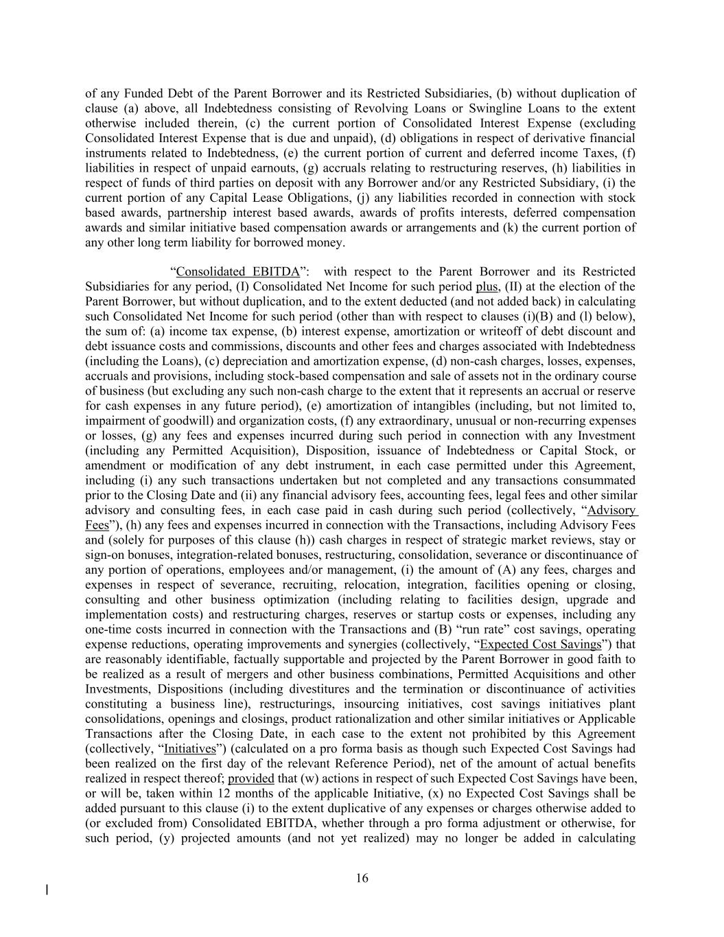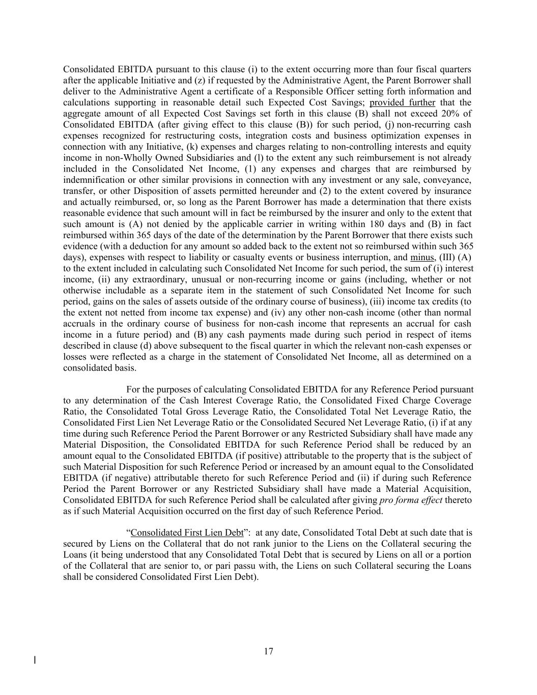 Consolidated EBITDA pursuant to this clause (i) to the extent occurring more than four fiscal quarters after the applicable Initiative and (z) if requested by the Administrative Agent, the Parent Borrower shall deliver to the Administrative Agent a certificate of a Responsible Officer setting forth information and calculations supporting in reasonable detail such Expected Cost Savings; provided further that the aggregate amount of all Expected Cost Savings set forth in this clause (B) shall not exceed 20% of Consolidated EBITDA (after giving effect to this clause (B)) for such period, (j) non-recurring cash expenses recognized for restructuring costs, integration costs and business optimization expenses in connection with any Initiative, (k) expenses and charges relating to non-controlling interests and equity income in non-Wholly Owned Subsidiaries and (l) to the extent any such reimbursement is not already included in the Consolidated Net Income, (1) any expenses and charges that are reimbursed by indemnification or other similar provisions in connection with any investment or any sale, conveyance, transfer, or other Disposition of assets permitted hereunder and (2) to the extent covered by insurance and actually reimbursed, or, so long as the Parent Borrower has made a determination that there exists reasonable evidence that such amount will in fact be reimbursed by the insurer and only to the extent that such amount is (A) not denied by the applicable carrier in writing within 180 days and (B) in fact reimbursed within 365 days of the date of the determination by the Parent Borrower that there exists such evidence (with a deduction for any amount so added back to the extent not so reimbursed within such 365 days), expenses with respect to liability or casualty events or business interruption, and minus, (III) (A) to the extent included in calculating such Consolidated Net Income for such period, the sum of (i) interest income, (ii) any extraordinary, unusual or non-recurring income or gains (including, whether or not otherwise includable as a separate item in the statement of such Consolidated Net Income for such period, gains on the sales of assets outside of the ordinary course of business), (iii) income tax credits (to the extent not netted from income tax expense) and (iv) any other non-cash income (other than normal accruals in the ordinary course of business for non-cash income that represents an accrual for cash income in a future period) and (B) any cash payments made during such period in respect of items described in clause (d) above subsequent to the fiscal quarter in which the relevant non-cash expenses or losses were reflected as a charge in the statement of Consolidated Net Income, all as determined on a consolidated basis. For the purposes of calculating Consolidated EBITDA for any Reference Period pursuant to any determination of the Cash Interest Coverage Ratio, the Consolidated Fixed Charge Coverage Ratio, the Consolidated Total Gross Leverage Ratio, the Consolidated Total Net Leverage Ratio, the Consolidated First Lien Net Leverage Ratio or the Consolidated Secured Net Leverage Ratio, (i) if at any time during such Reference Period the Parent Borrower or any Restricted Subsidiary shall have made any Material Disposition, the Consolidated EBITDA for such Reference Period shall be reduced by an amount equal to the Consolidated EBITDA (if positive) attributable to the property that is the subject of such Material Disposition for such Reference Period or increased by an amount equal to the Consolidated EBITDA (if negative) attributable thereto for such Reference Period and (ii) if during such Reference Period the Parent Borrower or any Restricted Subsidiary shall have made a Material Acquisition, Consolidated EBITDA for such Reference Period shall be calculated after giving pro forma effect thereto as if such Material Acquisition occurred on the first day of such Reference Period. “Consolidated First Lien Debt”: at any date, Consolidated Total Debt at such date that is secured by Liens on the Collateral that do not rank junior to the Liens on the Collateral securing the Loans (it being understood that any Consolidated Total Debt that is secured by Liens on all or a portion of the Collateral that are senior to, or pari passu with, the Liens on such Collateral securing the Loans shall be considered Consolidated First Lien Debt). 17