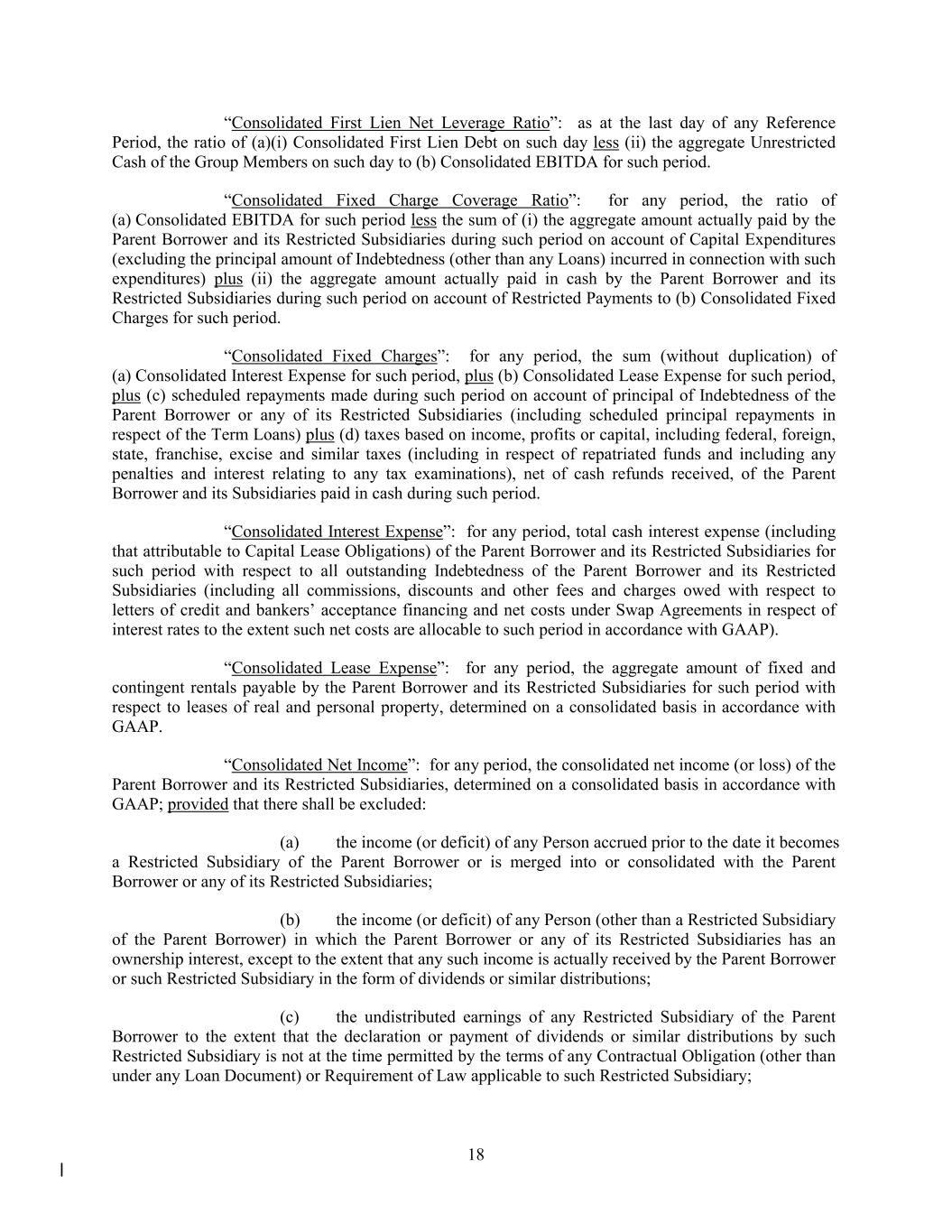 “Consolidated First Lien Net Leverage Ratio”: as at the last day of any Reference Period, the ratio of (a)(i) Consolidated First Lien Debt on such day less (ii) the aggregate Unrestricted Cash of the Group Members on such day to (b) Consolidated EBITDA for such period. “Consolidated Fixed Charge Coverage Ratio”: for any period, the ratio of (a) Consolidated EBITDA for such period less the sum of (i) the aggregate amount actually paid by the Parent Borrower and its Restricted Subsidiaries during such period on account of Capital Expenditures (excluding the principal amount of Indebtedness (other than any Loans) incurred in connection with such expenditures) plus (ii) the aggregate amount actually paid in cash by the Parent Borrower and its Restricted Subsidiaries during such period on account of Restricted Payments to (b) Consolidated Fixed Charges for such period. “Consolidated Fixed Charges”: for any period, the sum (without duplication) of (a) Consolidated Interest Expense for such period, plus (b) Consolidated Lease Expense for such period, plus (c) scheduled repayments made during such period on account of principal of Indebtedness of the Parent Borrower or any of its Restricted Subsidiaries (including scheduled principal repayments in respect of the Term Loans) plus (d) taxes based on income, profits or capital, including federal, foreign, state, franchise, excise and similar taxes (including in respect of repatriated funds and including any penalties and interest relating to any tax examinations), net of cash refunds received, of the Parent Borrower and its Subsidiaries paid in cash during such period. “Consolidated Interest Expense”: for any period, total cash interest expense (including that attributable to Capital Lease Obligations) of the Parent Borrower and its Restricted Subsidiaries for such period with respect to all outstanding Indebtedness of the Parent Borrower and its Restricted Subsidiaries (including all commissions, discounts and other fees and charges owed with respect to letters of credit and bankers’ acceptance financing and net costs under Swap Agreements in respect of interest rates to the extent such net costs are allocable to such period in accordance with GAAP). “Consolidated Lease Expense”: for any period, the aggregate amount of fixed and contingent rentals payable by the Parent Borrower and its Restricted Subsidiaries for such period with respect to leases of real and personal property, determined on a consolidated basis in accordance with GAAP. “Consolidated Net Income”: for any period, the consolidated net income (or loss) of the Parent Borrower and its Restricted Subsidiaries, determined on a consolidated basis in accordance with GAAP; provided that there shall be excluded: (a) the income (or deficit) of any Person accrued prior to the date it becomes a Restricted Subsidiary of the Parent Borrower or is merged into or consolidated with the Parent Borrower or any of its Restricted Subsidiaries; (b) the income (or deficit) of any Person (other than a Restricted Subsidiary of the Parent Borrower) in which the Parent Borrower or any of its Restricted Subsidiaries has an ownership interest, except to the extent that any such income is actually received by the Parent Borrower or such Restricted Subsidiary in the form of dividends or similar distributions; (c) the undistributed earnings of any Restricted Subsidiary of the Parent Borrower to the extent that the declaration or payment of dividends or similar distributions by such Restricted Subsidiary is not at the time permitted by the terms of any Contractual Obligation (other than under any Loan Document) or Requirement of Law applicable to such Restricted Subsidiary; 18