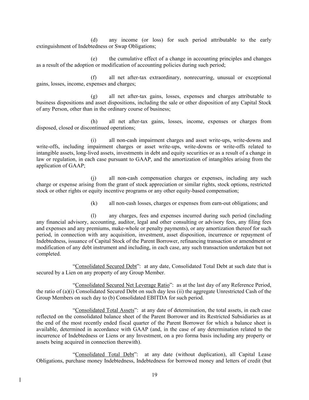 (d) any income (or loss) for such period attributable to the early extinguishment of Indebtedness or Swap Obligations; (e) the cumulative effect of a change in accounting principles and changes as a result of the adoption or modification of accounting policies during such period; (f) all net after-tax extraordinary, nonrecurring, unusual or exceptional gains, losses, income, expenses and charges; (g) all net after-tax gains, losses, expenses and charges attributable to business dispositions and asset dispositions, including the sale or other disposition of any Capital Stock of any Person, other than in the ordinary course of business; (h) all net after-tax gains, losses, income, expenses or charges from disposed, closed or discontinued operations; (i) all non-cash impairment charges and asset write-ups, write-downs and write-offs, including impairment charges or asset write-ups, write-downs or write-offs related to intangible assets, long-lived assets, investments in debt and equity securities or as a result of a change in law or regulation, in each case pursuant to GAAP, and the amortization of intangibles arising from the application of GAAP; (j) all non-cash compensation charges or expenses, including any such charge or expense arising from the grant of stock appreciation or similar rights, stock options, restricted stock or other rights or equity incentive programs or any other equity-based compensation; (k) all non-cash losses, charges or expenses from earn-out obligations; and (l) any charges, fees and expenses incurred during such period (including any financial advisory, accounting, auditor, legal and other consulting or advisory fees, any filing fees and expenses and any premiums, make-whole or penalty payments), or any amortization thereof for such period, in connection with any acquisition, investment, asset disposition, incurrence or repayment of Indebtedness, issuance of Capital Stock of the Parent Borrower, refinancing transaction or amendment or modification of any debt instrument and including, in each case, any such transaction undertaken but not completed. “Consolidated Secured Debt”: at any date, Consolidated Total Debt at such date that is secured by a Lien on any property of any Group Member. “Consolidated Secured Net Leverage Ratio”: as at the last day of any Reference Period, the ratio of (a)(i) Consolidated Secured Debt on such day less (ii) the aggregate Unrestricted Cash of the Group Members on such day to (b) Consolidated EBITDA for such period. “Consolidated Total Assets”: at any date of determination, the total assets, in each case reflected on the consolidated balance sheet of the Parent Borrower and its Restricted Subsidiaries as at the end of the most recently ended fiscal quarter of the Parent Borrower for which a balance sheet is available, determined in accordance with GAAP (and, in the case of any determination related to the incurrence of Indebtedness or Liens or any Investment, on a pro forma basis including any property or assets being acquired in connection therewith). “Consolidated Total Debt”: at any date (without duplication), all Capital Lease Obligations, purchase money Indebtedness, Indebtedness for borrowed money and letters of credit (but 19