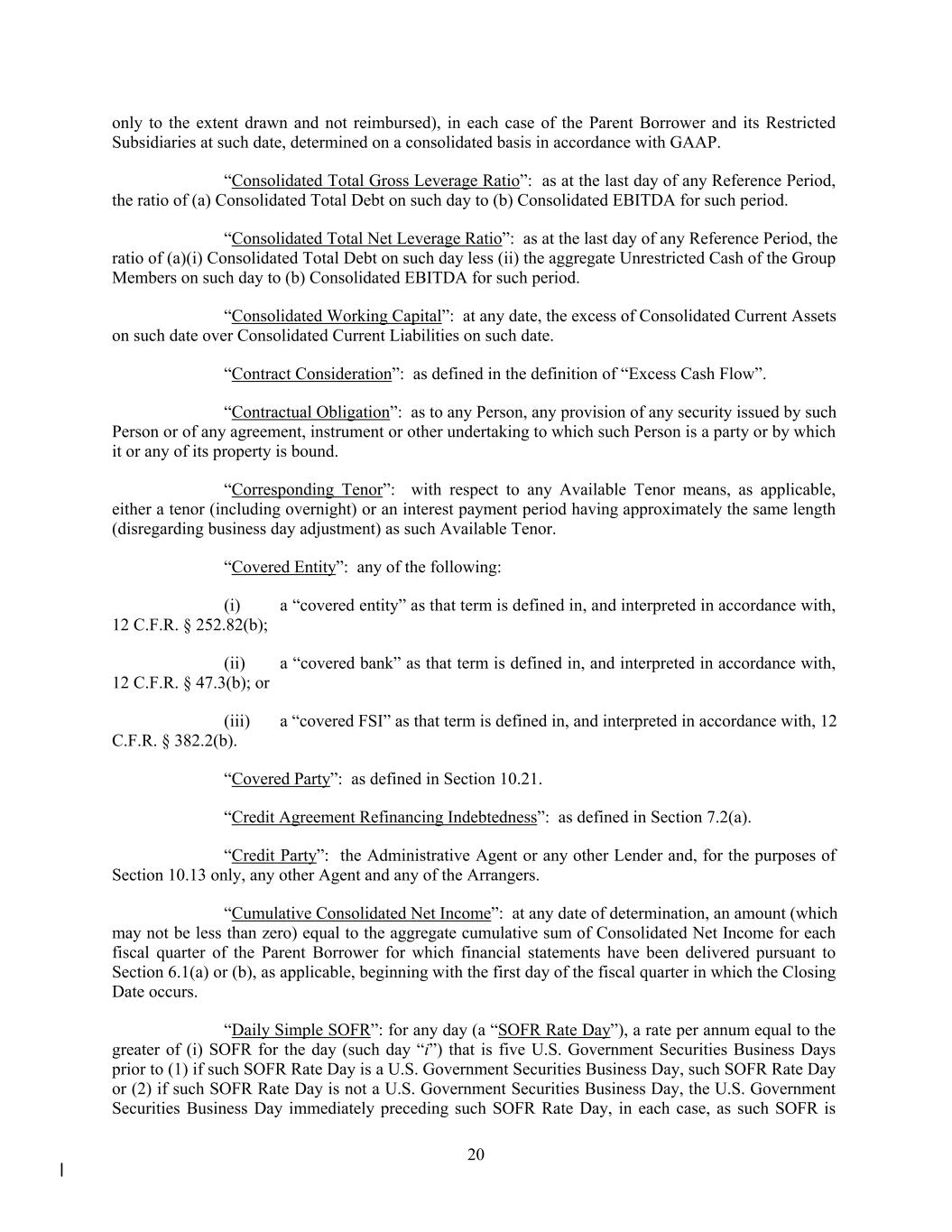 only to the extent drawn and not reimbursed), in each case of the Parent Borrower and its Restricted Subsidiaries at such date, determined on a consolidated basis in accordance with GAAP. “Consolidated Total Gross Leverage Ratio”: as at the last day of any Reference Period, the ratio of (a) Consolidated Total Debt on such day to (b) Consolidated EBITDA for such period. “Consolidated Total Net Leverage Ratio”: as at the last day of any Reference Period, the ratio of (a)(i) Consolidated Total Debt on such day less (ii) the aggregate Unrestricted Cash of the Group Members on such day to (b) Consolidated EBITDA for such period. “Consolidated Working Capital”: at any date, the excess of Consolidated Current Assets on such date over Consolidated Current Liabilities on such date. “Contract Consideration”: as defined in the definition of “Excess Cash Flow”. “Contractual Obligation”: as to any Person, any provision of any security issued by such Person or of any agreement, instrument or other undertaking to which such Person is a party or by which it or any of its property is bound. “Corresponding Tenor”: with respect to any Available Tenor means, as applicable, either a tenor (including overnight) or an interest payment period having approximately the same length (disregarding business day adjustment) as such Available Tenor. “Covered Entity”: any of the following: (i) a “covered entity” as that term is defined in, and interpreted in accordance with, 12 C.F.R. § 252.82(b); (ii) a “covered bank” as that term is defined in, and interpreted in accordance with, 12 C.F.R. § 47.3(b); or (iii) a “covered FSI” as that term is defined in, and interpreted in accordance with, 12 C.F.R. § 382.2(b). “Covered Party”: as defined in Section 10.21. “Credit Agreement Refinancing Indebtedness”: as defined in Section 7.2(a). “Credit Party”: the Administrative Agent or any other Lender and, for the purposes of Section 10.13 only, any other Agent and any of the Arrangers. “Cumulative Consolidated Net Income”: at any date of determination, an amount (which may not be less than zero) equal to the aggregate cumulative sum of Consolidated Net Income for each fiscal quarter of the Parent Borrower for which financial statements have been delivered pursuant to Section 6.1(a) or (b), as applicable, beginning with the first day of the fiscal quarter in which the Closing Date occurs. “Daily Simple SOFR”: for any day (a “SOFR Rate Day”), a rate per annum equal to the greater of (i) SOFR for the day (such day “i”) that is five U.S. Government Securities Business Days prior to (1) if such SOFR Rate Day is a U.S. Government Securities Business Day, such SOFR Rate Day or (2) if such SOFR Rate Day is not a U.S. Government Securities Business Day, the U.S. Government Securities Business Day immediately preceding such SOFR Rate Day, in each case, as such SOFR is 20