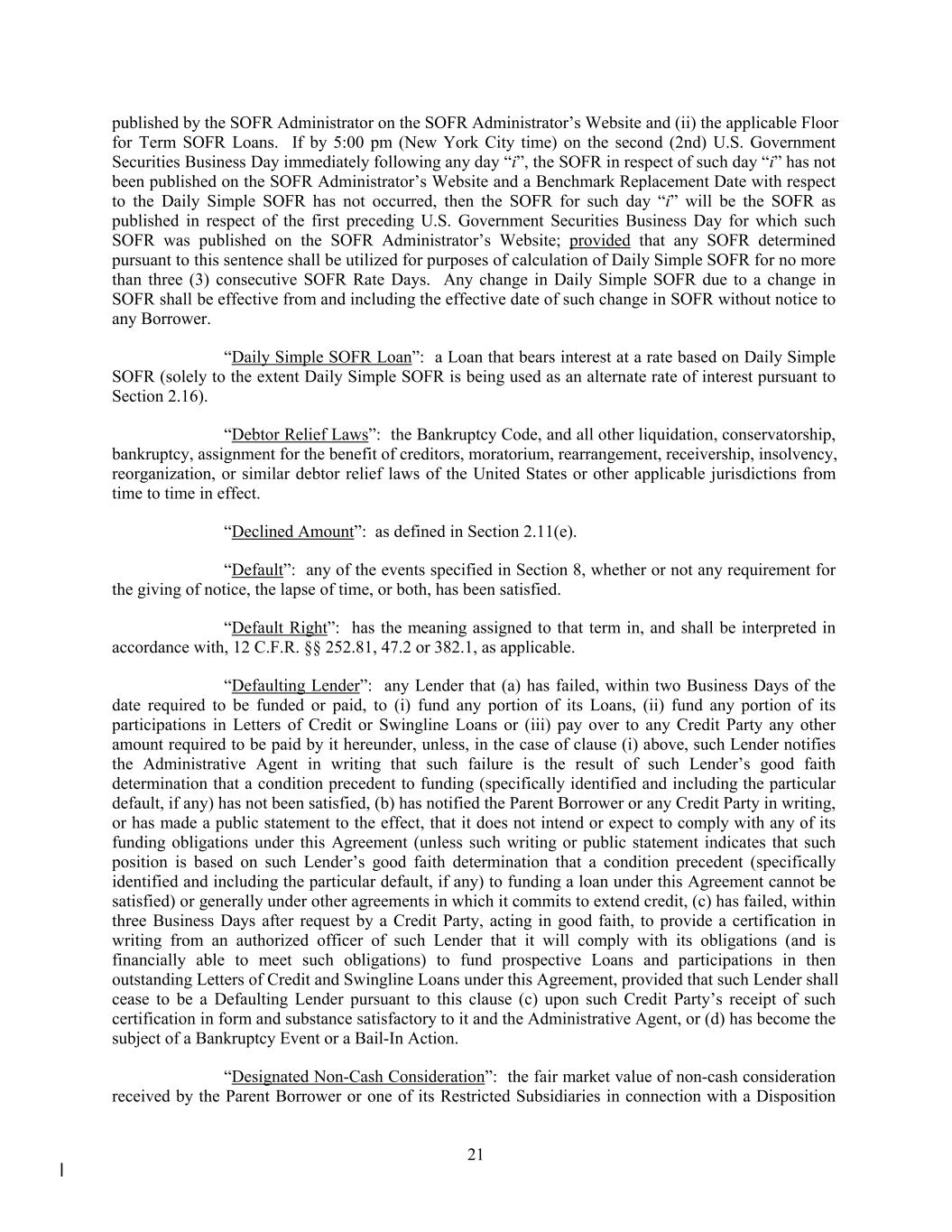 published by the SOFR Administrator on the SOFR Administrator’s Website and (ii) the applicable Floor for Term SOFR Loans. If by 5:00 pm (New York City time) on the second (2nd) U.S. Government Securities Business Day immediately following any day “i”, the SOFR in respect of such day “i” has not been published on the SOFR Administrator’s Website and a Benchmark Replacement Date with respect to the Daily Simple SOFR has not occurred, then the SOFR for such day “i” will be the SOFR as published in respect of the first preceding U.S. Government Securities Business Day for which such SOFR was published on the SOFR Administrator’s Website; provided that any SOFR determined pursuant to this sentence shall be utilized for purposes of calculation of Daily Simple SOFR for no more than three (3) consecutive SOFR Rate Days. Any change in Daily Simple SOFR due to a change in SOFR shall be effective from and including the effective date of such change in SOFR without notice to any Borrower. “Daily Simple SOFR Loan”: a Loan that bears interest at a rate based on Daily Simple SOFR (solely to the extent Daily Simple SOFR is being used as an alternate rate of interest pursuant to Section 2.16). “Debtor Relief Laws”: the Bankruptcy Code, and all other liquidation, conservatorship, bankruptcy, assignment for the benefit of creditors, moratorium, rearrangement, receivership, insolvency, reorganization, or similar debtor relief laws of the United States or other applicable jurisdictions from time to time in effect. “Declined Amount”: as defined in Section 2.11(e). “Default”: any of the events specified in Section 8, whether or not any requirement for the giving of notice, the lapse of time, or both, has been satisfied. “Default Right”: has the meaning assigned to that term in, and shall be interpreted in accordance with, 12 C.F.R. §§ 252.81, 47.2 or 382.1, as applicable. “Defaulting Lender”: any Lender that (a) has failed, within two Business Days of the date required to be funded or paid, to (i) fund any portion of its Loans, (ii) fund any portion of its participations in Letters of Credit or Swingline Loans or (iii) pay over to any Credit Party any other amount required to be paid by it hereunder, unless, in the case of clause (i) above, such Lender notifies the Administrative Agent in writing that such failure is the result of such Lender’s good faith determination that a condition precedent to funding (specifically identified and including the particular default, if any) has not been satisfied, (b) has notified the Parent Borrower or any Credit Party in writing, or has made a public statement to the effect, that it does not intend or expect to comply with any of its funding obligations under this Agreement (unless such writing or public statement indicates that such position is based on such Lender’s good faith determination that a condition precedent (specifically identified and including the particular default, if any) to funding a loan under this Agreement cannot be satisfied) or generally under other agreements in which it commits to extend credit, (c) has failed, within three Business Days after request by a Credit Party, acting in good faith, to provide a certification in writing from an authorized officer of such Lender that it will comply with its obligations (and is financially able to meet such obligations) to fund prospective Loans and participations in then outstanding Letters of Credit and Swingline Loans under this Agreement, provided that such Lender shall cease to be a Defaulting Lender pursuant to this clause (c) upon such Credit Party’s receipt of such certification in form and substance satisfactory to it and the Administrative Agent, or (d) has become the subject of a Bankruptcy Event or a Bail-In Action. “Designated Non-Cash Consideration”: the fair market value of non-cash consideration received by the Parent Borrower or one of its Restricted Subsidiaries in connection with a Disposition 21