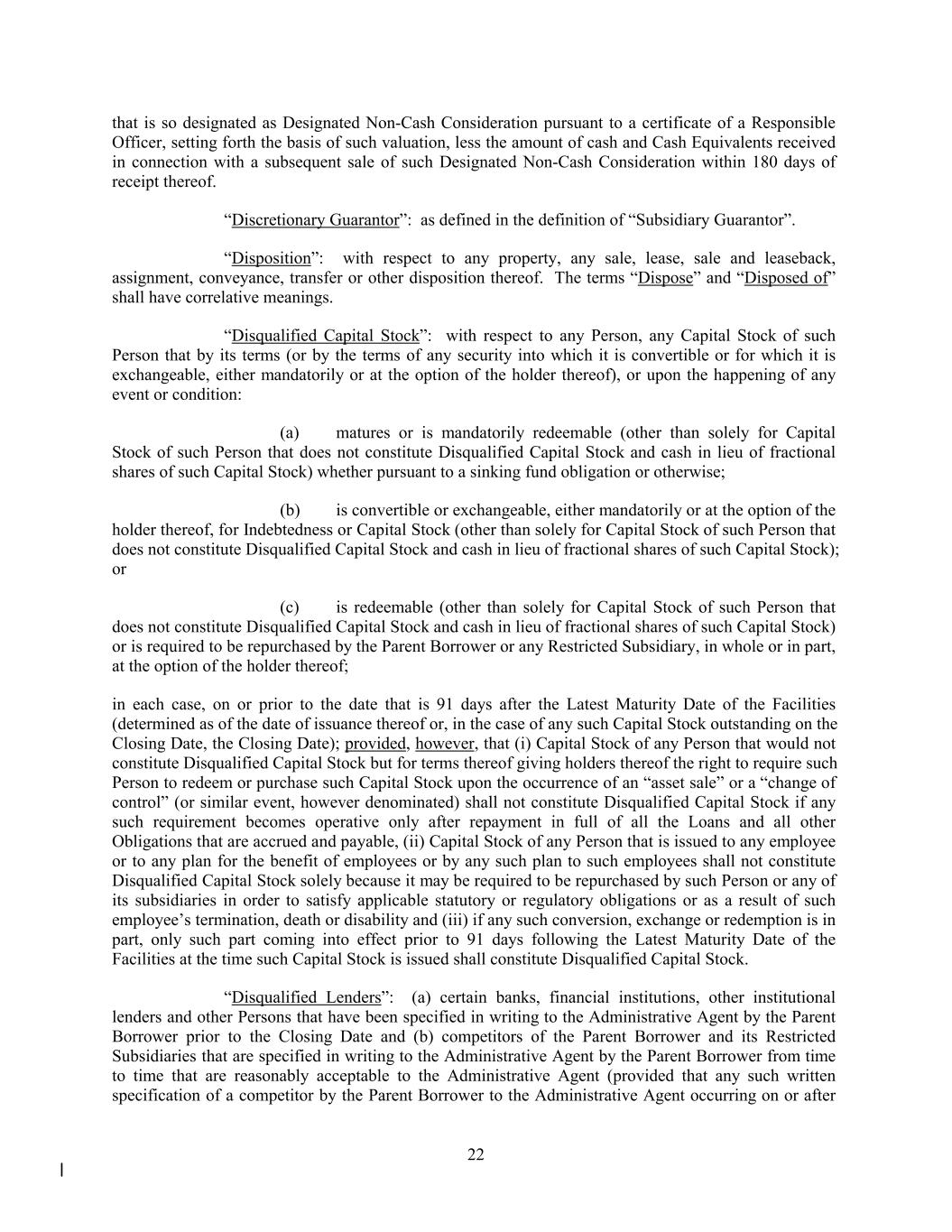 that is so designated as Designated Non-Cash Consideration pursuant to a certificate of a Responsible Officer, setting forth the basis of such valuation, less the amount of cash and Cash Equivalents received in connection with a subsequent sale of such Designated Non-Cash Consideration within 180 days of receipt thereof. “Discretionary Guarantor”: as defined in the definition of “Subsidiary Guarantor”. “Disposition”: with respect to any property, any sale, lease, sale and leaseback, assignment, conveyance, transfer or other disposition thereof. The terms “Dispose” and “Disposed of” shall have correlative meanings. “Disqualified Capital Stock”: with respect to any Person, any Capital Stock of such Person that by its terms (or by the terms of any security into which it is convertible or for which it is exchangeable, either mandatorily or at the option of the holder thereof), or upon the happening of any event or condition: (a) matures or is mandatorily redeemable (other than solely for Capital Stock of such Person that does not constitute Disqualified Capital Stock and cash in lieu of fractional shares of such Capital Stock) whether pursuant to a sinking fund obligation or otherwise; (b) is convertible or exchangeable, either mandatorily or at the option of the holder thereof, for Indebtedness or Capital Stock (other than solely for Capital Stock of such Person that does not constitute Disqualified Capital Stock and cash in lieu of fractional shares of such Capital Stock); or (c) is redeemable (other than solely for Capital Stock of such Person that does not constitute Disqualified Capital Stock and cash in lieu of fractional shares of such Capital Stock) or is required to be repurchased by the Parent Borrower or any Restricted Subsidiary, in whole or in part, at the option of the holder thereof; in each case, on or prior to the date that is 91 days after the Latest Maturity Date of the Facilities (determined as of the date of issuance thereof or, in the case of any such Capital Stock outstanding on the Closing Date, the Closing Date); provided, however, that (i) Capital Stock of any Person that would not constitute Disqualified Capital Stock but for terms thereof giving holders thereof the right to require such Person to redeem or purchase such Capital Stock upon the occurrence of an “asset sale” or a “change of control” (or similar event, however denominated) shall not constitute Disqualified Capital Stock if any such requirement becomes operative only after repayment in full of all the Loans and all other Obligations that are accrued and payable, (ii) Capital Stock of any Person that is issued to any employee or to any plan for the benefit of employees or by any such plan to such employees shall not constitute Disqualified Capital Stock solely because it may be required to be repurchased by such Person or any of its subsidiaries in order to satisfy applicable statutory or regulatory obligations or as a result of such employee’s termination, death or disability and (iii) if any such conversion, exchange or redemption is in part, only such part coming into effect prior to 91 days following the Latest Maturity Date of the Facilities at the time such Capital Stock is issued shall constitute Disqualified Capital Stock. “Disqualified Lenders”: (a) certain banks, financial institutions, other institutional lenders and other Persons that have been specified in writing to the Administrative Agent by the Parent Borrower prior to the Closing Date and (b) competitors of the Parent Borrower and its Restricted Subsidiaries that are specified in writing to the Administrative Agent by the Parent Borrower from time to time that are reasonably acceptable to the Administrative Agent (provided that any such written specification of a competitor by the Parent Borrower to the Administrative Agent occurring on or after 22
