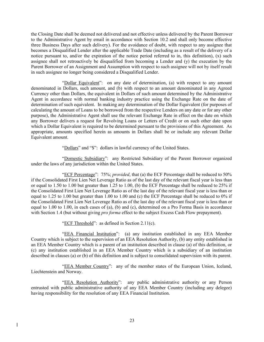 the Closing Date shall be deemed not delivered and not effective unless delivered by the Parent Borrower to the Administrative Agent by email in accordance with Section 10.2 and shall only become effective three Business Days after such delivery). For the avoidance of doubt, with respect to any assignee that becomes a Disqualified Lender after the applicable Trade Date (including as a result of the delivery of a notice pursuant to, and/or the expiration of the notice period referred to in, this definition), (x) such assignee shall not retroactively be disqualified from becoming a Lender and (y) the execution by the Parent Borrower of an Assignment and Assumption with respect to such assignee will not by itself result in such assignee no longer being considered a Disqualified Lender. “Dollar Equivalent”: on any date of determination, (a) with respect to any amount denominated in Dollars, such amount, and (b) with respect to an amount denominated in any Agreed Currency other than Dollars, the equivalent in Dollars of such amount determined by the Administrative Agent in accordance with normal banking industry practice using the Exchange Rate on the date of determination of such equivalent. In making any determination of the Dollar Equivalent (for purposes of calculating the amount of Loans to be borrowed from the respective Lenders on any date or for any other purpose), the Administrative Agent shall use the relevant Exchange Rate in effect on the date on which any Borrower delivers a request for Revolving Loans or Letters of Credit or on such other date upon which a Dollar Equivalent is required to be determined pursuant to the provisions of this Agreement. As appropriate, amounts specified herein as amounts in Dollars shall be or include any relevant Dollar Equivalent amount. “Dollars” and “$”: dollars in lawful currency of the United States. “Domestic Subsidiary”: any Restricted Subsidiary of the Parent Borrower organized under the laws of any jurisdiction within the United States. “ECF Percentage”: 75%; provided, that (a) the ECF Percentage shall be reduced to 50% if the Consolidated First Lien Net Leverage Ratio as of the last day of the relevant fiscal year is less than or equal to 1.50 to 1.00 but greater than 1.25 to 1.00, (b) the ECF Percentage shall be reduced to 25% if the Consolidated First Lien Net Leverage Ratio as of the last day of the relevant fiscal year is less than or equal to 1.25 to 1.00 but greater than 1.00 to 1.00 and (c) the ECF Percentage shall be reduced to 0% if the Consolidated First Lien Net Leverage Ratio as of the last day of the relevant fiscal year is less than or equal to 1.00 to 1.00, in each cases of (a), (b) and (c), determined on a Pro Forma Basis in accordance with Section 1.4 (but without giving pro forma effect to the subject Excess Cash Flow prepayment). “ECF Threshold”: as defined in Section 2.11(c). “EEA Financial Institution”: (a) any institution established in any EEA Member Country which is subject to the supervision of an EEA Resolution Authority, (b) any entity established in an EEA Member Country which is a parent of an institution described in clause (a) of this definition, or (c) any institution established in an EEA Member Country which is a subsidiary of an institution described in clauses (a) or (b) of this definition and is subject to consolidated supervision with its parent. “EEA Member Country”: any of the member states of the European Union, Iceland, Liechtenstein and Norway. “EEA Resolution Authority”: any public administrative authority or any Person entrusted with public administrative authority of any EEA Member Country (including any delegee) having responsibility for the resolution of any EEA Financial Institution. 23