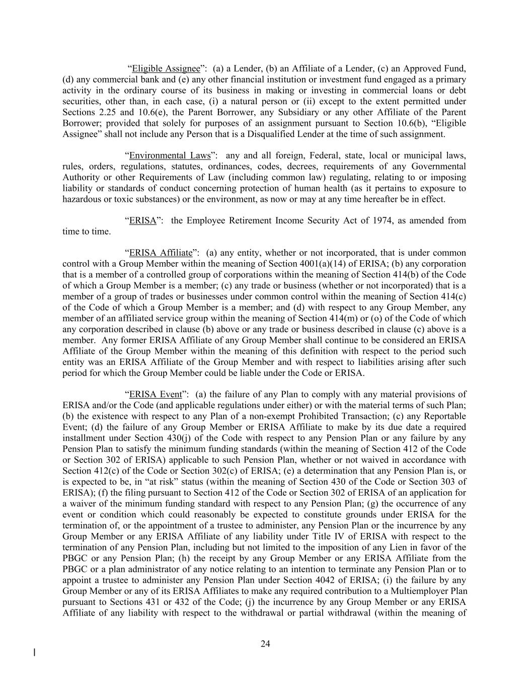 “Eligible Assignee”: (a) a Lender, (b) an Affiliate of a Lender, (c) an Approved Fund, (d) any commercial bank and (e) any other financial institution or investment fund engaged as a primary activity in the ordinary course of its business in making or investing in commercial loans or debt securities, other than, in each case, (i) a natural person or (ii) except to the extent permitted under Sections 2.25 and 10.6(e), the Parent Borrower, any Subsidiary or any other Affiliate of the Parent Borrower; provided that solely for purposes of an assignment pursuant to Section 10.6(b), “Eligible Assignee” shall not include any Person that is a Disqualified Lender at the time of such assignment. “Environmental Laws”: any and all foreign, Federal, state, local or municipal laws, rules, orders, regulations, statutes, ordinances, codes, decrees, requirements of any Governmental Authority or other Requirements of Law (including common law) regulating, relating to or imposing liability or standards of conduct concerning protection of human health (as it pertains to exposure to hazardous or toxic substances) or the environment, as now or may at any time hereafter be in effect. “ERISA”: the Employee Retirement Income Security Act of 1974, as amended from time to time. “ERISA Affiliate”: (a) any entity, whether or not incorporated, that is under common control with a Group Member within the meaning of Section 4001(a)(14) of ERISA; (b) any corporation that is a member of a controlled group of corporations within the meaning of Section 414(b) of the Code of which a Group Member is a member; (c) any trade or business (whether or not incorporated) that is a member of a group of trades or businesses under common control within the meaning of Section 414(c) of the Code of which a Group Member is a member; and (d) with respect to any Group Member, any member of an affiliated service group within the meaning of Section 414(m) or (o) of the Code of which any corporation described in clause (b) above or any trade or business described in clause (c) above is a member. Any former ERISA Affiliate of any Group Member shall continue to be considered an ERISA Affiliate of the Group Member within the meaning of this definition with respect to the period such entity was an ERISA Affiliate of the Group Member and with respect to liabilities arising after such period for which the Group Member could be liable under the Code or ERISA. “ERISA Event”: (a) the failure of any Plan to comply with any material provisions of ERISA and/or the Code (and applicable regulations under either) or with the material terms of such Plan; (b) the existence with respect to any Plan of a non-exempt Prohibited Transaction; (c) any Reportable Event; (d) the failure of any Group Member or ERISA Affiliate to make by its due date a required installment under Section 430(j) of the Code with respect to any Pension Plan or any failure by any Pension Plan to satisfy the minimum funding standards (within the meaning of Section 412 of the Code or Section 302 of ERISA) applicable to such Pension Plan, whether or not waived in accordance with Section 412(c) of the Code or Section 302(c) of ERISA; (e) a determination that any Pension Plan is, or is expected to be, in “at risk” status (within the meaning of Section 430 of the Code or Section 303 of ERISA); (f) the filing pursuant to Section 412 of the Code or Section 302 of ERISA of an application for a waiver of the minimum funding standard with respect to any Pension Plan; (g) the occurrence of any event or condition which could reasonably be expected to constitute grounds under ERISA for the termination of, or the appointment of a trustee to administer, any Pension Plan or the incurrence by any Group Member or any ERISA Affiliate of any liability under Title IV of ERISA with respect to the termination of any Pension Plan, including but not limited to the imposition of any Lien in favor of the PBGC or any Pension Plan; (h) the receipt by any Group Member or any ERISA Affiliate from the PBGC or a plan administrator of any notice relating to an intention to terminate any Pension Plan or to appoint a trustee to administer any Pension Plan under Section 4042 of ERISA; (i) the failure by any Group Member or any of its ERISA Affiliates to make any required contribution to a Multiemployer Plan pursuant to Sections 431 or 432 of the Code; (j) the incurrence by any Group Member or any ERISA Affiliate of any liability with respect to the withdrawal or partial withdrawal (within the meaning of 24