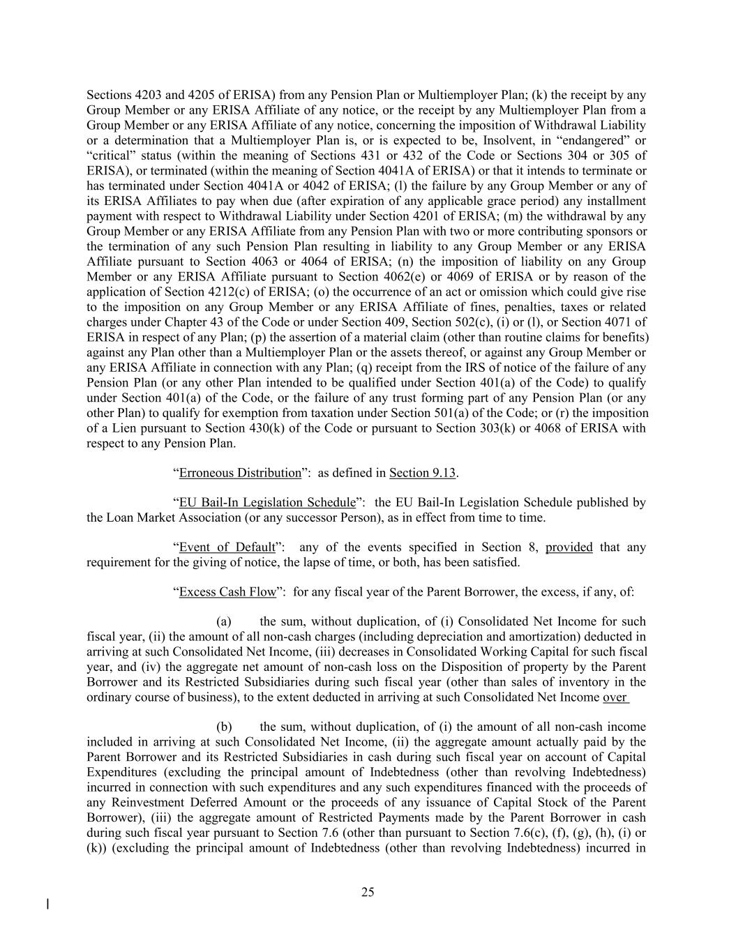 Sections 4203 and 4205 of ERISA) from any Pension Plan or Multiemployer Plan; (k) the receipt by any Group Member or any ERISA Affiliate of any notice, or the receipt by any Multiemployer Plan from a Group Member or any ERISA Affiliate of any notice, concerning the imposition of Withdrawal Liability or a determination that a Multiemployer Plan is, or is expected to be, Insolvent, in “endangered” or “critical” status (within the meaning of Sections 431 or 432 of the Code or Sections 304 or 305 of ERISA), or terminated (within the meaning of Section 4041A of ERISA) or that it intends to terminate or has terminated under Section 4041A or 4042 of ERISA; (l) the failure by any Group Member or any of its ERISA Affiliates to pay when due (after expiration of any applicable grace period) any installment payment with respect to Withdrawal Liability under Section 4201 of ERISA; (m) the withdrawal by any Group Member or any ERISA Affiliate from any Pension Plan with two or more contributing sponsors or the termination of any such Pension Plan resulting in liability to any Group Member or any ERISA Affiliate pursuant to Section 4063 or 4064 of ERISA; (n) the imposition of liability on any Group Member or any ERISA Affiliate pursuant to Section 4062(e) or 4069 of ERISA or by reason of the application of Section 4212(c) of ERISA; (o) the occurrence of an act or omission which could give rise to the imposition on any Group Member or any ERISA Affiliate of fines, penalties, taxes or related charges under Chapter 43 of the Code or under Section 409, Section 502(c), (i) or (l), or Section 4071 of ERISA in respect of any Plan; (p) the assertion of a material claim (other than routine claims for benefits) against any Plan other than a Multiemployer Plan or the assets thereof, or against any Group Member or any ERISA Affiliate in connection with any Plan; (q) receipt from the IRS of notice of the failure of any Pension Plan (or any other Plan intended to be qualified under Section 401(a) of the Code) to qualify under Section 401(a) of the Code, or the failure of any trust forming part of any Pension Plan (or any other Plan) to qualify for exemption from taxation under Section 501(a) of the Code; or (r) the imposition of a Lien pursuant to Section 430(k) of the Code or pursuant to Section 303(k) or 4068 of ERISA with respect to any Pension Plan. “Erroneous Distribution”: as defined in Section 9.13. “EU Bail-In Legislation Schedule”: the EU Bail-In Legislation Schedule published by the Loan Market Association (or any successor Person), as in effect from time to time. “Event of Default”: any of the events specified in Section 8, provided that any requirement for the giving of notice, the lapse of time, or both, has been satisfied. “Excess Cash Flow”: for any fiscal year of the Parent Borrower, the excess, if any, of: (a) the sum, without duplication, of (i) Consolidated Net Income for such fiscal year, (ii) the amount of all non-cash charges (including depreciation and amortization) deducted in arriving at such Consolidated Net Income, (iii) decreases in Consolidated Working Capital for such fiscal year, and (iv) the aggregate net amount of non-cash loss on the Disposition of property by the Parent Borrower and its Restricted Subsidiaries during such fiscal year (other than sales of inventory in the ordinary course of business), to the extent deducted in arriving at such Consolidated Net Income over (b) the sum, without duplication, of (i) the amount of all non-cash income included in arriving at such Consolidated Net Income, (ii) the aggregate amount actually paid by the Parent Borrower and its Restricted Subsidiaries in cash during such fiscal year on account of Capital Expenditures (excluding the principal amount of Indebtedness (other than revolving Indebtedness) incurred in connection with such expenditures and any such expenditures financed with the proceeds of any Reinvestment Deferred Amount or the proceeds of any issuance of Capital Stock of the Parent Borrower), (iii) the aggregate amount of Restricted Payments made by the Parent Borrower in cash during such fiscal year pursuant to Section 7.6 (other than pursuant to Section 7.6(c), (f), (g), (h), (i) or (k)) (excluding the principal amount of Indebtedness (other than revolving Indebtedness) incurred in 25