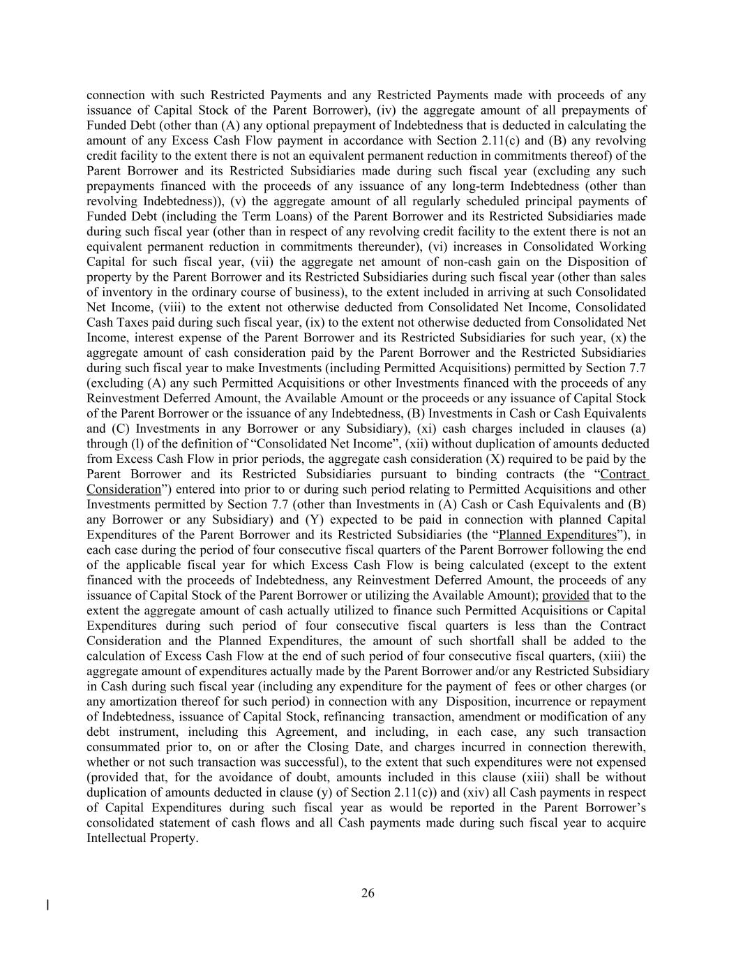 connection with such Restricted Payments and any Restricted Payments made with proceeds of any issuance of Capital Stock of the Parent Borrower), (iv) the aggregate amount of all prepayments of Funded Debt (other than (A) any optional prepayment of Indebtedness that is deducted in calculating the amount of any Excess Cash Flow payment in accordance with Section 2.11(c) and (B) any revolving credit facility to the extent there is not an equivalent permanent reduction in commitments thereof) of the Parent Borrower and its Restricted Subsidiaries made during such fiscal year (excluding any such prepayments financed with the proceeds of any issuance of any long-term Indebtedness (other than revolving Indebtedness)), (v) the aggregate amount of all regularly scheduled principal payments of Funded Debt (including the Term Loans) of the Parent Borrower and its Restricted Subsidiaries made during such fiscal year (other than in respect of any revolving credit facility to the extent there is not an equivalent permanent reduction in commitments thereunder), (vi) increases in Consolidated Working Capital for such fiscal year, (vii) the aggregate net amount of non-cash gain on the Disposition of property by the Parent Borrower and its Restricted Subsidiaries during such fiscal year (other than sales of inventory in the ordinary course of business), to the extent included in arriving at such Consolidated Net Income, (viii) to the extent not otherwise deducted from Consolidated Net Income, Consolidated Cash Taxes paid during such fiscal year, (ix) to the extent not otherwise deducted from Consolidated Net Income, interest expense of the Parent Borrower and its Restricted Subsidiaries for such year, (x) the aggregate amount of cash consideration paid by the Parent Borrower and the Restricted Subsidiaries during such fiscal year to make Investments (including Permitted Acquisitions) permitted by Section 7.7 (excluding (A) any such Permitted Acquisitions or other Investments financed with the proceeds of any Reinvestment Deferred Amount, the Available Amount or the proceeds or any issuance of Capital Stock of the Parent Borrower or the issuance of any Indebtedness, (B) Investments in Cash or Cash Equivalents and (C) Investments in any Borrower or any Subsidiary), (xi) cash charges included in clauses (a) through (l) of the definition of “Consolidated Net Income”, (xii) without duplication of amounts deducted from Excess Cash Flow in prior periods, the aggregate cash consideration (X) required to be paid by the Parent Borrower and its Restricted Subsidiaries pursuant to binding contracts (the “Contract Consideration”) entered into prior to or during such period relating to Permitted Acquisitions and other Investments permitted by Section 7.7 (other than Investments in (A) Cash or Cash Equivalents and (B) any Borrower or any Subsidiary) and (Y) expected to be paid in connection with planned Capital Expenditures of the Parent Borrower and its Restricted Subsidiaries (the “Planned Expenditures”), in each case during the period of four consecutive fiscal quarters of the Parent Borrower following the end of the applicable fiscal year for which Excess Cash Flow is being calculated (except to the extent financed with the proceeds of Indebtedness, any Reinvestment Deferred Amount, the proceeds of any issuance of Capital Stock of the Parent Borrower or utilizing the Available Amount); provided that to the extent the aggregate amount of cash actually utilized to finance such Permitted Acquisitions or Capital Expenditures during such period of four consecutive fiscal quarters is less than the Contract Consideration and the Planned Expenditures, the amount of such shortfall shall be added to the calculation of Excess Cash Flow at the end of such period of four consecutive fiscal quarters, (xiii) the aggregate amount of expenditures actually made by the Parent Borrower and/or any Restricted Subsidiary in Cash during such fiscal year (including any expenditure for the payment of fees or other charges (or any amortization thereof for such period) in connection with any Disposition, incurrence or repayment of Indebtedness, issuance of Capital Stock, refinancing transaction, amendment or modification of any debt instrument, including this Agreement, and including, in each case, any such transaction consummated prior to, on or after the Closing Date, and charges incurred in connection therewith, whether or not such transaction was successful), to the extent that such expenditures were not expensed (provided that, for the avoidance of doubt, amounts included in this clause (xiii) shall be without duplication of amounts deducted in clause (y) of Section 2.11(c)) and (xiv) all Cash payments in respect of Capital Expenditures during such fiscal year as would be reported in the Parent Borrower’s consolidated statement of cash flows and all Cash payments made during such fiscal year to acquire Intellectual Property. 26