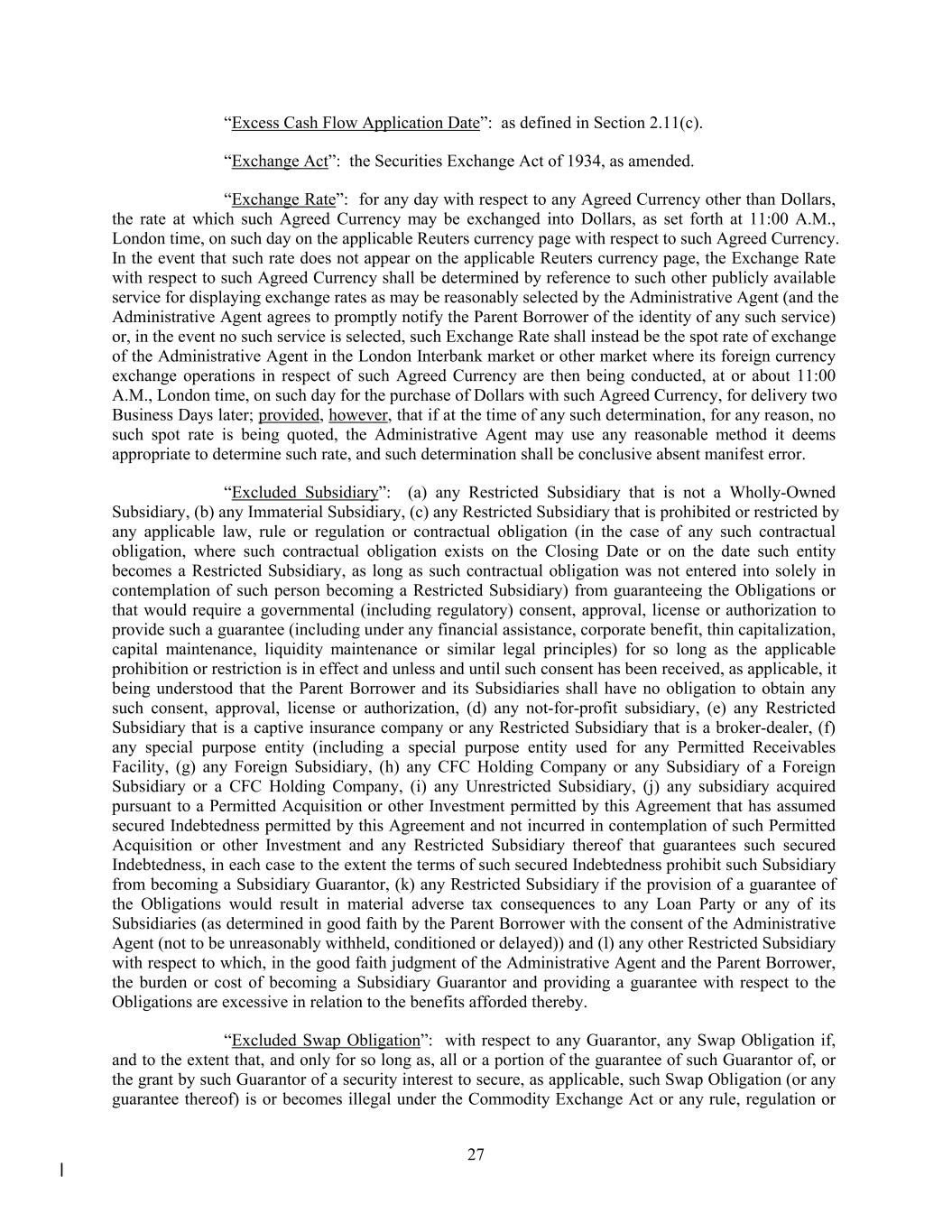“Excess Cash Flow Application Date”: as defined in Section 2.11(c). “Exchange Act”: the Securities Exchange Act of 1934, as amended. “Exchange Rate”: for any day with respect to any Agreed Currency other than Dollars, the rate at which such Agreed Currency may be exchanged into Dollars, as set forth at 11:00 A.M., London time, on such day on the applicable Reuters currency page with respect to such Agreed Currency. In the event that such rate does not appear on the applicable Reuters currency page, the Exchange Rate with respect to such Agreed Currency shall be determined by reference to such other publicly available service for displaying exchange rates as may be reasonably selected by the Administrative Agent (and the Administrative Agent agrees to promptly notify the Parent Borrower of the identity of any such service) or, in the event no such service is selected, such Exchange Rate shall instead be the spot rate of exchange of the Administrative Agent in the London Interbank market or other market where its foreign currency exchange operations in respect of such Agreed Currency are then being conducted, at or about 11:00 A.M., London time, on such day for the purchase of Dollars with such Agreed Currency, for delivery two Business Days later; provided, however, that if at the time of any such determination, for any reason, no such spot rate is being quoted, the Administrative Agent may use any reasonable method it deems appropriate to determine such rate, and such determination shall be conclusive absent manifest error. “Excluded Subsidiary”: (a) any Restricted Subsidiary that is not a Wholly-Owned Subsidiary, (b) any Immaterial Subsidiary, (c) any Restricted Subsidiary that is prohibited or restricted by any applicable law, rule or regulation or contractual obligation (in the case of any such contractual obligation, where such contractual obligation exists on the Closing Date or on the date such entity becomes a Restricted Subsidiary, as long as such contractual obligation was not entered into solely in contemplation of such person becoming a Restricted Subsidiary) from guaranteeing the Obligations or that would require a governmental (including regulatory) consent, approval, license or authorization to provide such a guarantee (including under any financial assistance, corporate benefit, thin capitalization, capital maintenance, liquidity maintenance or similar legal principles) for so long as the applicable prohibition or restriction is in effect and unless and until such consent has been received, as applicable, it being understood that the Parent Borrower and its Subsidiaries shall have no obligation to obtain any such consent, approval, license or authorization, (d) any not-for-profit subsidiary, (e) any Restricted Subsidiary that is a captive insurance company or any Restricted Subsidiary that is a broker-dealer, (f) any special purpose entity (including a special purpose entity used for any Permitted Receivables Facility, (g) any Foreign Subsidiary, (h) any CFC Holding Company or any Subsidiary of a Foreign Subsidiary or a CFC Holding Company, (i) any Unrestricted Subsidiary, (j) any subsidiary acquired pursuant to a Permitted Acquisition or other Investment permitted by this Agreement that has assumed secured Indebtedness permitted by this Agreement and not incurred in contemplation of such Permitted Acquisition or other Investment and any Restricted Subsidiary thereof that guarantees such secured Indebtedness, in each case to the extent the terms of such secured Indebtedness prohibit such Subsidiary from becoming a Subsidiary Guarantor, (k) any Restricted Subsidiary if the provision of a guarantee of the Obligations would result in material adverse tax consequences to any Loan Party or any of its Subsidiaries (as determined in good faith by the Parent Borrower with the consent of the Administrative Agent (not to be unreasonably withheld, conditioned or delayed)) and (l) any other Restricted Subsidiary with respect to which, in the good faith judgment of the Administrative Agent and the Parent Borrower, the burden or cost of becoming a Subsidiary Guarantor and providing a guarantee with respect to the Obligations are excessive in relation to the benefits afforded thereby. “Excluded Swap Obligation”: with respect to any Guarantor, any Swap Obligation if, and to the extent that, and only for so long as, all or a portion of the guarantee of such Guarantor of, or the grant by such Guarantor of a security interest to secure, as applicable, such Swap Obligation (or any guarantee thereof) is or becomes illegal under the Commodity Exchange Act or any rule, regulation or 27