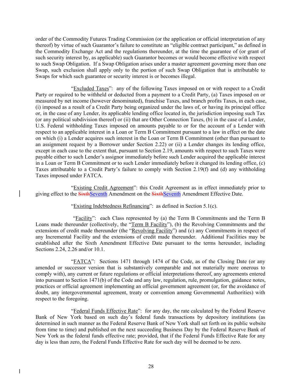 order of the Commodity Futures Trading Commission (or the application or official interpretation of any thereof) by virtue of such Guarantor’s failure to constitute an “eligible contract participant,” as defined in the Commodity Exchange Act and the regulations thereunder, at the time the guarantee of (or grant of such security interest by, as applicable) such Guarantor becomes or would become effective with respect to such Swap Obligation. If a Swap Obligation arises under a master agreement governing more than one Swap, such exclusion shall apply only to the portion of such Swap Obligation that is attributable to Swaps for which such guarantee or security interest is or becomes illegal. “Excluded Taxes”: any of the following Taxes imposed on or with respect to a Credit Party or required to be withheld or deducted from a payment to a Credit Party, (a) Taxes imposed on or measured by net income (however denominated), franchise Taxes, and branch profits Taxes, in each case, (i) imposed as a result of a Credit Party being organized under the laws of, or having its principal office or, in the case of any Lender, its applicable lending office located in, the jurisdiction imposing such Tax (or any political subdivision thereof) or (ii) that are Other Connection Taxes, (b) in the case of a Lender, U.S. Federal withholding Taxes imposed on amounts payable to or for the account of a Lender with respect to an applicable interest in a Loan or Term B Commitment pursuant to a law in effect on the date on which (i) a Lender acquires such interest in the Loan or Term B Commitment (other than pursuant to an assignment request by a Borrower under Section 2.22) or (ii) a Lender changes its lending office, except in each case to the extent that, pursuant to Section 2.19, amounts with respect to such Taxes were payable either to such Lender’s assignor immediately before such Lender acquired the applicable interest in a Loan or Term B Commitment or to such Lender immediately before it changed its lending office, (c) Taxes attributable to a Credit Party’s failure to comply with Section 2.19(f) and (d) any withholding Taxes imposed under FATCA. “Existing Credit Agreement”: this Credit Agreement as in effect immediately prior to giving effect to the SixthSeventh Amendment on the SixthSeventh Amendment Effective Date. “Existing Indebtedness Refinancing”: as defined in Section 5.1(c). “Facility”: each Class represented by (a) the Term B Commitments and the Term B Loans made thereunder (collectively, the “Term B Facility”), (b) the Revolving Commitments and the extensions of credit made thereunder (the “Revolving Facility”) and (c) any Commitments in respect of any Incremental Facility and the extensions of credit made thereunder. Additional Facilities may be established after the Sixth Amendment Effective Date pursuant to the terms hereunder, including Sections 2.24, 2.26 and/or 10.1. “FATCA”: Sections 1471 through 1474 of the Code, as of the Closing Date (or any amended or successor version that is substantively comparable and not materially more onerous to comply with), any current or future regulations or official interpretations thereof, any agreements entered into pursuant to Section 1471(b) of the Code and any law, regulation, rule, promulgation, guidance notes, practices or official agreement implementing an official government agreement (or, for the avoidance of doubt, any intergovernmental agreement, treaty or convention among Governmental Authorities) with respect to the foregoing. “Federal Funds Effective Rate”: for any day, the rate calculated by the Federal Reserve Bank of New York based on such day’s federal funds transactions by depository institutions (as determined in such manner as the Federal Reserve Bank of New York shall set forth on its public website from time to time) and published on the next succeeding Business Day by the Federal Reserve Bank of New York as the federal funds effective rate; provided, that if the Federal Funds Effective Rate for any day is less than zero, the Federal Funds Effective Rate for such day will be deemed to be zero. 28