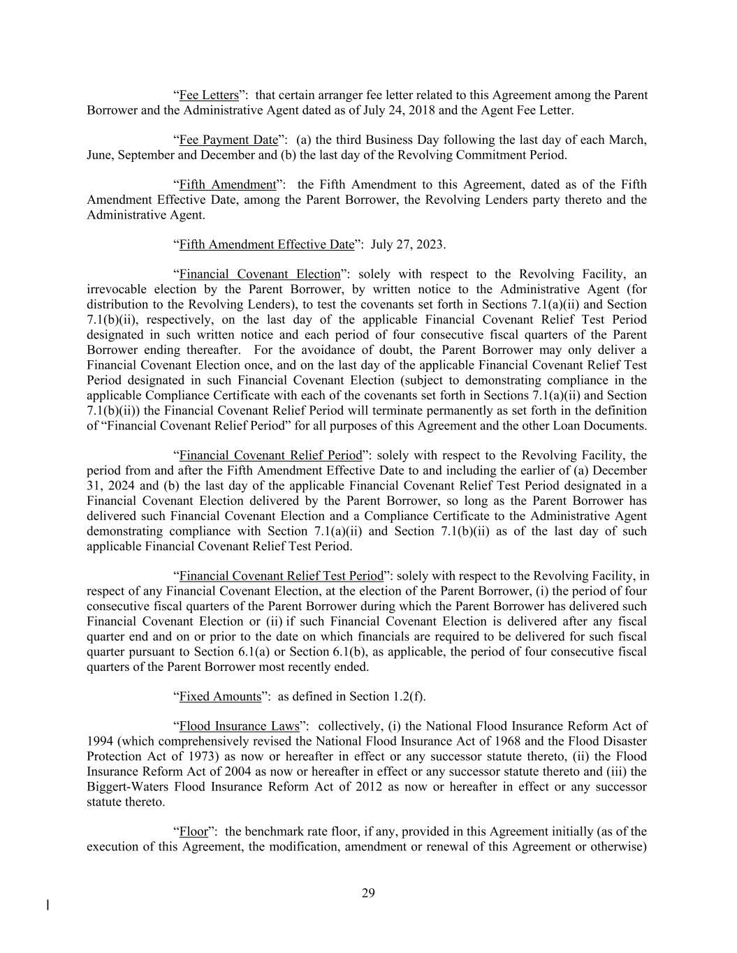 “Fee Letters”: that certain arranger fee letter related to this Agreement among the Parent Borrower and the Administrative Agent dated as of July 24, 2018 and the Agent Fee Letter. “Fee Payment Date”: (a) the third Business Day following the last day of each March, June, September and December and (b) the last day of the Revolving Commitment Period. “Fifth Amendment”: the Fifth Amendment to this Agreement, dated as of the Fifth Amendment Effective Date, among the Parent Borrower, the Revolving Lenders party thereto and the Administrative Agent. “Fifth Amendment Effective Date”: July 27, 2023. “Financial Covenant Election”: solely with respect to the Revolving Facility, an irrevocable election by the Parent Borrower, by written notice to the Administrative Agent (for distribution to the Revolving Lenders), to test the covenants set forth in Sections 7.1(a)(ii) and Section 7.1(b)(ii), respectively, on the last day of the applicable Financial Covenant Relief Test Period designated in such written notice and each period of four consecutive fiscal quarters of the Parent Borrower ending thereafter. For the avoidance of doubt, the Parent Borrower may only deliver a Financial Covenant Election once, and on the last day of the applicable Financial Covenant Relief Test Period designated in such Financial Covenant Election (subject to demonstrating compliance in the applicable Compliance Certificate with each of the covenants set forth in Sections 7.1(a)(ii) and Section 7.1(b)(ii)) the Financial Covenant Relief Period will terminate permanently as set forth in the definition of “Financial Covenant Relief Period” for all purposes of this Agreement and the other Loan Documents. “Financial Covenant Relief Period”: solely with respect to the Revolving Facility, the period from and after the Fifth Amendment Effective Date to and including the earlier of (a) December 31, 2024 and (b) the last day of the applicable Financial Covenant Relief Test Period designated in a Financial Covenant Election delivered by the Parent Borrower, so long as the Parent Borrower has delivered such Financial Covenant Election and a Compliance Certificate to the Administrative Agent demonstrating compliance with Section 7.1(a)(ii) and Section 7.1(b)(ii) as of the last day of such applicable Financial Covenant Relief Test Period. “Financial Covenant Relief Test Period”: solely with respect to the Revolving Facility, in respect of any Financial Covenant Election, at the election of the Parent Borrower, (i) the period of four consecutive fiscal quarters of the Parent Borrower during which the Parent Borrower has delivered such Financial Covenant Election or (ii) if such Financial Covenant Election is delivered after any fiscal quarter end and on or prior to the date on which financials are required to be delivered for such fiscal quarter pursuant to Section 6.1(a) or Section 6.1(b), as applicable, the period of four consecutive fiscal quarters of the Parent Borrower most recently ended. “Fixed Amounts”: as defined in Section 1.2(f). “Flood Insurance Laws”: collectively, (i) the National Flood Insurance Reform Act of 1994 (which comprehensively revised the National Flood Insurance Act of 1968 and the Flood Disaster Protection Act of 1973) as now or hereafter in effect or any successor statute thereto, (ii) the Flood Insurance Reform Act of 2004 as now or hereafter in effect or any successor statute thereto and (iii) the Biggert-Waters Flood Insurance Reform Act of 2012 as now or hereafter in effect or any successor statute thereto. “Floor”: the benchmark rate floor, if any, provided in this Agreement initially (as of the execution of this Agreement, the modification, amendment or renewal of this Agreement or otherwise) 29