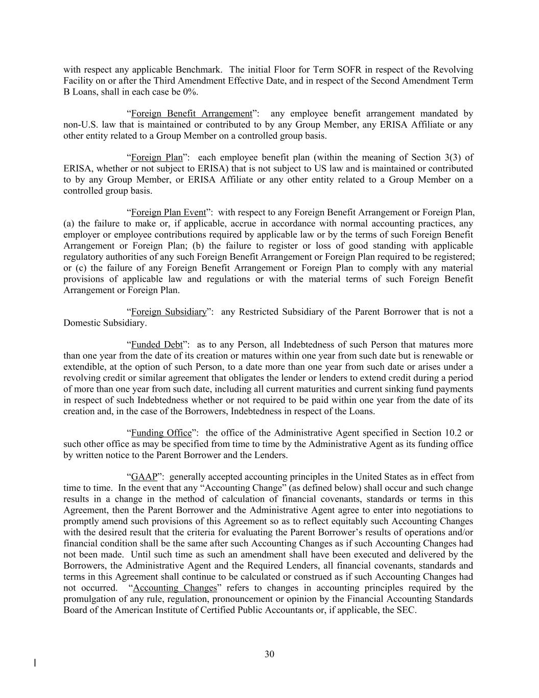 with respect any applicable Benchmark. The initial Floor for Term SOFR in respect of the Revolving Facility on or after the Third Amendment Effective Date, and in respect of the Second Amendment Term B Loans, shall in each case be 0%. “Foreign Benefit Arrangement”: any employee benefit arrangement mandated by non-U.S. law that is maintained or contributed to by any Group Member, any ERISA Affiliate or any other entity related to a Group Member on a controlled group basis. “Foreign Plan”: each employee benefit plan (within the meaning of Section 3(3) of ERISA, whether or not subject to ERISA) that is not subject to US law and is maintained or contributed to by any Group Member, or ERISA Affiliate or any other entity related to a Group Member on a controlled group basis. “Foreign Plan Event”: with respect to any Foreign Benefit Arrangement or Foreign Plan, (a) the failure to make or, if applicable, accrue in accordance with normal accounting practices, any employer or employee contributions required by applicable law or by the terms of such Foreign Benefit Arrangement or Foreign Plan; (b) the failure to register or loss of good standing with applicable regulatory authorities of any such Foreign Benefit Arrangement or Foreign Plan required to be registered; or (c) the failure of any Foreign Benefit Arrangement or Foreign Plan to comply with any material provisions of applicable law and regulations or with the material terms of such Foreign Benefit Arrangement or Foreign Plan. “Foreign Subsidiary”: any Restricted Subsidiary of the Parent Borrower that is not a Domestic Subsidiary. “Funded Debt”: as to any Person, all Indebtedness of such Person that matures more than one year from the date of its creation or matures within one year from such date but is renewable or extendible, at the option of such Person, to a date more than one year from such date or arises under a revolving credit or similar agreement that obligates the lender or lenders to extend credit during a period of more than one year from such date, including all current maturities and current sinking fund payments in respect of such Indebtedness whether or not required to be paid within one year from the date of its creation and, in the case of the Borrowers, Indebtedness in respect of the Loans. “Funding Office”: the office of the Administrative Agent specified in Section 10.2 or such other office as may be specified from time to time by the Administrative Agent as its funding office by written notice to the Parent Borrower and the Lenders. “GAAP”: generally accepted accounting principles in the United States as in effect from time to time. In the event that any “Accounting Change” (as defined below) shall occur and such change results in a change in the method of calculation of financial covenants, standards or terms in this Agreement, then the Parent Borrower and the Administrative Agent agree to enter into negotiations to promptly amend such provisions of this Agreement so as to reflect equitably such Accounting Changes with the desired result that the criteria for evaluating the Parent Borrower’s results of operations and/or financial condition shall be the same after such Accounting Changes as if such Accounting Changes had not been made. Until such time as such an amendment shall have been executed and delivered by the Borrowers, the Administrative Agent and the Required Lenders, all financial covenants, standards and terms in this Agreement shall continue to be calculated or construed as if such Accounting Changes had not occurred. “Accounting Changes” refers to changes in accounting principles required by the promulgation of any rule, regulation, pronouncement or opinion by the Financial Accounting Standards Board of the American Institute of Certified Public Accountants or, if applicable, the SEC. 30
