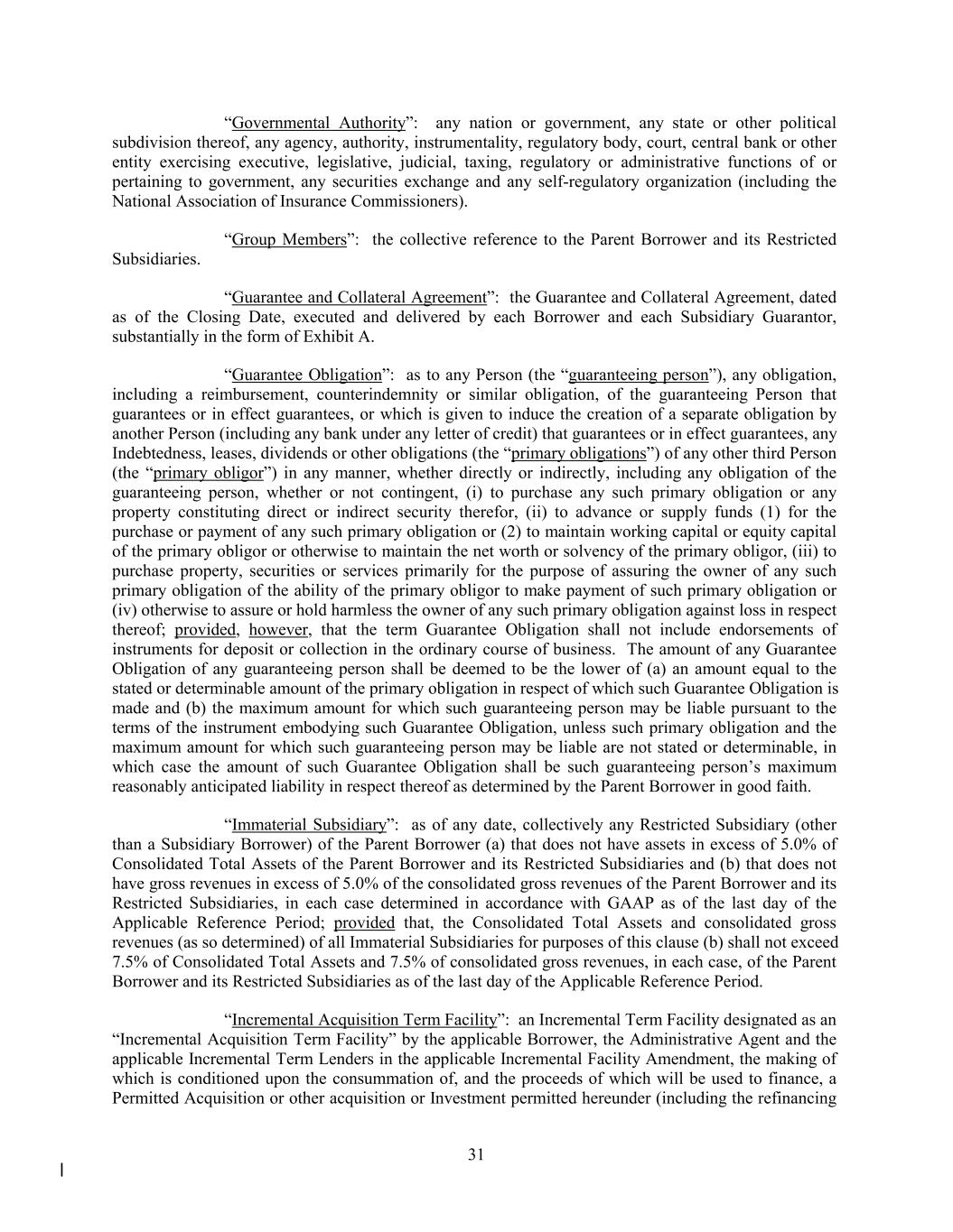 “Governmental Authority”: any nation or government, any state or other political subdivision thereof, any agency, authority, instrumentality, regulatory body, court, central bank or other entity exercising executive, legislative, judicial, taxing, regulatory or administrative functions of or pertaining to government, any securities exchange and any self-regulatory organization (including the National Association of Insurance Commissioners). “Group Members”: the collective reference to the Parent Borrower and its Restricted Subsidiaries. “Guarantee and Collateral Agreement”: the Guarantee and Collateral Agreement, dated as of the Closing Date, executed and delivered by each Borrower and each Subsidiary Guarantor, substantially in the form of Exhibit A. “Guarantee Obligation”: as to any Person (the “guaranteeing person”), any obligation, including a reimbursement, counterindemnity or similar obligation, of the guaranteeing Person that guarantees or in effect guarantees, or which is given to induce the creation of a separate obligation by another Person (including any bank under any letter of credit) that guarantees or in effect guarantees, any Indebtedness, leases, dividends or other obligations (the “primary obligations”) of any other third Person (the “primary obligor”) in any manner, whether directly or indirectly, including any obligation of the guaranteeing person, whether or not contingent, (i) to purchase any such primary obligation or any property constituting direct or indirect security therefor, (ii) to advance or supply funds (1) for the purchase or payment of any such primary obligation or (2) to maintain working capital or equity capital of the primary obligor or otherwise to maintain the net worth or solvency of the primary obligor, (iii) to purchase property, securities or services primarily for the purpose of assuring the owner of any such primary obligation of the ability of the primary obligor to make payment of such primary obligation or (iv) otherwise to assure or hold harmless the owner of any such primary obligation against loss in respect thereof; provided, however, that the term Guarantee Obligation shall not include endorsements of instruments for deposit or collection in the ordinary course of business. The amount of any Guarantee Obligation of any guaranteeing person shall be deemed to be the lower of (a) an amount equal to the stated or determinable amount of the primary obligation in respect of which such Guarantee Obligation is made and (b) the maximum amount for which such guaranteeing person may be liable pursuant to the terms of the instrument embodying such Guarantee Obligation, unless such primary obligation and the maximum amount for which such guaranteeing person may be liable are not stated or determinable, in which case the amount of such Guarantee Obligation shall be such guaranteeing person’s maximum reasonably anticipated liability in respect thereof as determined by the Parent Borrower in good faith. “Immaterial Subsidiary”: as of any date, collectively any Restricted Subsidiary (other than a Subsidiary Borrower) of the Parent Borrower (a) that does not have assets in excess of 5.0% of Consolidated Total Assets of the Parent Borrower and its Restricted Subsidiaries and (b) that does not have gross revenues in excess of 5.0% of the consolidated gross revenues of the Parent Borrower and its Restricted Subsidiaries, in each case determined in accordance with GAAP as of the last day of the Applicable Reference Period; provided that, the Consolidated Total Assets and consolidated gross revenues (as so determined) of all Immaterial Subsidiaries for purposes of this clause (b) shall not exceed 7.5% of Consolidated Total Assets and 7.5% of consolidated gross revenues, in each case, of the Parent Borrower and its Restricted Subsidiaries as of the last day of the Applicable Reference Period. “Incremental Acquisition Term Facility”: an Incremental Term Facility designated as an “Incremental Acquisition Term Facility” by the applicable Borrower, the Administrative Agent and the applicable Incremental Term Lenders in the applicable Incremental Facility Amendment, the making of which is conditioned upon the consummation of, and the proceeds of which will be used to finance, a Permitted Acquisition or other acquisition or Investment permitted hereunder (including the refinancing 31