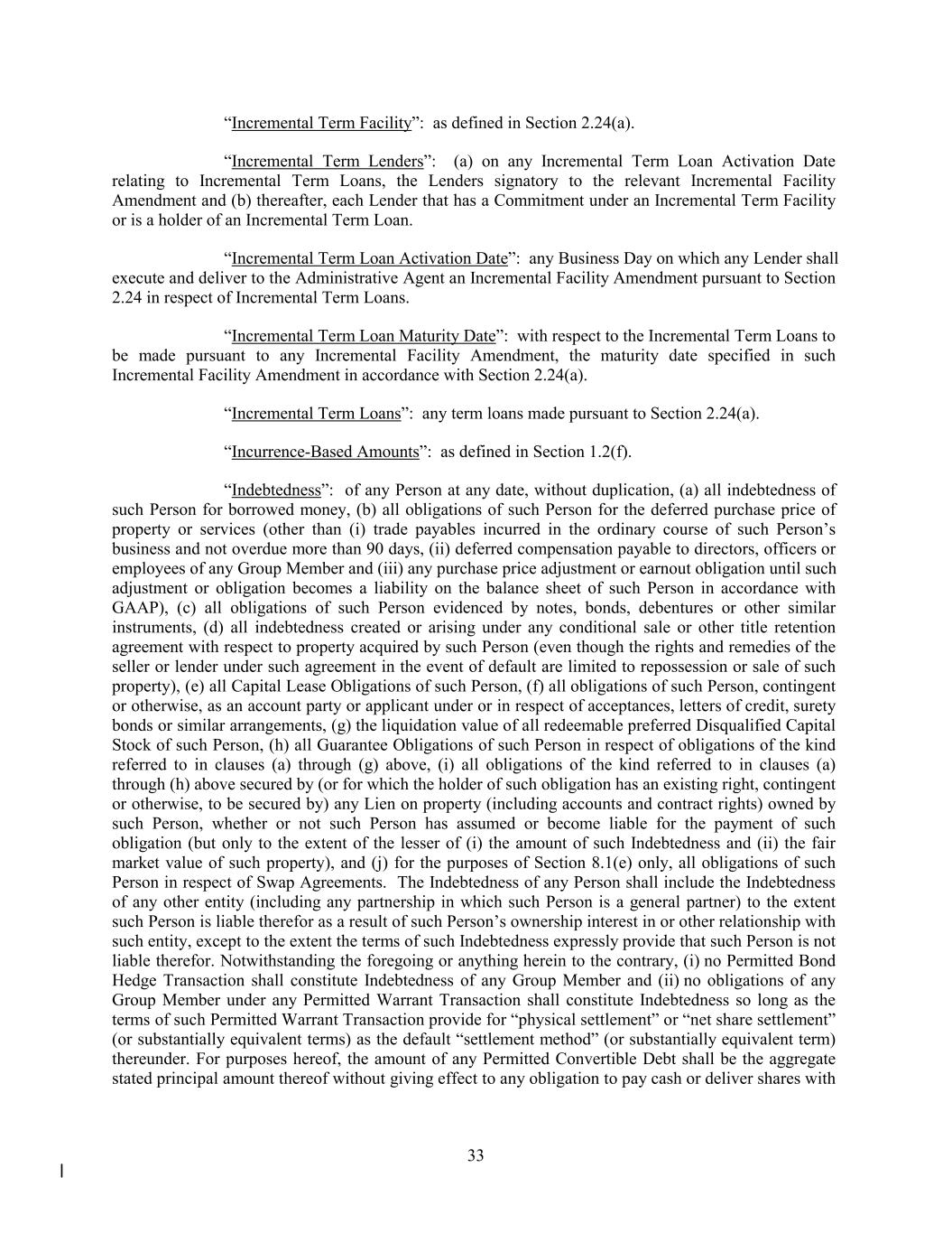 “Incremental Term Facility”: as defined in Section 2.24(a). “Incremental Term Lenders”: (a) on any Incremental Term Loan Activation Date relating to Incremental Term Loans, the Lenders signatory to the relevant Incremental Facility Amendment and (b) thereafter, each Lender that has a Commitment under an Incremental Term Facility or is a holder of an Incremental Term Loan. “Incremental Term Loan Activation Date”: any Business Day on which any Lender shall execute and deliver to the Administrative Agent an Incremental Facility Amendment pursuant to Section 2.24 in respect of Incremental Term Loans. “Incremental Term Loan Maturity Date”: with respect to the Incremental Term Loans to be made pursuant to any Incremental Facility Amendment, the maturity date specified in such Incremental Facility Amendment in accordance with Section 2.24(a). “Incremental Term Loans”: any term loans made pursuant to Section 2.24(a). “Incurrence-Based Amounts”: as defined in Section 1.2(f). “Indebtedness”: of any Person at any date, without duplication, (a) all indebtedness of such Person for borrowed money, (b) all obligations of such Person for the deferred purchase price of property or services (other than (i) trade payables incurred in the ordinary course of such Person’s business and not overdue more than 90 days, (ii) deferred compensation payable to directors, officers or employees of any Group Member and (iii) any purchase price adjustment or earnout obligation until such adjustment or obligation becomes a liability on the balance sheet of such Person in accordance with GAAP), (c) all obligations of such Person evidenced by notes, bonds, debentures or other similar instruments, (d) all indebtedness created or arising under any conditional sale or other title retention agreement with respect to property acquired by such Person (even though the rights and remedies of the seller or lender under such agreement in the event of default are limited to repossession or sale of such property), (e) all Capital Lease Obligations of such Person, (f) all obligations of such Person, contingent or otherwise, as an account party or applicant under or in respect of acceptances, letters of credit, surety bonds or similar arrangements, (g) the liquidation value of all redeemable preferred Disqualified Capital Stock of such Person, (h) all Guarantee Obligations of such Person in respect of obligations of the kind referred to in clauses (a) through (g) above, (i) all obligations of the kind referred to in clauses (a) through (h) above secured by (or for which the holder of such obligation has an existing right, contingent or otherwise, to be secured by) any Lien on property (including accounts and contract rights) owned by such Person, whether or not such Person has assumed or become liable for the payment of such obligation (but only to the extent of the lesser of (i) the amount of such Indebtedness and (ii) the fair market value of such property), and (j) for the purposes of Section 8.1(e) only, all obligations of such Person in respect of Swap Agreements. The Indebtedness of any Person shall include the Indebtedness of any other entity (including any partnership in which such Person is a general partner) to the extent such Person is liable therefor as a result of such Person’s ownership interest in or other relationship with such entity, except to the extent the terms of such Indebtedness expressly provide that such Person is not liable therefor. Notwithstanding the foregoing or anything herein to the contrary, (i) no Permitted Bond Hedge Transaction shall constitute Indebtedness of any Group Member and (ii) no obligations of any Group Member under any Permitted Warrant Transaction shall constitute Indebtedness so long as the terms of such Permitted Warrant Transaction provide for “physical settlement” or “net share settlement” (or substantially equivalent terms) as the default “settlement method” (or substantially equivalent term) thereunder. For purposes hereof, the amount of any Permitted Convertible Debt shall be the aggregate stated principal amount thereof without giving effect to any obligation to pay cash or deliver shares with 33