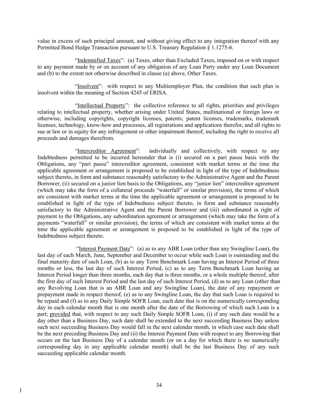 value in excess of such principal amount, and without giving effect to any integration thereof with any Permitted Bond Hedge Transaction pursuant to U.S. Treasury Regulation § 1.1275-6. “Indemnified Taxes”: (a) Taxes, other than Excluded Taxes, imposed on or with respect to any payment made by or on account of any obligation of any Loan Party under any Loan Document and (b) to the extent not otherwise described in clause (a) above, Other Taxes. “Insolvent”: with respect to any Multiemployer Plan, the condition that such plan is insolvent within the meaning of Section 4245 of ERISA. “Intellectual Property”: the collective reference to all rights, priorities and privileges relating to intellectual property, whether arising under United States, multinational or foreign laws or otherwise, including copyrights, copyright licenses, patents, patent licenses, trademarks, trademark licenses, technology, know-how and processes, all registrations and applications therefor, and all rights to sue at law or in equity for any infringement or other impairment thereof, including the right to receive all proceeds and damages therefrom. “Intercreditor Agreement”: individually and collectively, with respect to any Indebtedness permitted to be incurred hereunder that is (i) secured on a pari passu basis with the Obligations, any “pari passu” intercreditor agreement, consistent with market terms at the time the applicable agreement or arrangement is proposed to be established in light of the type of Indebtedness subject thereto, in form and substance reasonably satisfactory to the Administrative Agent and the Parent Borrower, (ii) secured on a junior lien basis to the Obligations, any “junior lien” intercreditor agreement (which may take the form of a collateral proceeds “waterfall” or similar provision), the terms of which are consistent with market terms at the time the applicable agreement or arrangement is proposed to be established in light of the type of Indebtedness subject thereto, in form and substance reasonably satisfactory to the Administrative Agent and the Parent Borrower and (iii) subordinated in right of payment to the Obligations, any subordination agreement or arrangement (which may take the form of a payments “waterfall” or similar provision), the terms of which are consistent with market terms at the time the applicable agreement or arrangement is proposed to be established in light of the type of Indebtedness subject thereto. “Interest Payment Date”: (a) as to any ABR Loan (other than any Swingline Loan), the last day of each March, June, September and December to occur while such Loan is outstanding and the final maturity date of such Loan, (b) as to any Term Benchmark Loan having an Interest Period of three months or less, the last day of such Interest Period, (c) as to any Term Benchmark Loan having an Interest Period longer than three months, each day that is three months, or a whole multiple thereof, after the first day of such Interest Period and the last day of such Interest Period, (d) as to any Loan (other than any Revolving Loan that is an ABR Loan and any Swingline Loan), the date of any repayment or prepayment made in respect thereof, (e) as to any Swingline Loan, the day that such Loan is required to be repaid and (f) as to any Daily Simple SOFR Loan, each date that is on the numerically corresponding day in each calendar month that is one month after the date of the Borrowing of which such Loan is a part; provided that, with respect to any such Daily Simple SOFR Loan, (i) if any such date would be a day other than a Business Day, such date shall be extended to the next succeeding Business Day unless such next succeeding Business Day would fall in the next calendar month, in which case such date shall be the next preceding Business Day and (ii) the Interest Payment Date with respect to any Borrowing that occurs on the last Business Day of a calendar month (or on a day for which there is no numerically corresponding day in any applicable calendar month) shall be the last Business Day of any such succeeding applicable calendar month. 34