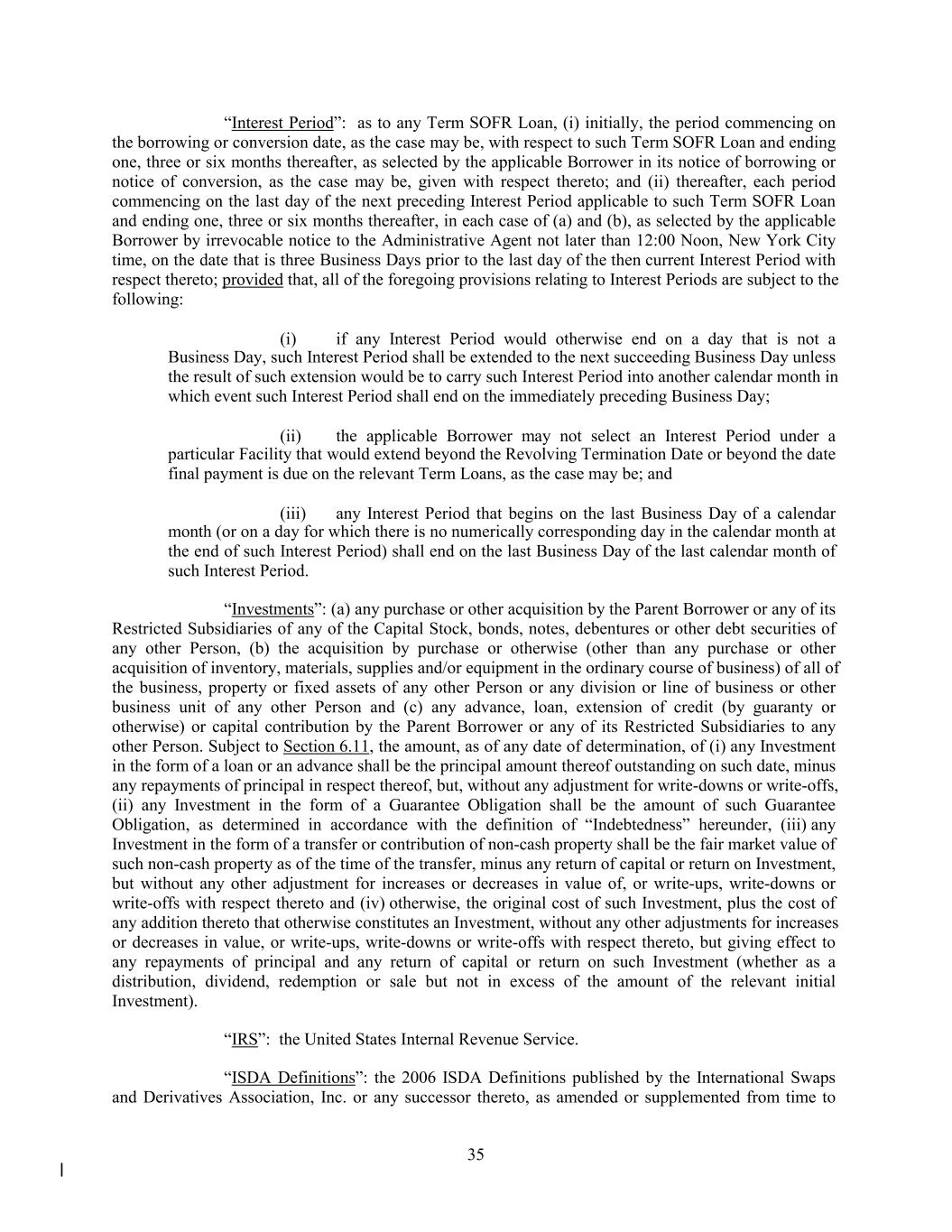 “Interest Period”: as to any Term SOFR Loan, (i) initially, the period commencing on the borrowing or conversion date, as the case may be, with respect to such Term SOFR Loan and ending one, three or six months thereafter, as selected by the applicable Borrower in its notice of borrowing or notice of conversion, as the case may be, given with respect thereto; and (ii) thereafter, each period commencing on the last day of the next preceding Interest Period applicable to such Term SOFR Loan and ending one, three or six months thereafter, in each case of (a) and (b), as selected by the applicable Borrower by irrevocable notice to the Administrative Agent not later than 12:00 Noon, New York City time, on the date that is three Business Days prior to the last day of the then current Interest Period with respect thereto; provided that, all of the foregoing provisions relating to Interest Periods are subject to the following: (i) if any Interest Period would otherwise end on a day that is not a Business Day, such Interest Period shall be extended to the next succeeding Business Day unless the result of such extension would be to carry such Interest Period into another calendar month in which event such Interest Period shall end on the immediately preceding Business Day; (ii) the applicable Borrower may not select an Interest Period under a particular Facility that would extend beyond the Revolving Termination Date or beyond the date final payment is due on the relevant Term Loans, as the case may be; and (iii) any Interest Period that begins on the last Business Day of a calendar month (or on a day for which there is no numerically corresponding day in the calendar month at the end of such Interest Period) shall end on the last Business Day of the last calendar month of such Interest Period. “Investments”: (a) any purchase or other acquisition by the Parent Borrower or any of its Restricted Subsidiaries of any of the Capital Stock, bonds, notes, debentures or other debt securities of any other Person, (b) the acquisition by purchase or otherwise (other than any purchase or other acquisition of inventory, materials, supplies and/or equipment in the ordinary course of business) of all of the business, property or fixed assets of any other Person or any division or line of business or other business unit of any other Person and (c) any advance, loan, extension of credit (by guaranty or otherwise) or capital contribution by the Parent Borrower or any of its Restricted Subsidiaries to any other Person. Subject to Section 6.11, the amount, as of any date of determination, of (i) any Investment in the form of a loan or an advance shall be the principal amount thereof outstanding on such date, minus any repayments of principal in respect thereof, but, without any adjustment for write-downs or write-offs, (ii) any Investment in the form of a Guarantee Obligation shall be the amount of such Guarantee Obligation, as determined in accordance with the definition of “Indebtedness” hereunder, (iii) any Investment in the form of a transfer or contribution of non-cash property shall be the fair market value of such non-cash property as of the time of the transfer, minus any return of capital or return on Investment, but without any other adjustment for increases or decreases in value of, or write-ups, write-downs or write-offs with respect thereto and (iv) otherwise, the original cost of such Investment, plus the cost of any addition thereto that otherwise constitutes an Investment, without any other adjustments for increases or decreases in value, or write-ups, write-downs or write-offs with respect thereto, but giving effect to any repayments of principal and any return of capital or return on such Investment (whether as a distribution, dividend, redemption or sale but not in excess of the amount of the relevant initial Investment). “IRS”: the United States Internal Revenue Service. “ISDA Definitions”: the 2006 ISDA Definitions published by the International Swaps and Derivatives Association, Inc. or any successor thereto, as amended or supplemented from time to 35