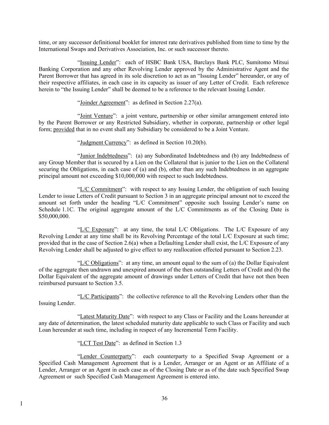 time, or any successor definitional booklet for interest rate derivatives published from time to time by the International Swaps and Derivatives Association, Inc. or such successor thereto. “Issuing Lender”: each of HSBC Bank USA, Barclays Bank PLC, Sumitomo Mitsui Banking Corporation and any other Revolving Lender approved by the Administrative Agent and the Parent Borrower that has agreed in its sole discretion to act as an “Issuing Lender” hereunder, or any of their respective affiliates, in each case in its capacity as issuer of any Letter of Credit. Each reference herein to “the Issuing Lender” shall be deemed to be a reference to the relevant Issuing Lender. “Joinder Agreement”: as defined in Section 2.27(a). “Joint Venture”: a joint venture, partnership or other similar arrangement entered into by the Parent Borrower or any Restricted Subsidiary, whether in corporate, partnership or other legal form; provided that in no event shall any Subsidiary be considered to be a Joint Venture. “Judgment Currency”: as defined in Section 10.20(b). “Junior Indebtedness”: (a) any Subordinated Indebtedness and (b) any Indebtedness of any Group Member that is secured by a Lien on the Collateral that is junior to the Lien on the Collateral securing the Obligations, in each case of (a) and (b), other than any such Indebtedness in an aggregate principal amount not exceeding $10,000,000 with respect to such Indebtedness. “L/C Commitment”: with respect to any Issuing Lender, the obligation of such Issuing Lender to issue Letters of Credit pursuant to Section 3 in an aggregate principal amount not to exceed the amount set forth under the heading “L/C Commitment” opposite such Issuing Lender’s name on Schedule 1.1C. The original aggregate amount of the L/C Commitments as of the Closing Date is $50,000,000. “L/C Exposure”: at any time, the total L/C Obligations. The L/C Exposure of any Revolving Lender at any time shall be its Revolving Percentage of the total L/C Exposure at such time; provided that in the case of Section 2.6(a) when a Defaulting Lender shall exist, the L/C Exposure of any Revolving Lender shall be adjusted to give effect to any reallocation effected pursuant to Section 2.23. “L/C Obligations”: at any time, an amount equal to the sum of (a) the Dollar Equivalent of the aggregate then undrawn and unexpired amount of the then outstanding Letters of Credit and (b) the Dollar Equivalent of the aggregate amount of drawings under Letters of Credit that have not then been reimbursed pursuant to Section 3.5. “L/C Participants”: the collective reference to all the Revolving Lenders other than the Issuing Lender. “Latest Maturity Date”: with respect to any Class or Facility and the Loans hereunder at any date of determination, the latest scheduled maturity date applicable to such Class or Facility and such Loan hereunder at such time, including in respect of any Incremental Term Facility. “LCT Test Date”: as defined in Section 1.3 “Lender Counterparty”: each counterparty to a Specified Swap Agreement or a Specified Cash Management Agreement that is a Lender, Arranger or an Agent or an Affiliate of a Lender, Arranger or an Agent in each case as of the Closing Date or as of the date such Specified Swap Agreement or such Specified Cash Management Agreement is entered into. 36