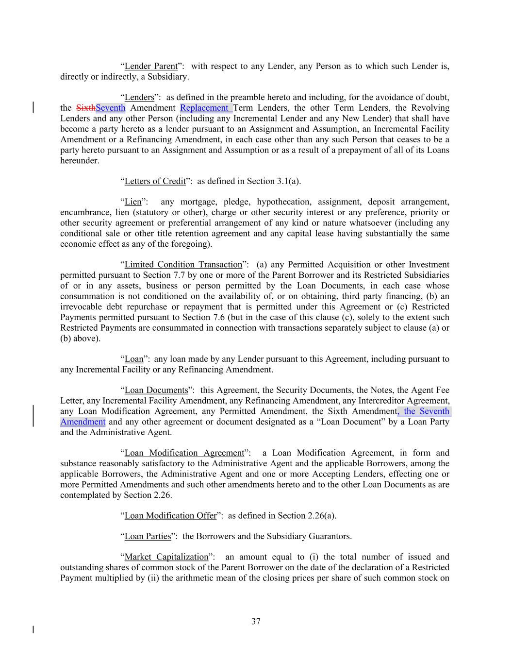 “Lender Parent”: with respect to any Lender, any Person as to which such Lender is, directly or indirectly, a Subsidiary. “Lenders”: as defined in the preamble hereto and including, for the avoidance of doubt, the SixthSeventh Amendment Replacement Term Lenders, the other Term Lenders, the Revolving Lenders and any other Person (including any Incremental Lender and any New Lender) that shall have become a party hereto as a lender pursuant to an Assignment and Assumption, an Incremental Facility Amendment or a Refinancing Amendment, in each case other than any such Person that ceases to be a party hereto pursuant to an Assignment and Assumption or as a result of a prepayment of all of its Loans hereunder. “Letters of Credit”: as defined in Section 3.1(a). “Lien”: any mortgage, pledge, hypothecation, assignment, deposit arrangement, encumbrance, lien (statutory or other), charge or other security interest or any preference, priority or other security agreement or preferential arrangement of any kind or nature whatsoever (including any conditional sale or other title retention agreement and any capital lease having substantially the same economic effect as any of the foregoing). “Limited Condition Transaction”: (a) any Permitted Acquisition or other Investment permitted pursuant to Section 7.7 by one or more of the Parent Borrower and its Restricted Subsidiaries of or in any assets, business or person permitted by the Loan Documents, in each case whose consummation is not conditioned on the availability of, or on obtaining, third party financing, (b) an irrevocable debt repurchase or repayment that is permitted under this Agreement or (c) Restricted Payments permitted pursuant to Section 7.6 (but in the case of this clause (c), solely to the extent such Restricted Payments are consummated in connection with transactions separately subject to clause (a) or (b) above). “Loan”: any loan made by any Lender pursuant to this Agreement, including pursuant to any Incremental Facility or any Refinancing Amendment. “Loan Documents”: this Agreement, the Security Documents, the Notes, the Agent Fee Letter, any Incremental Facility Amendment, any Refinancing Amendment, any Intercreditor Agreement, any Loan Modification Agreement, any Permitted Amendment, the Sixth Amendment, the Seventh Amendment and any other agreement or document designated as a “Loan Document” by a Loan Party and the Administrative Agent. “Loan Modification Agreement”: a Loan Modification Agreement, in form and substance reasonably satisfactory to the Administrative Agent and the applicable Borrowers, among the applicable Borrowers, the Administrative Agent and one or more Accepting Lenders, effecting one or more Permitted Amendments and such other amendments hereto and to the other Loan Documents as are contemplated by Section 2.26. “Loan Modification Offer”: as defined in Section 2.26(a). “Loan Parties”: the Borrowers and the Subsidiary Guarantors. “Market Capitalization”: an amount equal to (i) the total number of issued and outstanding shares of common stock of the Parent Borrower on the date of the declaration of a Restricted Payment multiplied by (ii) the arithmetic mean of the closing prices per share of such common stock on 37