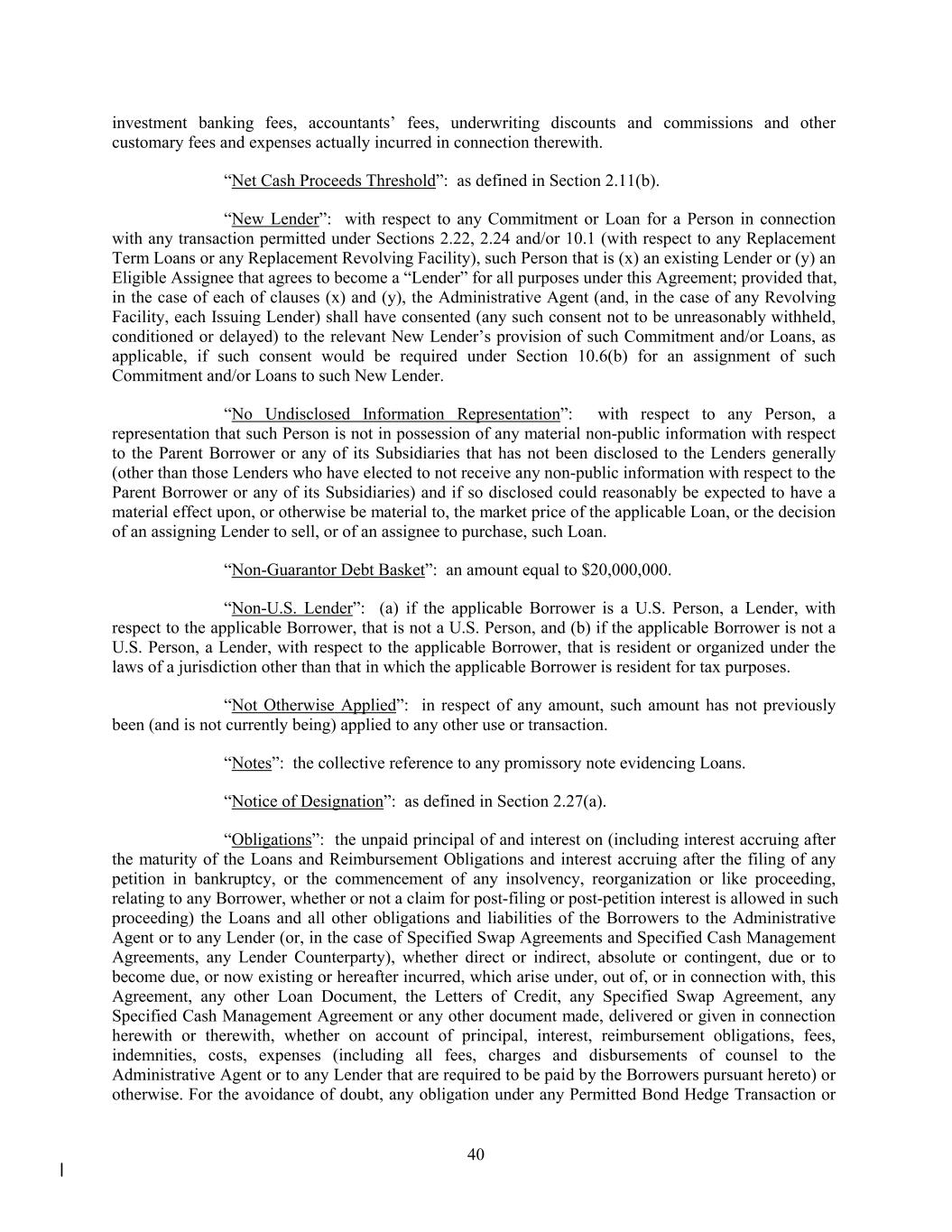 investment banking fees, accountants’ fees, underwriting discounts and commissions and other customary fees and expenses actually incurred in connection therewith. “Net Cash Proceeds Threshold”: as defined in Section 2.11(b). “New Lender”: with respect to any Commitment or Loan for a Person in connection with any transaction permitted under Sections 2.22, 2.24 and/or 10.1 (with respect to any Replacement Term Loans or any Replacement Revolving Facility), such Person that is (x) an existing Lender or (y) an Eligible Assignee that agrees to become a “Lender” for all purposes under this Agreement; provided that, in the case of each of clauses (x) and (y), the Administrative Agent (and, in the case of any Revolving Facility, each Issuing Lender) shall have consented (any such consent not to be unreasonably withheld, conditioned or delayed) to the relevant New Lender’s provision of such Commitment and/or Loans, as applicable, if such consent would be required under Section 10.6(b) for an assignment of such Commitment and/or Loans to such New Lender. “No Undisclosed Information Representation”: with respect to any Person, a representation that such Person is not in possession of any material non-public information with respect to the Parent Borrower or any of its Subsidiaries that has not been disclosed to the Lenders generally (other than those Lenders who have elected to not receive any non-public information with respect to the Parent Borrower or any of its Subsidiaries) and if so disclosed could reasonably be expected to have a material effect upon, or otherwise be material to, the market price of the applicable Loan, or the decision of an assigning Lender to sell, or of an assignee to purchase, such Loan. “Non-Guarantor Debt Basket”: an amount equal to $20,000,000. “Non-U.S. Lender”: (a) if the applicable Borrower is a U.S. Person, a Lender, with respect to the applicable Borrower, that is not a U.S. Person, and (b) if the applicable Borrower is not a U.S. Person, a Lender, with respect to the applicable Borrower, that is resident or organized under the laws of a jurisdiction other than that in which the applicable Borrower is resident for tax purposes. “Not Otherwise Applied”: in respect of any amount, such amount has not previously been (and is not currently being) applied to any other use or transaction. “Notes”: the collective reference to any promissory note evidencing Loans. “Notice of Designation”: as defined in Section 2.27(a). “Obligations”: the unpaid principal of and interest on (including interest accruing after the maturity of the Loans and Reimbursement Obligations and interest accruing after the filing of any petition in bankruptcy, or the commencement of any insolvency, reorganization or like proceeding, relating to any Borrower, whether or not a claim for post-filing or post-petition interest is allowed in such proceeding) the Loans and all other obligations and liabilities of the Borrowers to the Administrative Agent or to any Lender (or, in the case of Specified Swap Agreements and Specified Cash Management Agreements, any Lender Counterparty), whether direct or indirect, absolute or contingent, due or to become due, or now existing or hereafter incurred, which arise under, out of, or in connection with, this Agreement, any other Loan Document, the Letters of Credit, any Specified Swap Agreement, any Specified Cash Management Agreement or any other document made, delivered or given in connection herewith or therewith, whether on account of principal, interest, reimbursement obligations, fees, indemnities, costs, expenses (including all fees, charges and disbursements of counsel to the Administrative Agent or to any Lender that are required to be paid by the Borrowers pursuant hereto) or otherwise. For the avoidance of doubt, any obligation under any Permitted Bond Hedge Transaction or 40