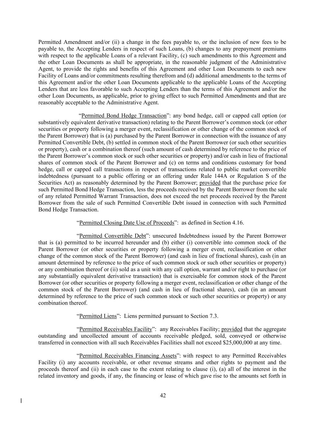 Permitted Amendment and/or (ii) a change in the fees payable to, or the inclusion of new fees to be payable to, the Accepting Lenders in respect of such Loans, (b) changes to any prepayment premiums with respect to the applicable Loans of a relevant Facility, (c) such amendments to this Agreement and the other Loan Documents as shall be appropriate, in the reasonable judgment of the Administrative Agent, to provide the rights and benefits of this Agreement and other Loan Documents to each new Facility of Loans and/or commitments resulting therefrom and (d) additional amendments to the terms of this Agreement and/or the other Loan Documents applicable to the applicable Loans of the Accepting Lenders that are less favorable to such Accepting Lenders than the terms of this Agreement and/or the other Loan Documents, as applicable, prior to giving effect to such Permitted Amendments and that are reasonably acceptable to the Administrative Agent. “Permitted Bond Hedge Transaction”: any bond hedge, call or capped call option (or substantively equivalent derivative transaction) relating to the Parent Borrower’s common stock (or other securities or property following a merger event, reclassification or other change of the common stock of the Parent Borrower) that is (a) purchased by the Parent Borrower in connection with the issuance of any Permitted Convertible Debt, (b) settled in common stock of the Parent Borrower (or such other securities or property), cash or a combination thereof (such amount of cash determined by reference to the price of the Parent Borrower’s common stock or such other securities or property) and/or cash in lieu of fractional shares of common stock of the Parent Borrower and (c) on terms and conditions customary for bond hedge, call or capped call transactions in respect of transactions related to public market convertible indebtedness (pursuant to a public offering or an offering under Rule 144A or Regulation S of the Securities Act) as reasonably determined by the Parent Borrower; provided that the purchase price for such Permitted Bond Hedge Transaction, less the proceeds received by the Parent Borrower from the sale of any related Permitted Warrant Transaction, does not exceed the net proceeds received by the Parent Borrower from the sale of such Permitted Convertible Debt issued in connection with such Permitted Bond Hedge Transaction. “Permitted Closing Date Use of Proceeds”: as defined in Section 4.16. “Permitted Convertible Debt”: unsecured Indebtedness issued by the Parent Borrower that is (a) permitted to be incurred hereunder and (b) either (i) convertible into common stock of the Parent Borrower (or other securities or property following a merger event, reclassification or other change of the common stock of the Parent Borrower) (and cash in lieu of fractional shares), cash (in an amount determined by reference to the price of such common stock or such other securities or property) or any combination thereof or (ii) sold as a unit with any call option, warrant and/or right to purchase (or any substantially equivalent derivative transaction) that is exercisable for common stock of the Parent Borrower (or other securities or property following a merger event, reclassification or other change of the common stock of the Parent Borrower) (and cash in lieu of fractional shares), cash (in an amount determined by reference to the price of such common stock or such other securities or property) or any combination thereof. “Permitted Liens”: Liens permitted pursuant to Section 7.3. “Permitted Receivables Facility”: any Receivables Facility; provided that the aggregate outstanding and uncollected amount of accounts receivable pledged, sold, conveyed or otherwise transferred in connection with all such Receivables Facilities shall not exceed $25,000,000 at any time. “Permitted Receivables Financing Assets”: with respect to any Permitted Receivables Facility (i) any accounts receivable, or other revenue streams and other rights to payment and the proceeds thereof and (ii) in each case to the extent relating to clause (i), (a) all of the interest in the related inventory and goods, if any, the financing or lease of which gave rise to the amounts set forth in 42