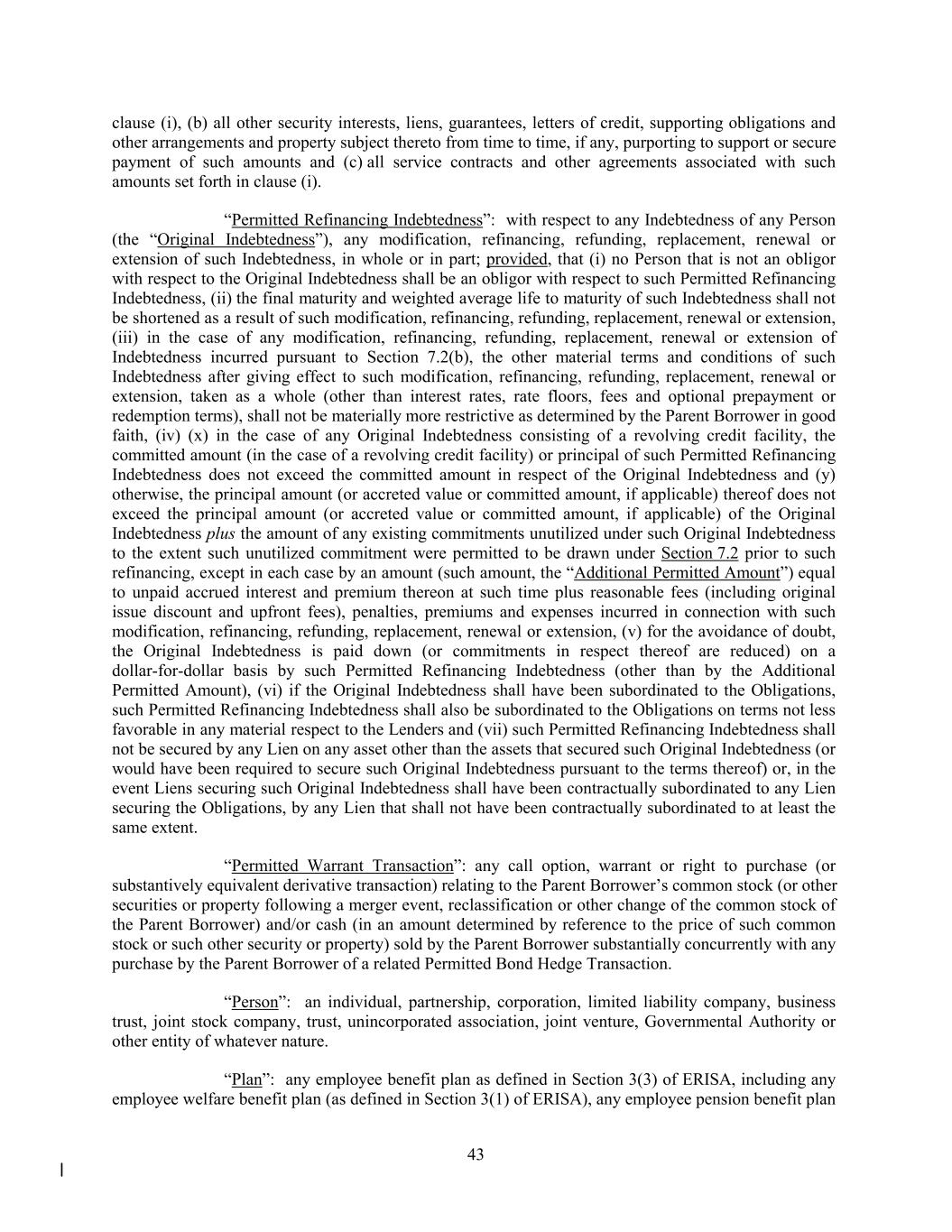 clause (i), (b) all other security interests, liens, guarantees, letters of credit, supporting obligations and other arrangements and property subject thereto from time to time, if any, purporting to support or secure payment of such amounts and (c) all service contracts and other agreements associated with such amounts set forth in clause (i). “Permitted Refinancing Indebtedness”: with respect to any Indebtedness of any Person (the “Original Indebtedness”), any modification, refinancing, refunding, replacement, renewal or extension of such Indebtedness, in whole or in part; provided, that (i) no Person that is not an obligor with respect to the Original Indebtedness shall be an obligor with respect to such Permitted Refinancing Indebtedness, (ii) the final maturity and weighted average life to maturity of such Indebtedness shall not be shortened as a result of such modification, refinancing, refunding, replacement, renewal or extension, (iii) in the case of any modification, refinancing, refunding, replacement, renewal or extension of Indebtedness incurred pursuant to Section 7.2(b), the other material terms and conditions of such Indebtedness after giving effect to such modification, refinancing, refunding, replacement, renewal or extension, taken as a whole (other than interest rates, rate floors, fees and optional prepayment or redemption terms), shall not be materially more restrictive as determined by the Parent Borrower in good faith, (iv) (x) in the case of any Original Indebtedness consisting of a revolving credit facility, the committed amount (in the case of a revolving credit facility) or principal of such Permitted Refinancing Indebtedness does not exceed the committed amount in respect of the Original Indebtedness and (y) otherwise, the principal amount (or accreted value or committed amount, if applicable) thereof does not exceed the principal amount (or accreted value or committed amount, if applicable) of the Original Indebtedness plus the amount of any existing commitments unutilized under such Original Indebtedness to the extent such unutilized commitment were permitted to be drawn under Section 7.2 prior to such refinancing, except in each case by an amount (such amount, the “Additional Permitted Amount”) equal to unpaid accrued interest and premium thereon at such time plus reasonable fees (including original issue discount and upfront fees), penalties, premiums and expenses incurred in connection with such modification, refinancing, refunding, replacement, renewal or extension, (v) for the avoidance of doubt, the Original Indebtedness is paid down (or commitments in respect thereof are reduced) on a dollar-for-dollar basis by such Permitted Refinancing Indebtedness (other than by the Additional Permitted Amount), (vi) if the Original Indebtedness shall have been subordinated to the Obligations, such Permitted Refinancing Indebtedness shall also be subordinated to the Obligations on terms not less favorable in any material respect to the Lenders and (vii) such Permitted Refinancing Indebtedness shall not be secured by any Lien on any asset other than the assets that secured such Original Indebtedness (or would have been required to secure such Original Indebtedness pursuant to the terms thereof) or, in the event Liens securing such Original Indebtedness shall have been contractually subordinated to any Lien securing the Obligations, by any Lien that shall not have been contractually subordinated to at least the same extent. “Permitted Warrant Transaction”: any call option, warrant or right to purchase (or substantively equivalent derivative transaction) relating to the Parent Borrower’s common stock (or other securities or property following a merger event, reclassification or other change of the common stock of the Parent Borrower) and/or cash (in an amount determined by reference to the price of such common stock or such other security or property) sold by the Parent Borrower substantially concurrently with any purchase by the Parent Borrower of a related Permitted Bond Hedge Transaction. “Person”: an individual, partnership, corporation, limited liability company, business trust, joint stock company, trust, unincorporated association, joint venture, Governmental Authority or other entity of whatever nature. “Plan”: any employee benefit plan as defined in Section 3(3) of ERISA, including any employee welfare benefit plan (as defined in Section 3(1) of ERISA), any employee pension benefit plan 43