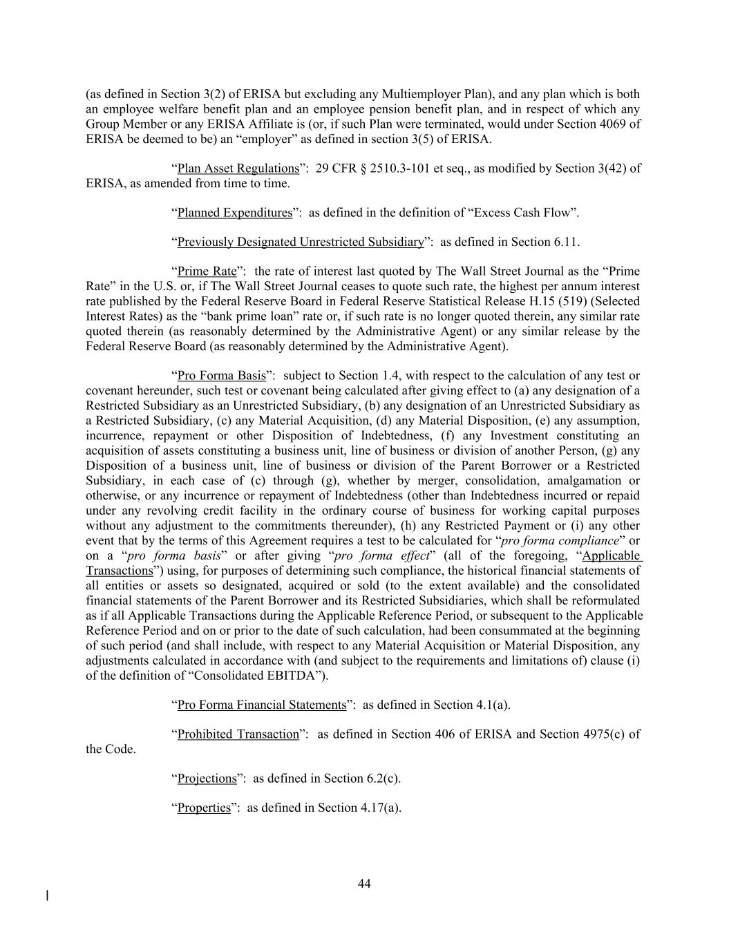 (as defined in Section 3(2) of ERISA but excluding any Multiemployer Plan), and any plan which is both an employee welfare benefit plan and an employee pension benefit plan, and in respect of which any Group Member or any ERISA Affiliate is (or, if such Plan were terminated, would under Section 4069 of ERISA be deemed to be) an “employer” as defined in section 3(5) of ERISA. “Plan Asset Regulations”: 29 CFR § 2510.3-101 et seq., as modified by Section 3(42) of ERISA, as amended from time to time. “Planned Expenditures”: as defined in the definition of “Excess Cash Flow”. “Previously Designated Unrestricted Subsidiary”: as defined in Section 6.11. “Prime Rate”: the rate of interest last quoted by The Wall Street Journal as the “Prime Rate” in the U.S. or, if The Wall Street Journal ceases to quote such rate, the highest per annum interest rate published by the Federal Reserve Board in Federal Reserve Statistical Release H.15 (519) (Selected Interest Rates) as the “bank prime loan” rate or, if such rate is no longer quoted therein, any similar rate quoted therein (as reasonably determined by the Administrative Agent) or any similar release by the Federal Reserve Board (as reasonably determined by the Administrative Agent). “Pro Forma Basis”: subject to Section 1.4, with respect to the calculation of any test or covenant hereunder, such test or covenant being calculated after giving effect to (a) any designation of a Restricted Subsidiary as an Unrestricted Subsidiary, (b) any designation of an Unrestricted Subsidiary as a Restricted Subsidiary, (c) any Material Acquisition, (d) any Material Disposition, (e) any assumption, incurrence, repayment or other Disposition of Indebtedness, (f) any Investment constituting an acquisition of assets constituting a business unit, line of business or division of another Person, (g) any Disposition of a business unit, line of business or division of the Parent Borrower or a Restricted Subsidiary, in each case of (c) through (g), whether by merger, consolidation, amalgamation or otherwise, or any incurrence or repayment of Indebtedness (other than Indebtedness incurred or repaid under any revolving credit facility in the ordinary course of business for working capital purposes without any adjustment to the commitments thereunder), (h) any Restricted Payment or (i) any other event that by the terms of this Agreement requires a test to be calculated for “pro forma compliance” or on a “pro forma basis” or after giving “pro forma effect” (all of the foregoing, “Applicable Transactions”) using, for purposes of determining such compliance, the historical financial statements of all entities or assets so designated, acquired or sold (to the extent available) and the consolidated financial statements of the Parent Borrower and its Restricted Subsidiaries, which shall be reformulated as if all Applicable Transactions during the Applicable Reference Period, or subsequent to the Applicable Reference Period and on or prior to the date of such calculation, had been consummated at the beginning of such period (and shall include, with respect to any Material Acquisition or Material Disposition, any adjustments calculated in accordance with (and subject to the requirements and limitations of) clause (i) of the definition of “Consolidated EBITDA”). “Pro Forma Financial Statements”: as defined in Section 4.1(a). “Prohibited Transaction”: as defined in Section 406 of ERISA and Section 4975(c) of the Code. “Projections”: as defined in Section 6.2(c). “Properties”: as defined in Section 4.17(a). 44