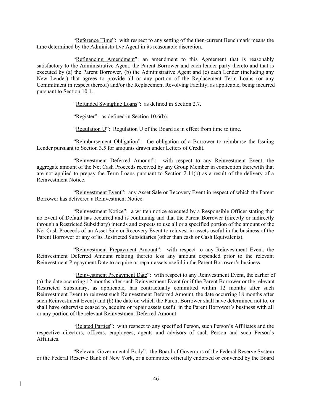 “Reference Time”: with respect to any setting of the then-current Benchmark means the time determined by the Administrative Agent in its reasonable discretion. “Refinancing Amendment”: an amendment to this Agreement that is reasonably satisfactory to the Administrative Agent, the Parent Borrower and each lender party thereto and that is executed by (a) the Parent Borrower, (b) the Administrative Agent and (c) each Lender (including any New Lender) that agrees to provide all or any portion of the Replacement Term Loans (or any Commitment in respect thereof) and/or the Replacement Revolving Facility, as applicable, being incurred pursuant to Section 10.1. “Refunded Swingline Loans”: as defined in Section 2.7. “Register”: as defined in Section 10.6(b). “Regulation U”: Regulation U of the Board as in effect from time to time. “Reimbursement Obligation”: the obligation of a Borrower to reimburse the Issuing Lender pursuant to Section 3.5 for amounts drawn under Letters of Credit. “Reinvestment Deferred Amount”: with respect to any Reinvestment Event, the aggregate amount of the Net Cash Proceeds received by any Group Member in connection therewith that are not applied to prepay the Term Loans pursuant to Section 2.11(b) as a result of the delivery of a Reinvestment Notice. “Reinvestment Event”: any Asset Sale or Recovery Event in respect of which the Parent Borrower has delivered a Reinvestment Notice. “Reinvestment Notice”: a written notice executed by a Responsible Officer stating that no Event of Default has occurred and is continuing and that the Parent Borrower (directly or indirectly through a Restricted Subsidiary) intends and expects to use all or a specified portion of the amount of the Net Cash Proceeds of an Asset Sale or Recovery Event to reinvest in assets useful in the business of the Parent Borrower or any of its Restricted Subsidiaries (other than cash or Cash Equivalents). “Reinvestment Prepayment Amount”: with respect to any Reinvestment Event, the Reinvestment Deferred Amount relating thereto less any amount expended prior to the relevant Reinvestment Prepayment Date to acquire or repair assets useful in the Parent Borrower’s business. “Reinvestment Prepayment Date”: with respect to any Reinvestment Event, the earlier of (a) the date occurring 12 months after such Reinvestment Event (or if the Parent Borrower or the relevant Restricted Subsidiary, as applicable, has contractually committed within 12 months after such Reinvestment Event to reinvest such Reinvestment Deferred Amount, the date occurring 18 months after such Reinvestment Event) and (b) the date on which the Parent Borrower shall have determined not to, or shall have otherwise ceased to, acquire or repair assets useful in the Parent Borrower’s business with all or any portion of the relevant Reinvestment Deferred Amount. “Related Parties”: with respect to any specified Person, such Person’s Affiliates and the respective directors, officers, employees, agents and advisors of such Person and such Person’s Affiliates. “Relevant Governmental Body”: the Board of Governors of the Federal Reserve System or the Federal Reserve Bank of New York, or a committee officially endorsed or convened by the Board 46
