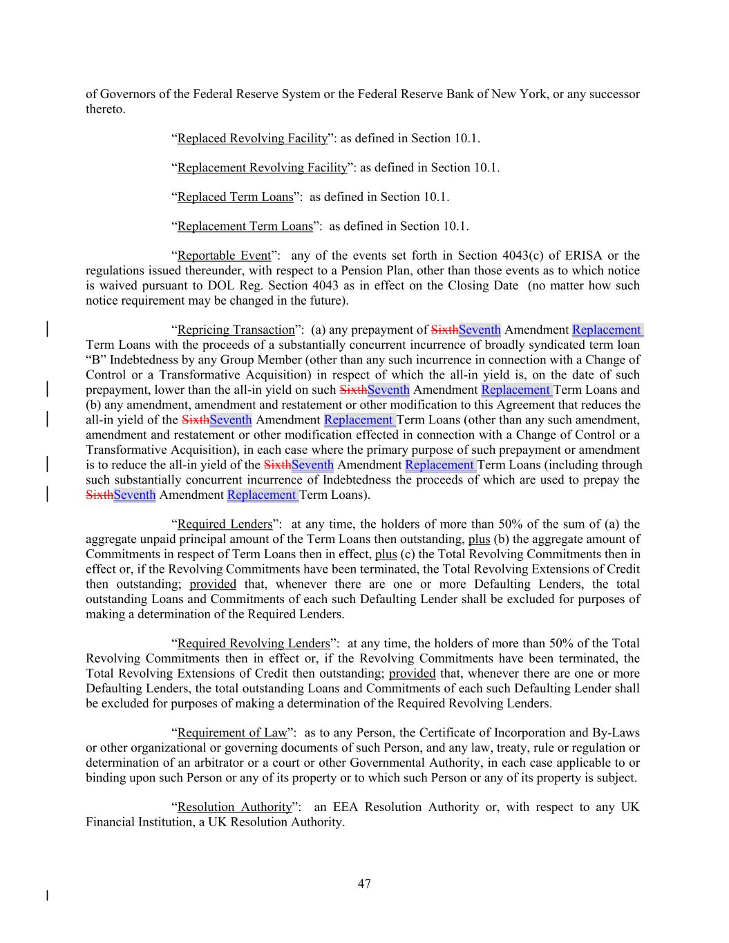 of Governors of the Federal Reserve System or the Federal Reserve Bank of New York, or any successor thereto. “Replaced Revolving Facility”: as defined in Section 10.1. “Replacement Revolving Facility”: as defined in Section 10.1. “Replaced Term Loans”: as defined in Section 10.1. “Replacement Term Loans”: as defined in Section 10.1. “Reportable Event”: any of the events set forth in Section 4043(c) of ERISA or the regulations issued thereunder, with respect to a Pension Plan, other than those events as to which notice is waived pursuant to DOL Reg. Section 4043 as in effect on the Closing Date (no matter how such notice requirement may be changed in the future). “Repricing Transaction”: (a) any prepayment of SixthSeventh Amendment Replacement Term Loans with the proceeds of a substantially concurrent incurrence of broadly syndicated term loan “B” Indebtedness by any Group Member (other than any such incurrence in connection with a Change of Control or a Transformative Acquisition) in respect of which the all-in yield is, on the date of such prepayment, lower than the all-in yield on such SixthSeventh Amendment Replacement Term Loans and (b) any amendment, amendment and restatement or other modification to this Agreement that reduces the all-in yield of the SixthSeventh Amendment Replacement Term Loans (other than any such amendment, amendment and restatement or other modification effected in connection with a Change of Control or a Transformative Acquisition), in each case where the primary purpose of such prepayment or amendment is to reduce the all-in yield of the SixthSeventh Amendment Replacement Term Loans (including through such substantially concurrent incurrence of Indebtedness the proceeds of which are used to prepay the SixthSeventh Amendment Replacement Term Loans). “Required Lenders”: at any time, the holders of more than 50% of the sum of (a) the aggregate unpaid principal amount of the Term Loans then outstanding, plus (b) the aggregate amount of Commitments in respect of Term Loans then in effect, plus (c) the Total Revolving Commitments then in effect or, if the Revolving Commitments have been terminated, the Total Revolving Extensions of Credit then outstanding; provided that, whenever there are one or more Defaulting Lenders, the total outstanding Loans and Commitments of each such Defaulting Lender shall be excluded for purposes of making a determination of the Required Lenders. “Required Revolving Lenders”: at any time, the holders of more than 50% of the Total Revolving Commitments then in effect or, if the Revolving Commitments have been terminated, the Total Revolving Extensions of Credit then outstanding; provided that, whenever there are one or more Defaulting Lenders, the total outstanding Loans and Commitments of each such Defaulting Lender shall be excluded for purposes of making a determination of the Required Revolving Lenders. “Requirement of Law”: as to any Person, the Certificate of Incorporation and By-Laws or other organizational or governing documents of such Person, and any law, treaty, rule or regulation or determination of an arbitrator or a court or other Governmental Authority, in each case applicable to or binding upon such Person or any of its property or to which such Person or any of its property is subject. “Resolution Authority”: an EEA Resolution Authority or, with respect to any UK Financial Institution, a UK Resolution Authority. 47
