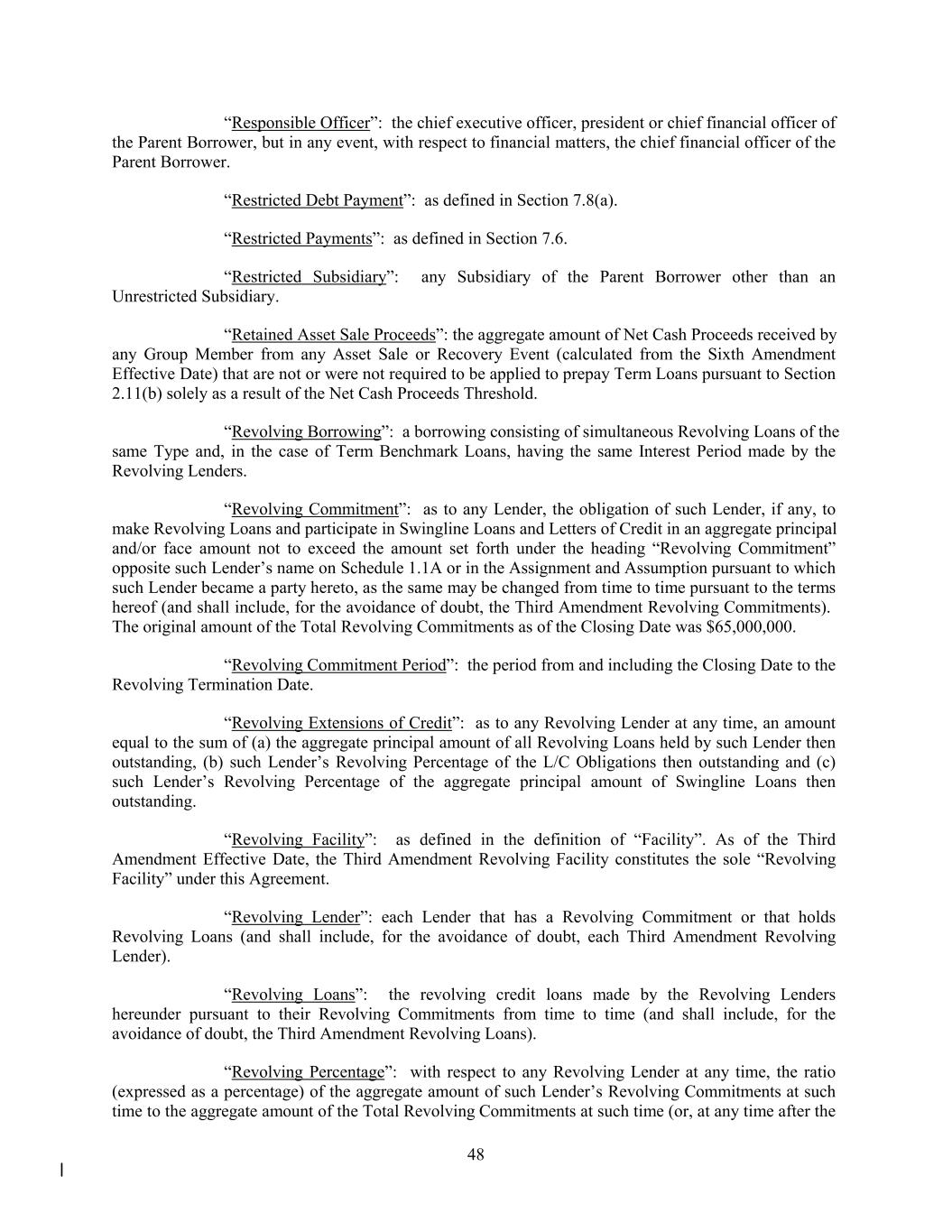 “Responsible Officer”: the chief executive officer, president or chief financial officer of the Parent Borrower, but in any event, with respect to financial matters, the chief financial officer of the Parent Borrower. “Restricted Debt Payment”: as defined in Section 7.8(a). “Restricted Payments”: as defined in Section 7.6. “Restricted Subsidiary”: any Subsidiary of the Parent Borrower other than an Unrestricted Subsidiary. “Retained Asset Sale Proceeds”: the aggregate amount of Net Cash Proceeds received by any Group Member from any Asset Sale or Recovery Event (calculated from the Sixth Amendment Effective Date) that are not or were not required to be applied to prepay Term Loans pursuant to Section 2.11(b) solely as a result of the Net Cash Proceeds Threshold. “Revolving Borrowing”: a borrowing consisting of simultaneous Revolving Loans of the same Type and, in the case of Term Benchmark Loans, having the same Interest Period made by the Revolving Lenders. “Revolving Commitment”: as to any Lender, the obligation of such Lender, if any, to make Revolving Loans and participate in Swingline Loans and Letters of Credit in an aggregate principal and/or face amount not to exceed the amount set forth under the heading “Revolving Commitment” opposite such Lender’s name on Schedule 1.1A or in the Assignment and Assumption pursuant to which such Lender became a party hereto, as the same may be changed from time to time pursuant to the terms hereof (and shall include, for the avoidance of doubt, the Third Amendment Revolving Commitments). The original amount of the Total Revolving Commitments as of the Closing Date was $65,000,000. “Revolving Commitment Period”: the period from and including the Closing Date to the Revolving Termination Date. “Revolving Extensions of Credit”: as to any Revolving Lender at any time, an amount equal to the sum of (a) the aggregate principal amount of all Revolving Loans held by such Lender then outstanding, (b) such Lender’s Revolving Percentage of the L/C Obligations then outstanding and (c) such Lender’s Revolving Percentage of the aggregate principal amount of Swingline Loans then outstanding. “Revolving Facility”: as defined in the definition of “Facility”. As of the Third Amendment Effective Date, the Third Amendment Revolving Facility constitutes the sole “Revolving Facility” under this Agreement. “Revolving Lender”: each Lender that has a Revolving Commitment or that holds Revolving Loans (and shall include, for the avoidance of doubt, each Third Amendment Revolving Lender). “Revolving Loans”: the revolving credit loans made by the Revolving Lenders hereunder pursuant to their Revolving Commitments from time to time (and shall include, for the avoidance of doubt, the Third Amendment Revolving Loans). “Revolving Percentage”: with respect to any Revolving Lender at any time, the ratio (expressed as a percentage) of the aggregate amount of such Lender’s Revolving Commitments at such time to the aggregate amount of the Total Revolving Commitments at such time (or, at any time after the 48
