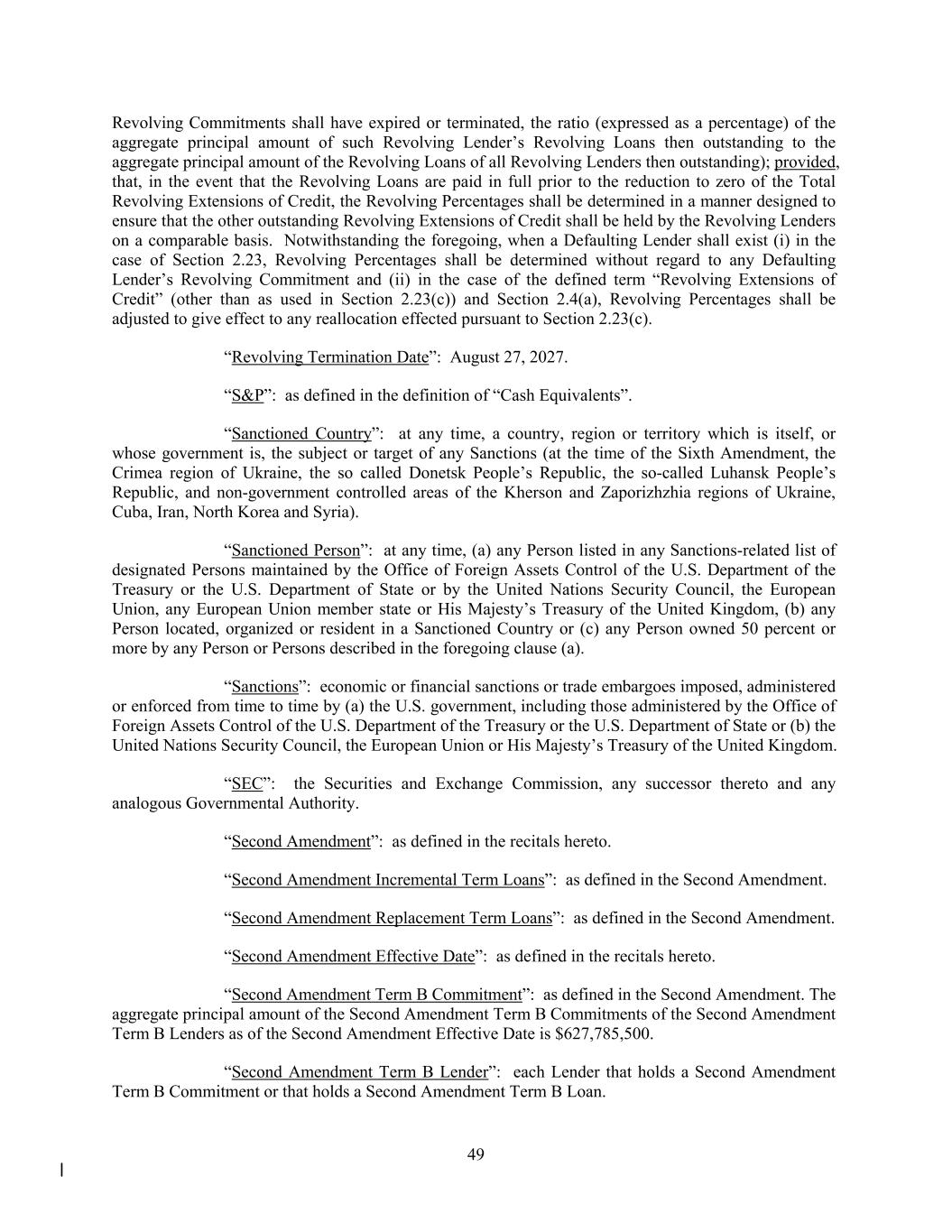 Revolving Commitments shall have expired or terminated, the ratio (expressed as a percentage) of the aggregate principal amount of such Revolving Lender’s Revolving Loans then outstanding to the aggregate principal amount of the Revolving Loans of all Revolving Lenders then outstanding); provided, that, in the event that the Revolving Loans are paid in full prior to the reduction to zero of the Total Revolving Extensions of Credit, the Revolving Percentages shall be determined in a manner designed to ensure that the other outstanding Revolving Extensions of Credit shall be held by the Revolving Lenders on a comparable basis. Notwithstanding the foregoing, when a Defaulting Lender shall exist (i) in the case of Section 2.23, Revolving Percentages shall be determined without regard to any Defaulting Lender’s Revolving Commitment and (ii) in the case of the defined term “Revolving Extensions of Credit” (other than as used in Section 2.23(c)) and Section 2.4(a), Revolving Percentages shall be adjusted to give effect to any reallocation effected pursuant to Section 2.23(c). “Revolving Termination Date”: August 27, 2027. “S&P”: as defined in the definition of “Cash Equivalents”. “Sanctioned Country”: at any time, a country, region or territory which is itself, or whose government is, the subject or target of any Sanctions (at the time of the Sixth Amendment, the Crimea region of Ukraine, the so called Donetsk People’s Republic, the so-called Luhansk People’s Republic, and non-government controlled areas of the Kherson and Zaporizhzhia regions of Ukraine, Cuba, Iran, North Korea and Syria). “Sanctioned Person”: at any time, (a) any Person listed in any Sanctions-related list of designated Persons maintained by the Office of Foreign Assets Control of the U.S. Department of the Treasury or the U.S. Department of State or by the United Nations Security Council, the European Union, any European Union member state or His Majesty’s Treasury of the United Kingdom, (b) any Person located, organized or resident in a Sanctioned Country or (c) any Person owned 50 percent or more by any Person or Persons described in the foregoing clause (a). “Sanctions”: economic or financial sanctions or trade embargoes imposed, administered or enforced from time to time by (a) the U.S. government, including those administered by the Office of Foreign Assets Control of the U.S. Department of the Treasury or the U.S. Department of State or (b) the United Nations Security Council, the European Union or His Majesty’s Treasury of the United Kingdom. “SEC”: the Securities and Exchange Commission, any successor thereto and any analogous Governmental Authority. “Second Amendment”: as defined in the recitals hereto. “Second Amendment Incremental Term Loans”: as defined in the Second Amendment. “Second Amendment Replacement Term Loans”: as defined in the Second Amendment. “Second Amendment Effective Date”: as defined in the recitals hereto. “Second Amendment Term B Commitment”: as defined in the Second Amendment. The aggregate principal amount of the Second Amendment Term B Commitments of the Second Amendment Term B Lenders as of the Second Amendment Effective Date is $627,785,500. “Second Amendment Term B Lender”: each Lender that holds a Second Amendment Term B Commitment or that holds a Second Amendment Term B Loan. 49