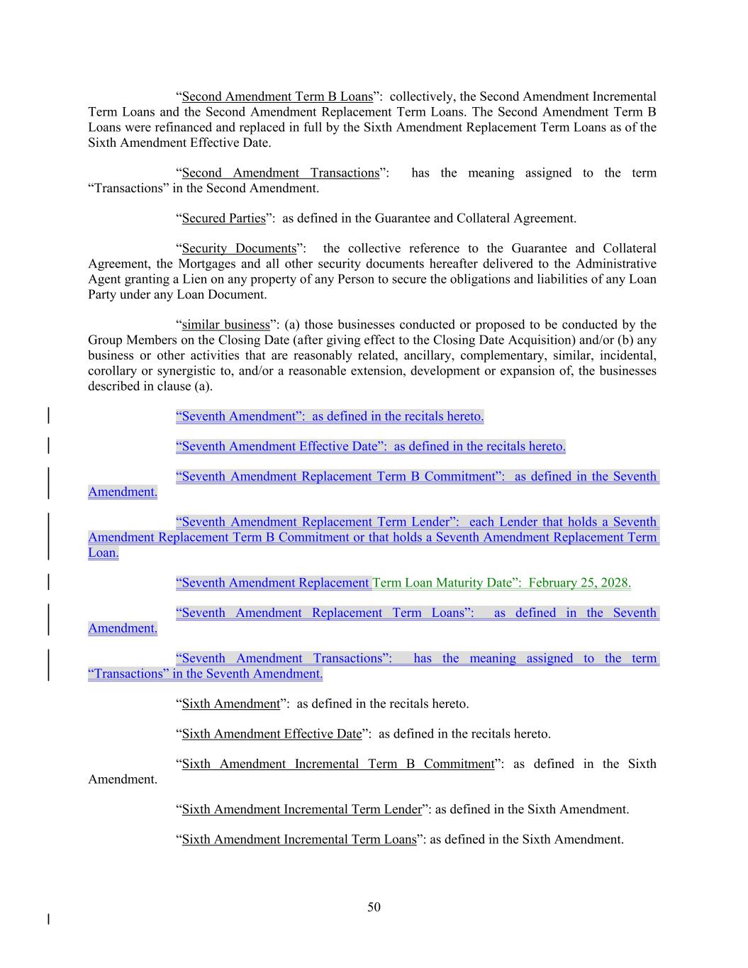 “Second Amendment Term B Loans”: collectively, the Second Amendment Incremental Term Loans and the Second Amendment Replacement Term Loans. The Second Amendment Term B Loans were refinanced and replaced in full by the Sixth Amendment Replacement Term Loans as of the Sixth Amendment Effective Date. “Second Amendment Transactions”: has the meaning assigned to the term “Transactions” in the Second Amendment. “Secured Parties”: as defined in the Guarantee and Collateral Agreement. “Security Documents”: the collective reference to the Guarantee and Collateral Agreement, the Mortgages and all other security documents hereafter delivered to the Administrative Agent granting a Lien on any property of any Person to secure the obligations and liabilities of any Loan Party under any Loan Document. “similar business”: (a) those businesses conducted or proposed to be conducted by the Group Members on the Closing Date (after giving effect to the Closing Date Acquisition) and/or (b) any business or other activities that are reasonably related, ancillary, complementary, similar, incidental, corollary or synergistic to, and/or a reasonable extension, development or expansion of, the businesses described in clause (a). “Seventh Amendment”: as defined in the recitals hereto. “Seventh Amendment Effective Date”: as defined in the recitals hereto. “Seventh Amendment Replacement Term B Commitment”: as defined in the Seventh Amendment. “Seventh Amendment Replacement Term Lender”: each Lender that holds a Seventh Amendment Replacement Term B Commitment or that holds a Seventh Amendment Replacement Term Loan. “Seventh Amendment Replacement Term Loan Maturity Date”: February 25, 2028. “Seventh Amendment Replacement Term Loans”: as defined in the Seventh Amendment. “Seventh Amendment Transactions”: has the meaning assigned to the term “Transactions” in the Seventh Amendment. “Sixth Amendment”: as defined in the recitals hereto. “Sixth Amendment Effective Date”: as defined in the recitals hereto. “Sixth Amendment Incremental Term B Commitment”: as defined in the Sixth Amendment. “Sixth Amendment Incremental Term Lender”: as defined in the Sixth Amendment. “Sixth Amendment Incremental Term Loans”: as defined in the Sixth Amendment. 50