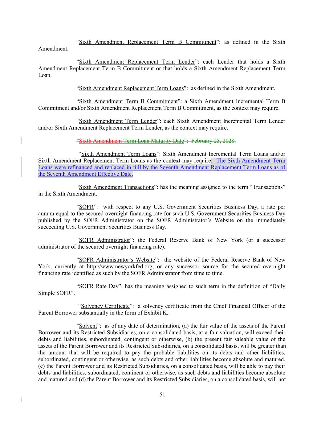 “Sixth Amendment Replacement Term B Commitment”: as defined in the Sixth Amendment. “Sixth Amendment Replacement Term Lender”: each Lender that holds a Sixth Amendment Replacement Term B Commitment or that holds a Sixth Amendment Replacement Term Loan. “Sixth Amendment Replacement Term Loans”: as defined in the Sixth Amendment. “Sixth Amendment Term B Commitment”: a Sixth Amendment Incremental Term B Commitment and/or Sixth Amendment Replacement Term B Commitment, as the context may require. “Sixth Amendment Term Lender”: each Sixth Amendment Incremental Term Lender and/or Sixth Amendment Replacement Term Lender, as the context may require. “Sixth Amendment Term Loan Maturity Date”: February 25, 2028. “Sixth Amendment Term Loans”: Sixth Amendment Incremental Term Loans and/or Sixth Amendment Replacement Term Loans as the context may require. The Sixth Amendment Term Loans were refinanced and replaced in full by the Seventh Amendment Replacement Term Loans as of the Seventh Amendment Effective Date. “Sixth Amendment Transactions”: has the meaning assigned to the term “Transactions” in the Sixth Amendment. “SOFR”: with respect to any U.S. Government Securities Business Day, a rate per annum equal to the secured overnight financing rate for such U.S. Government Securities Business Day published by the SOFR Administrator on the SOFR Administrator’s Website on the immediately succeeding U.S. Government Securities Business Day. “SOFR Administrator”: the Federal Reserve Bank of New York (or a successor administrator of the secured overnight financing rate). “SOFR Administrator’s Website”: the website of the Federal Reserve Bank of New York, currently at http://www.newyorkfed.org, or any successor source for the secured overnight financing rate identified as such by the SOFR Administrator from time to time. “SOFR Rate Day”: has the meaning assigned to such term in the definition of “Daily Simple SOFR”. “Solvency Certificate”: a solvency certificate from the Chief Financial Officer of the Parent Borrower substantially in the form of Exhibit K. “Solvent”: as of any date of determination, (a) the fair value of the assets of the Parent Borrower and its Restricted Subsidiaries, on a consolidated basis, at a fair valuation, will exceed their debts and liabilities, subordinated, contingent or otherwise, (b) the present fair saleable value of the assets of the Parent Borrower and its Restricted Subsidiaries, on a consolidated basis, will be greater than the amount that will be required to pay the probable liabilities on its debts and other liabilities, subordinated, contingent or otherwise, as such debts and other liabilities become absolute and matured, (c) the Parent Borrower and its Restricted Subsidiaries, on a consolidated basis, will be able to pay their debts and liabilities, subordinated, continent or otherwise, as such debts and liabilities become absolute and matured and (d) the Parent Borrower and its Restricted Subsidiaries, on a consolidated basis, will not 51