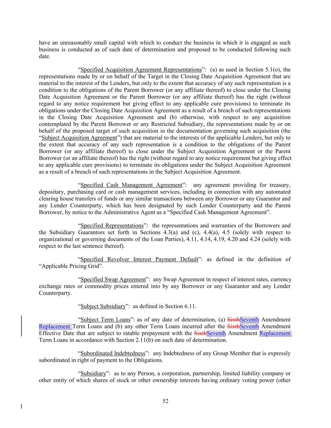 have an unreasonably small capital with which to conduct the business in which it is engaged as such business is conducted as of such date of determination and proposed to be conducted following such date. “Specified Acquisition Agreement Representations”: (a) as used in Section 5.1(o), the representations made by or on behalf of the Target in the Closing Date Acquisition Agreement that are material to the interest of the Lenders, but only to the extent that accuracy of any such representation is a condition to the obligations of the Parent Borrower (or any affiliate thereof) to close under the Closing Date Acquisition Agreement or the Parent Borrower (or any affiliate thereof) has the right (without regard to any notice requirement but giving effect to any applicable cure provisions) to terminate its obligations under the Closing Date Acquisition Agreement as a result of a breach of such representations in the Closing Date Acquisition Agreement and (b) otherwise, with respect to any acquisition contemplated by the Parent Borrower or any Restricted Subsidiary, the representations made by or on behalf of the proposed target of such acquisition in the documentation governing such acquisition (the “Subject Acquisition Agreement”) that are material to the interests of the applicable Lenders, but only to the extent that accuracy of any such representation is a condition to the obligations of the Parent Borrower (or any affiliate thereof) to close under the Subject Acquisition Agreement or the Parent Borrower (or an affiliate thereof) has the right (without regard to any notice requirement but giving effect to any applicable cure provisions) to terminate its obligations under the Subject Acquisition Agreement as a result of a breach of such representations in the Subject Acquisition Agreement. “Specified Cash Management Agreement”: any agreement providing for treasury, depositary, purchasing card or cash management services, including in connection with any automated clearing house transfers of funds or any similar transactions between any Borrower or any Guarantor and any Lender Counterparty, which has been designated by such Lender Counterparty and the Parent Borrower, by notice to the Administrative Agent as a “Specified Cash Management Agreement”. “Specified Representations”: the representations and warranties of the Borrowers and the Subsidiary Guarantors set forth in Sections 4.3(a) and (c), 4.4(a), 4.5 (solely with respect to organizational or governing documents of the Loan Parties), 4.11, 4.14, 4.19, 4.20 and 4.24 (solely with respect to the last sentence thereof). “Specified Revolver Interest Payment Default”: as defined in the definition of “Applicable Pricing Grid”. “Specified Swap Agreement”: any Swap Agreement in respect of interest rates, currency exchange rates or commodity prices entered into by any Borrower or any Guarantor and any Lender Counterparty. “Subject Subsidiary”: as defined in Section 6.11. “Subject Term Loans”: as of any date of determination, (a) SixthSeventh Amendment Replacement Term Loans and (b) any other Term Loans incurred after the SixthSeventh Amendment Effective Date that are subject to ratable prepayment with the SixthSeventh Amendment Replacement Term Loans in accordance with Section 2.11(b) on such date of determination. “Subordinated Indebtedness”: any Indebtedness of any Group Member that is expressly subordinated in right of payment to the Obligations. “Subsidiary”: as to any Person, a corporation, partnership, limited liability company or other entity of which shares of stock or other ownership interests having ordinary voting power (other 52