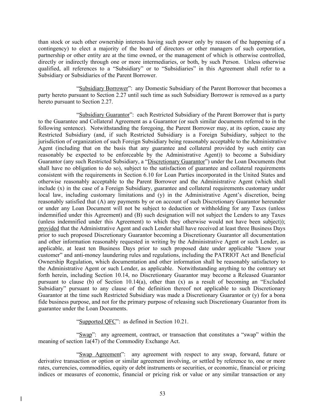 than stock or such other ownership interests having such power only by reason of the happening of a contingency) to elect a majority of the board of directors or other managers of such corporation, partnership or other entity are at the time owned, or the management of which is otherwise controlled, directly or indirectly through one or more intermediaries, or both, by such Person. Unless otherwise qualified, all references to a “Subsidiary” or to “Subsidiaries” in this Agreement shall refer to a Subsidiary or Subsidiaries of the Parent Borrower. “Subsidiary Borrower”: any Domestic Subsidiary of the Parent Borrower that becomes a party hereto pursuant to Section 2.27 until such time as such Subsidiary Borrower is removed as a party hereto pursuant to Section 2.27. “Subsidiary Guarantor”: each Restricted Subsidiary of the Parent Borrower that is party to the Guarantee and Collateral Agreement as a Guarantor (or such similar documents referred to in the following sentence). Notwithstanding the foregoing, the Parent Borrower may, at its option, cause any Restricted Subsidiary (and, if such Restricted Subsidiary is a Foreign Subsidiary, subject to the jurisdiction of organization of such Foreign Subsidiary being reasonably acceptable to the Administrative Agent (including that on the basis that any guarantee and collateral provided by such entity can reasonably be expected to be enforceable by the Administrative Agent)) to become a Subsidiary Guarantor (any such Restricted Subsidiary, a “Discretionary Guarantor”) under the Loan Documents (but shall have no obligation to do so), subject to the satisfaction of guarantee and collateral requirements consistent with the requirements in Section 6.10 for Loan Parties incorporated in the United States and otherwise reasonably acceptable to the Parent Borrower and the Administrative Agent (which shall include (x) in the case of a Foreign Subsidiary, guarantee and collateral requirements customary under local law, including customary limitations and (y) in the Administrative Agent’s discretion, being reasonably satisfied that (A) any payments by or on account of such Discretionary Guarantor hereunder or under any Loan Document will not be subject to deduction or withholding for any Taxes (unless indemnified under this Agreement) and (B) such designation will not subject the Lenders to any Taxes (unless indemnified under this Agreement) to which they otherwise would not have been subject)); provided that the Administrative Agent and each Lender shall have received at least three Business Days prior to such proposed Discretionary Guarantor becoming a Discretionary Guarantor all documentation and other information reasonably requested in writing by the Administrative Agent or such Lender, as applicable, at least ten Business Days prior to such proposed date under applicable “know your customer” and anti-money laundering rules and regulations, including the PATRIOT Act and Beneficial Ownership Regulation, which documentation and other information shall be reasonably satisfactory to the Administrative Agent or such Lender, as applicable. Notwithstanding anything to the contrary set forth herein, including Section 10.14, no Discretionary Guarantor may become a Released Guarantor pursuant to clause (b) of Section 10.14(a), other than (x) as a result of becoming an “Excluded Subsidiary” pursuant to any clause of the definition thereof not applicable to such Discretionary Guarantor at the time such Restricted Subsidiary was made a Discretionary Guarantor or (y) for a bona fide business purpose, and not for the primary purpose of releasing such Discretionary Guarantor from its guarantee under the Loan Documents. “Supported QFC”: as defined in Section 10.21. “Swap”: any agreement, contract, or transaction that constitutes a “swap” within the meaning of section 1a(47) of the Commodity Exchange Act. “Swap Agreement”: any agreement with respect to any swap, forward, future or derivative transaction or option or similar agreement involving, or settled by reference to, one or more rates, currencies, commodities, equity or debt instruments or securities, or economic, financial or pricing indices or measures of economic, financial or pricing risk or value or any similar transaction or any 53