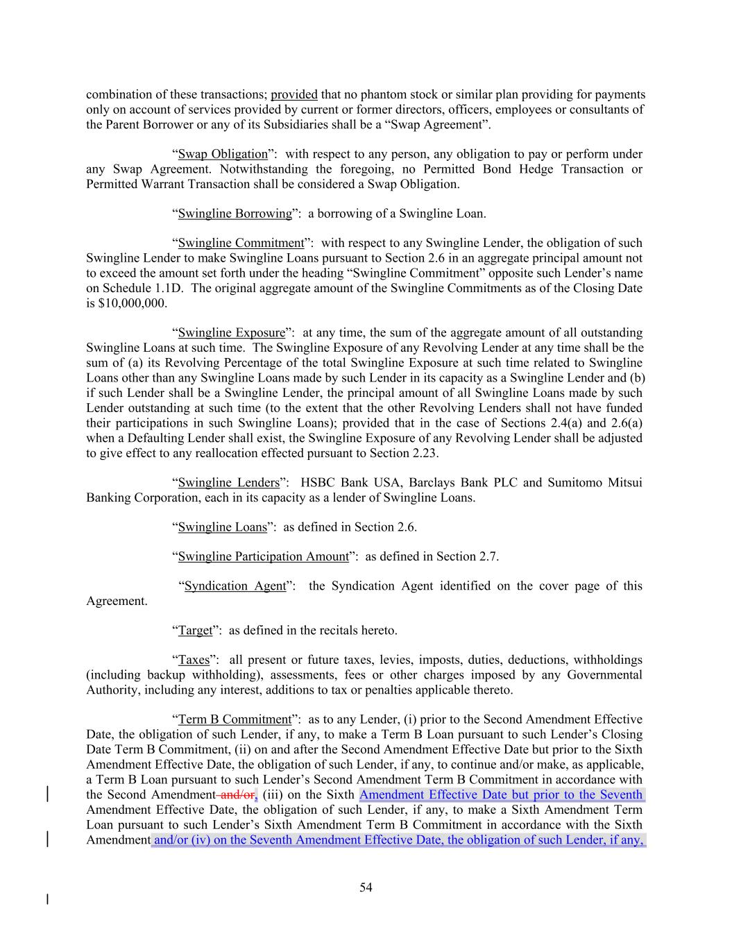 combination of these transactions; provided that no phantom stock or similar plan providing for payments only on account of services provided by current or former directors, officers, employees or consultants of the Parent Borrower or any of its Subsidiaries shall be a “Swap Agreement”. “Swap Obligation”: with respect to any person, any obligation to pay or perform under any Swap Agreement. Notwithstanding the foregoing, no Permitted Bond Hedge Transaction or Permitted Warrant Transaction shall be considered a Swap Obligation. “Swingline Borrowing”: a borrowing of a Swingline Loan. “Swingline Commitment”: with respect to any Swingline Lender, the obligation of such Swingline Lender to make Swingline Loans pursuant to Section 2.6 in an aggregate principal amount not to exceed the amount set forth under the heading “Swingline Commitment” opposite such Lender’s name on Schedule 1.1D. The original aggregate amount of the Swingline Commitments as of the Closing Date is $10,000,000. “Swingline Exposure”: at any time, the sum of the aggregate amount of all outstanding Swingline Loans at such time. The Swingline Exposure of any Revolving Lender at any time shall be the sum of (a) its Revolving Percentage of the total Swingline Exposure at such time related to Swingline Loans other than any Swingline Loans made by such Lender in its capacity as a Swingline Lender and (b) if such Lender shall be a Swingline Lender, the principal amount of all Swingline Loans made by such Lender outstanding at such time (to the extent that the other Revolving Lenders shall not have funded their participations in such Swingline Loans); provided that in the case of Sections 2.4(a) and 2.6(a) when a Defaulting Lender shall exist, the Swingline Exposure of any Revolving Lender shall be adjusted to give effect to any reallocation effected pursuant to Section 2.23. “Swingline Lenders”: HSBC Bank USA, Barclays Bank PLC and Sumitomo Mitsui Banking Corporation, each in its capacity as a lender of Swingline Loans. “Swingline Loans”: as defined in Section 2.6. “Swingline Participation Amount”: as defined in Section 2.7. “Syndication Agent”: the Syndication Agent identified on the cover page of this Agreement. “Target”: as defined in the recitals hereto. “Taxes”: all present or future taxes, levies, imposts, duties, deductions, withholdings (including backup withholding), assessments, fees or other charges imposed by any Governmental Authority, including any interest, additions to tax or penalties applicable thereto. “Term B Commitment”: as to any Lender, (i) prior to the Second Amendment Effective Date, the obligation of such Lender, if any, to make a Term B Loan pursuant to such Lender’s Closing Date Term B Commitment, (ii) on and after the Second Amendment Effective Date but prior to the Sixth Amendment Effective Date, the obligation of such Lender, if any, to continue and/or make, as applicable, a Term B Loan pursuant to such Lender’s Second Amendment Term B Commitment in accordance with the Second Amendment and/or, (iii) on the Sixth Amendment Effective Date but prior to the Seventh Amendment Effective Date, the obligation of such Lender, if any, to make a Sixth Amendment Term Loan pursuant to such Lender’s Sixth Amendment Term B Commitment in accordance with the Sixth Amendment and/or (iv) on the Seventh Amendment Effective Date, the obligation of such Lender, if any, 54