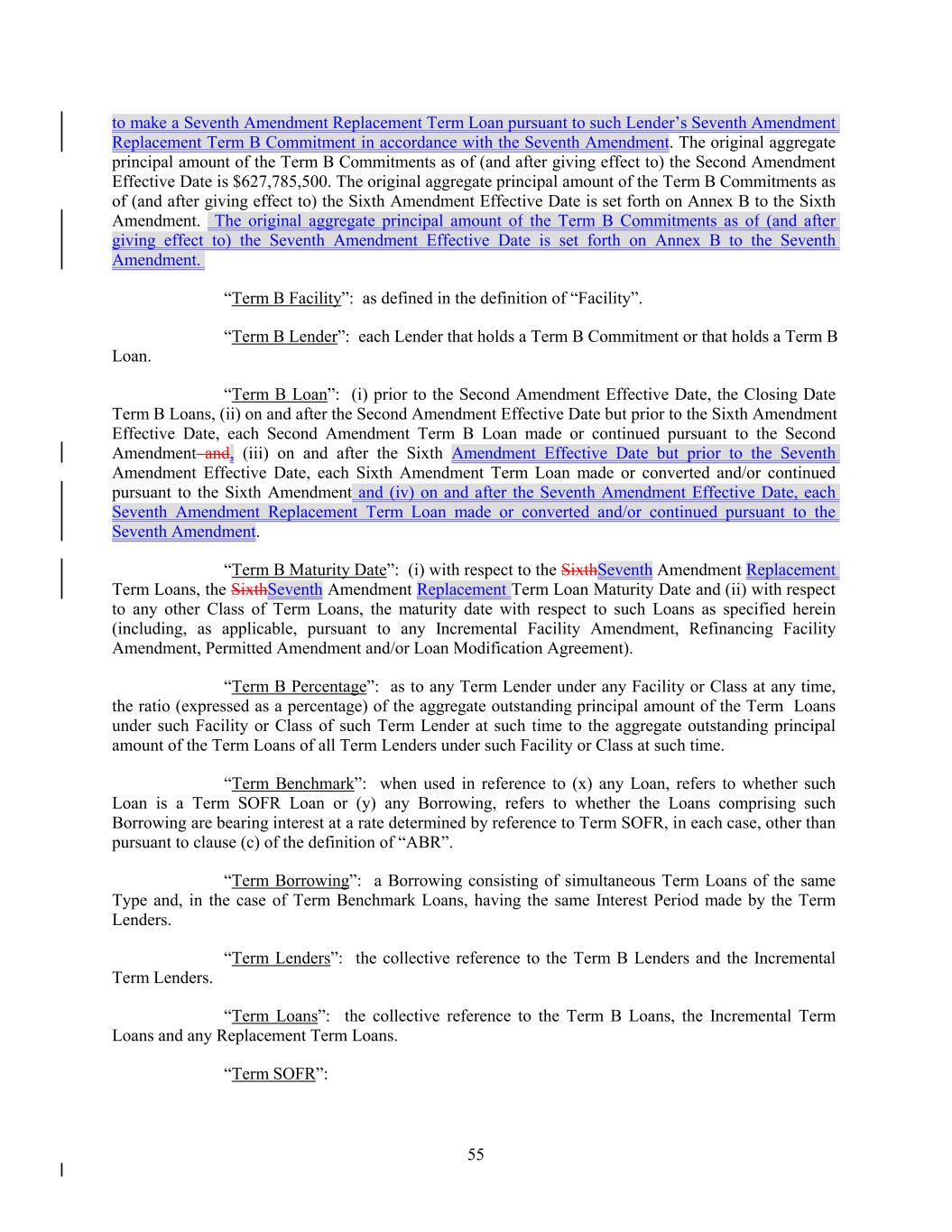 to make a Seventh Amendment Replacement Term Loan pursuant to such Lender’s Seventh Amendment Replacement Term B Commitment in accordance with the Seventh Amendment. The original aggregate principal amount of the Term B Commitments as of (and after giving effect to) the Second Amendment Effective Date is $627,785,500. The original aggregate principal amount of the Term B Commitments as of (and after giving effect to) the Sixth Amendment Effective Date is set forth on Annex B to the Sixth Amendment. The original aggregate principal amount of the Term B Commitments as of (and after giving effect to) the Seventh Amendment Effective Date is set forth on Annex B to the Seventh Amendment. “Term B Facility”: as defined in the definition of “Facility”. “Term B Lender”: each Lender that holds a Term B Commitment or that holds a Term B Loan. “Term B Loan”: (i) prior to the Second Amendment Effective Date, the Closing Date Term B Loans, (ii) on and after the Second Amendment Effective Date but prior to the Sixth Amendment Effective Date, each Second Amendment Term B Loan made or continued pursuant to the Second Amendment and, (iii) on and after the Sixth Amendment Effective Date but prior to the Seventh Amendment Effective Date, each Sixth Amendment Term Loan made or converted and/or continued pursuant to the Sixth Amendment and (iv) on and after the Seventh Amendment Effective Date, each Seventh Amendment Replacement Term Loan made or converted and/or continued pursuant to the Seventh Amendment. “Term B Maturity Date”: (i) with respect to the SixthSeventh Amendment Replacement Term Loans, the SixthSeventh Amendment Replacement Term Loan Maturity Date and (ii) with respect to any other Class of Term Loans, the maturity date with respect to such Loans as specified herein (including, as applicable, pursuant to any Incremental Facility Amendment, Refinancing Facility Amendment, Permitted Amendment and/or Loan Modification Agreement). “Term B Percentage”: as to any Term Lender under any Facility or Class at any time, the ratio (expressed as a percentage) of the aggregate outstanding principal amount of the Term Loans under such Facility or Class of such Term Lender at such time to the aggregate outstanding principal amount of the Term Loans of all Term Lenders under such Facility or Class at such time. “Term Benchmark”: when used in reference to (x) any Loan, refers to whether such Loan is a Term SOFR Loan or (y) any Borrowing, refers to whether the Loans comprising such Borrowing are bearing interest at a rate determined by reference to Term SOFR, in each case, other than pursuant to clause (c) of the definition of “ABR”. “Term Borrowing”: a Borrowing consisting of simultaneous Term Loans of the same Type and, in the case of Term Benchmark Loans, having the same Interest Period made by the Term Lenders. “Term Lenders”: the collective reference to the Term B Lenders and the Incremental Term Lenders. “Term Loans”: the collective reference to the Term B Loans, the Incremental Term Loans and any Replacement Term Loans. “Term SOFR”: 55